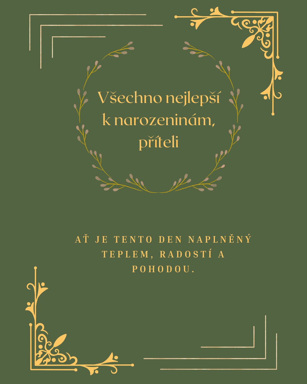 K Tvým narozeninám Ti neposílám jen obyčejné přání, ale i kus svého srdce. Přeji Ti dny plné klidu, úsměvů, zdraví a štěstí, které budeš cítit v každém malém i velkém okamžiku. Ať Tě život překvapuje hlavně tím dobrým a ať se Ti splní vše, po čem opravdu toužíš. S Tebou má i obyčejný den zvláštní kouzlo.