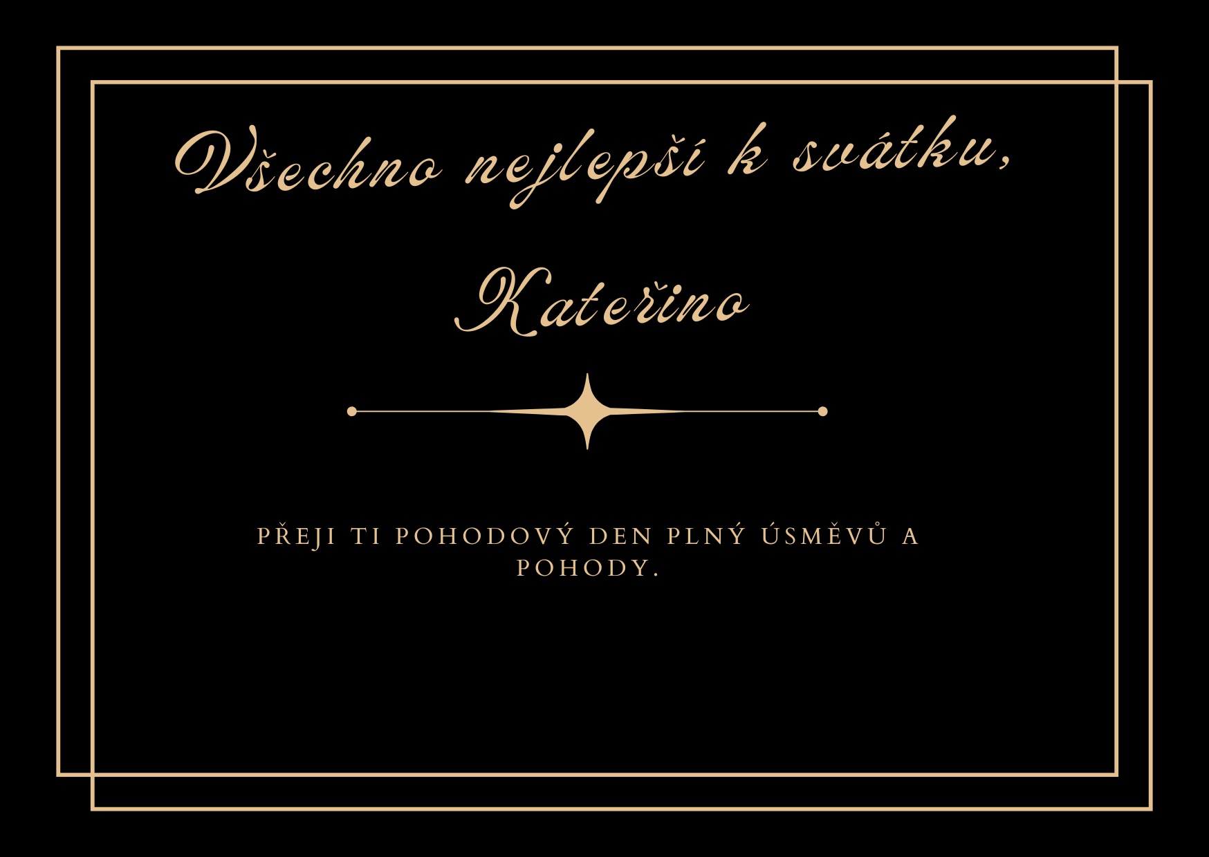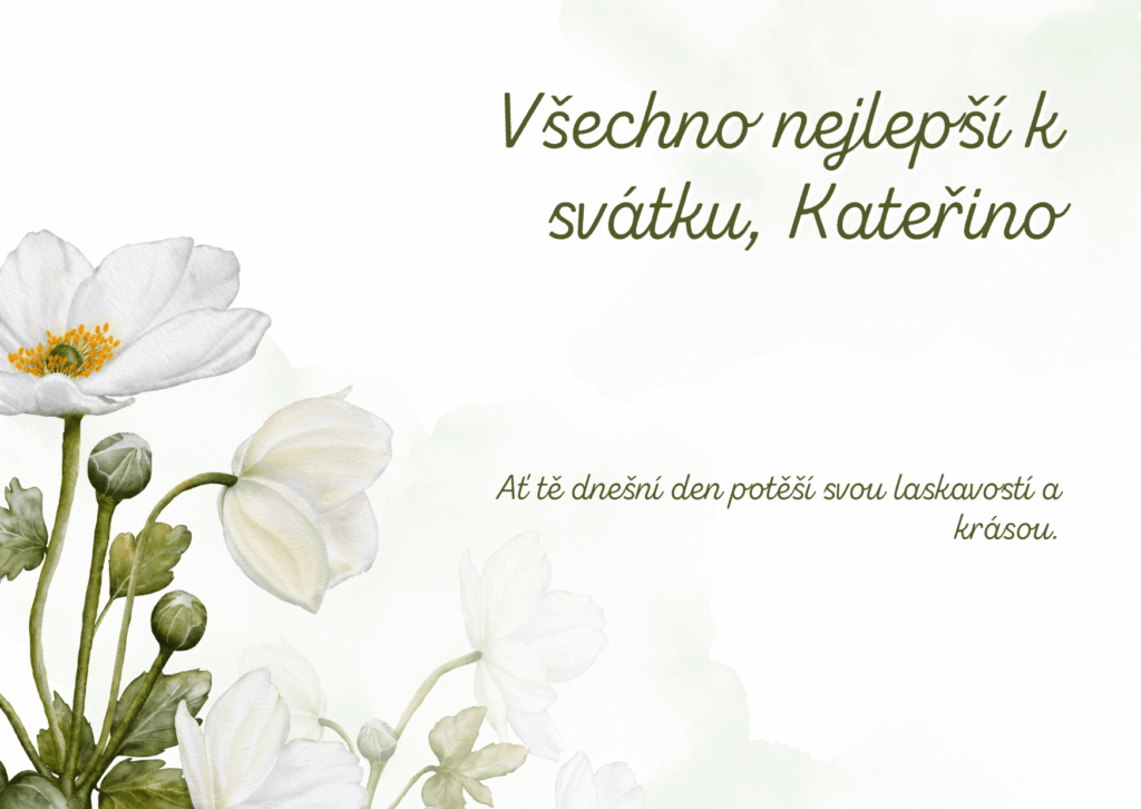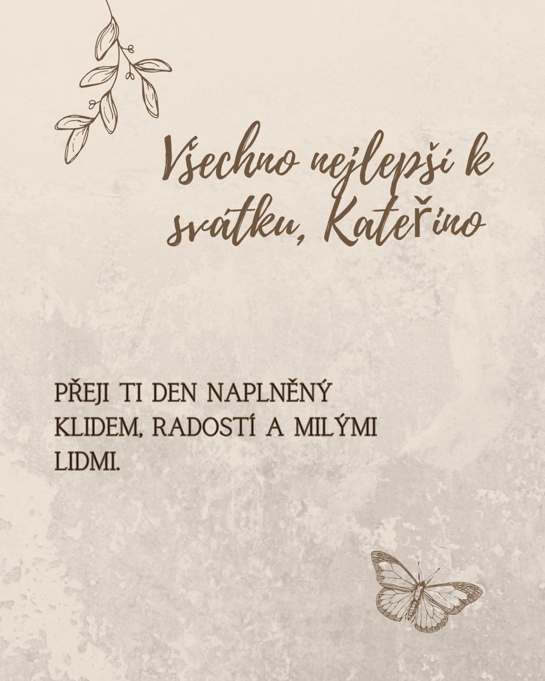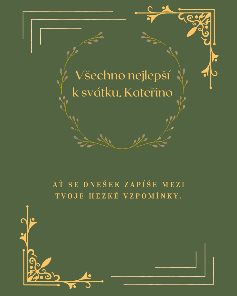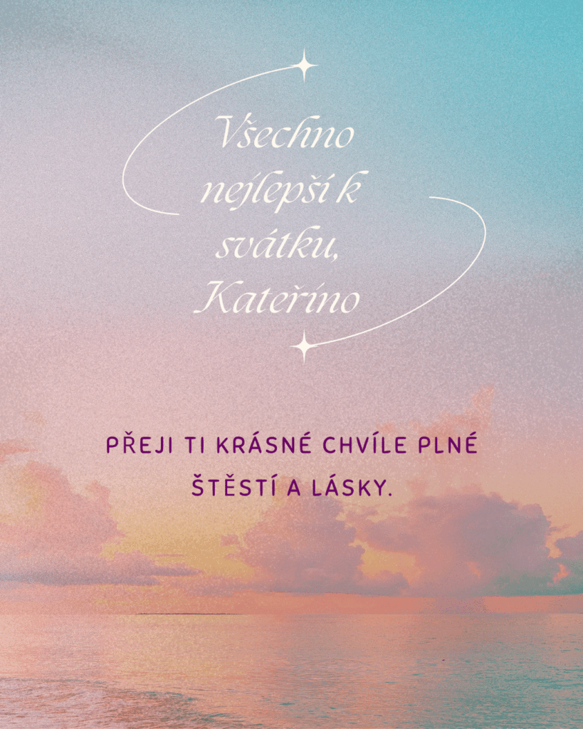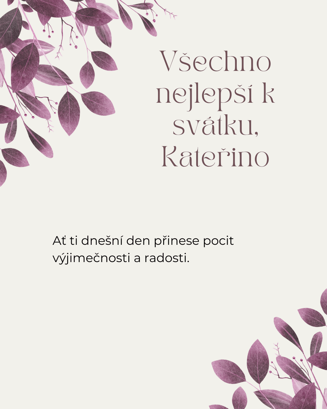 Kateřino, z celého srdce ti přeji krásný sváteční den, ve kterém nebude chybět úsměv, pohoda ani milá slova. Ať se ti dnes vyhýbají starosti a naopak tě provází vše, co dělá život příjemnějším a lehčím. Měj kolem sebe lidi, kteří tě podporují, a chvíle, na které budeš ráda vzpomínat.