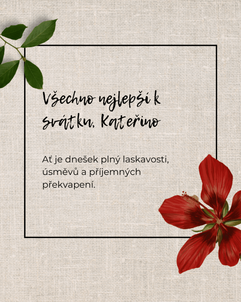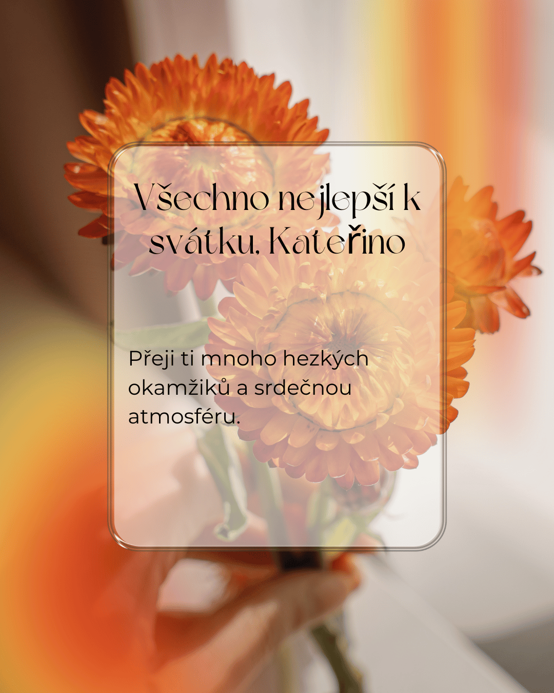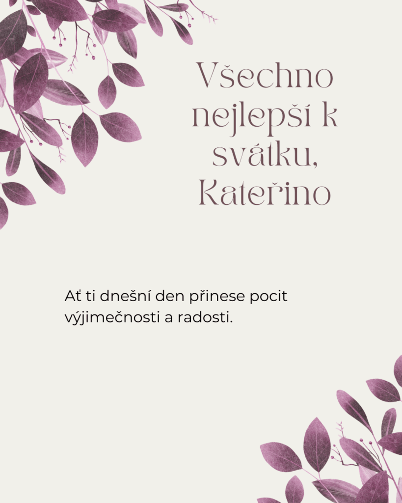 Milá Kateřino, ke svátku ti nepřeji jen obyčejné blahopřání, ale hlavně spoustu nádherných chvil, které ti zůstanou v paměti. Ať se dnešní den nese v duchu pohody, milých setkání a úsměvů, které přicházejí zcela přirozeně, když je člověku dobře.