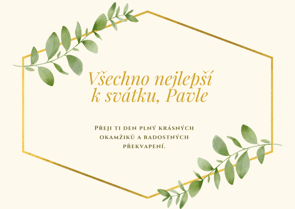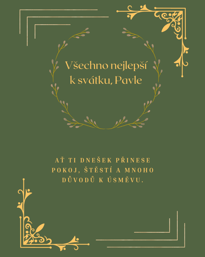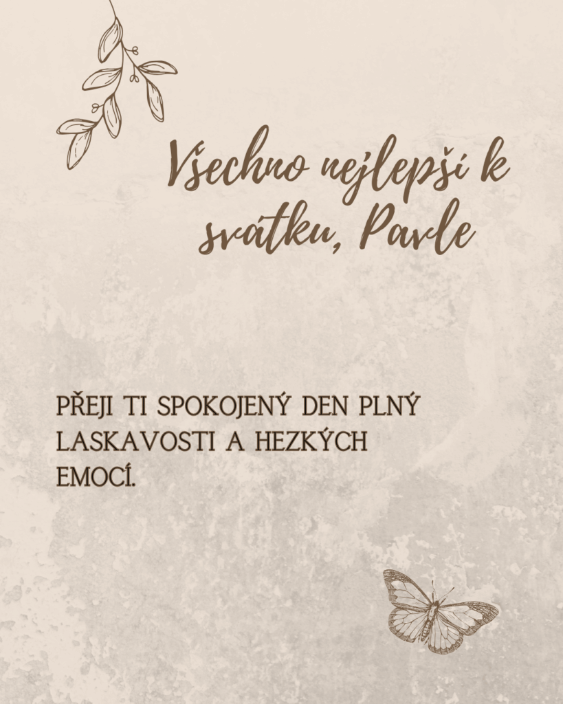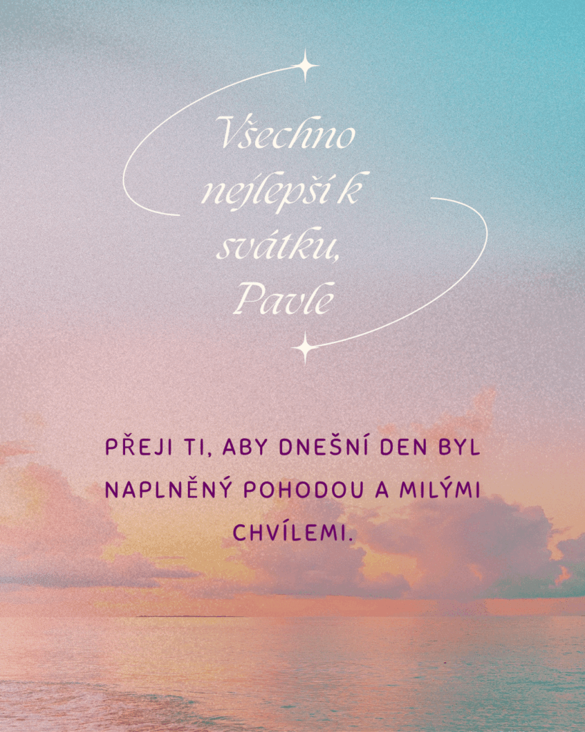 Pavle, k tvému svátku ti přeji mnoho krásných okamžiků, které naplní dnešní den světlem a radostí. Ať se ti dostane milých přání, příjemných slov i hezkých chvil s těmi, které máš rád. Ať tě dnešní den pohladí po duši a přinese pocit, že je všechno přesně tak, jak má být, a že kolem sebe máš opravdové dobro.