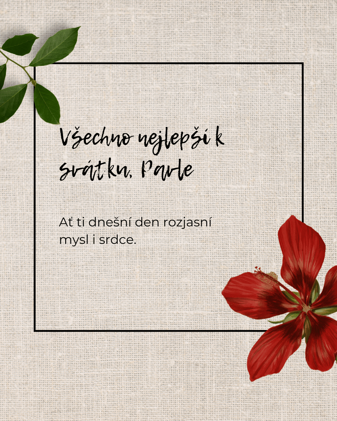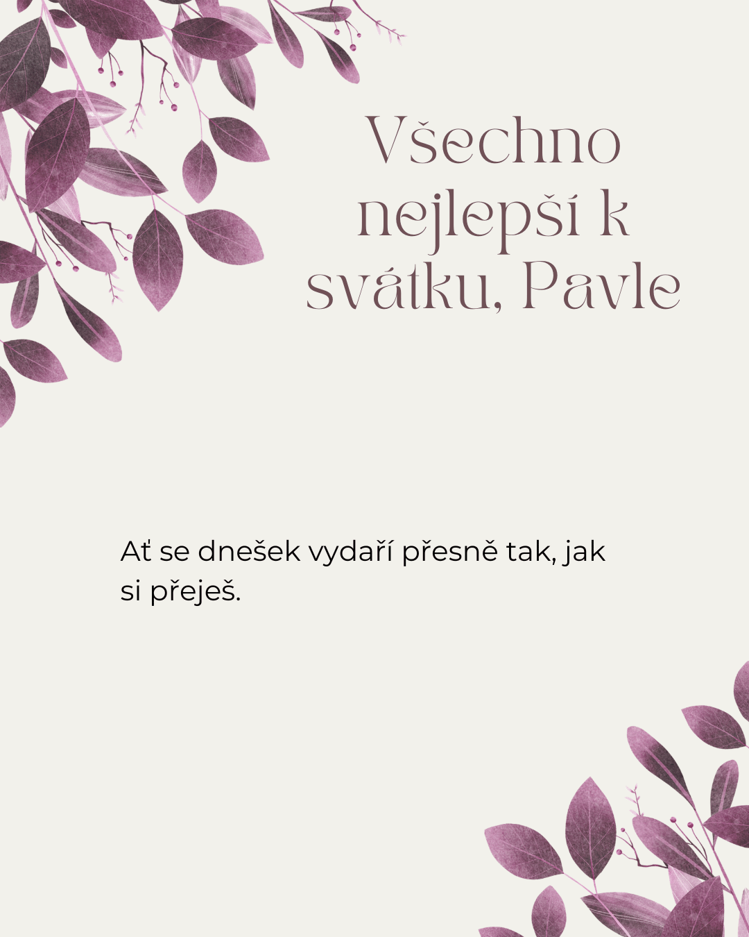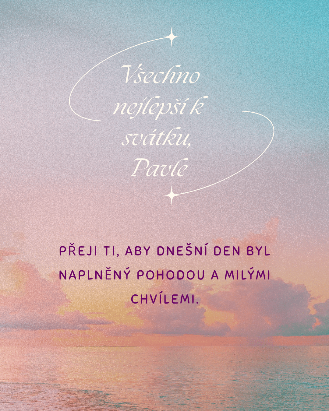 Pavle, k tvému svátku ti přeji mnoho krásných okamžiků, které naplní dnešní den světlem a radostí. Ať se ti dostane milých přání, příjemných slov i hezkých chvil s těmi, které máš rád. Ať tě dnešní den pohladí po duši a přinese pocit, že je všechno přesně tak, jak má být, a že kolem sebe máš opravdové dobro.