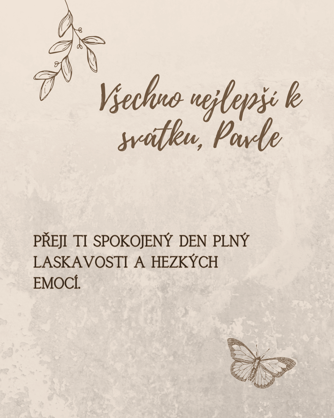 Pavle, z celého srdce ti přeji krásný sváteční den, ve kterém nebude chybět úsměv, klid ani lidé, kteří tě dokážou rozesmát a potěšit. Ať se ti dnes vyhýbají starosti a naopak tě provází všechno, co dělá život lehčím, příjemnějším a radostnějším. Měj kolem sebe pohodu, porozumění a dostatek krásných chvil, které ti zpříjemní celý den.
