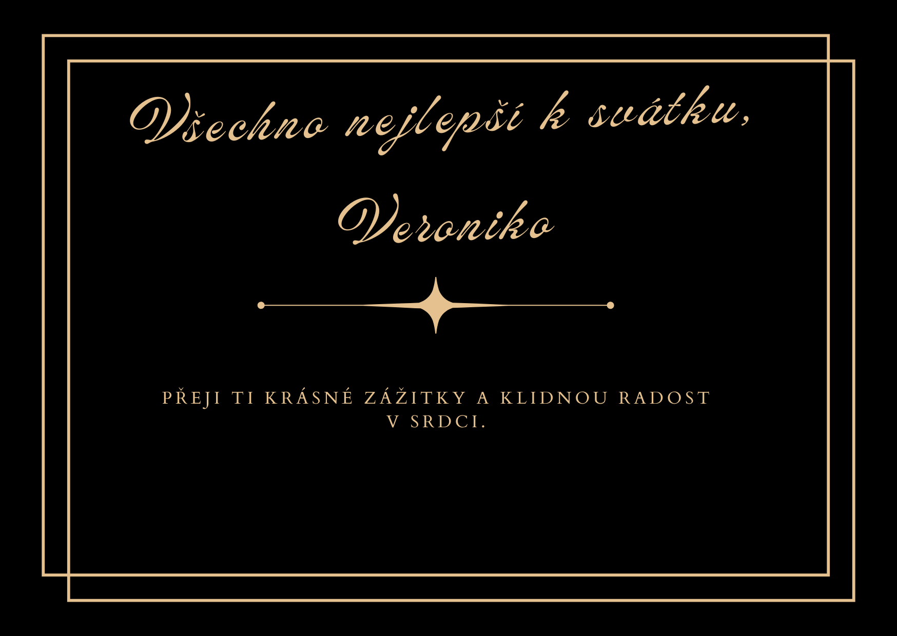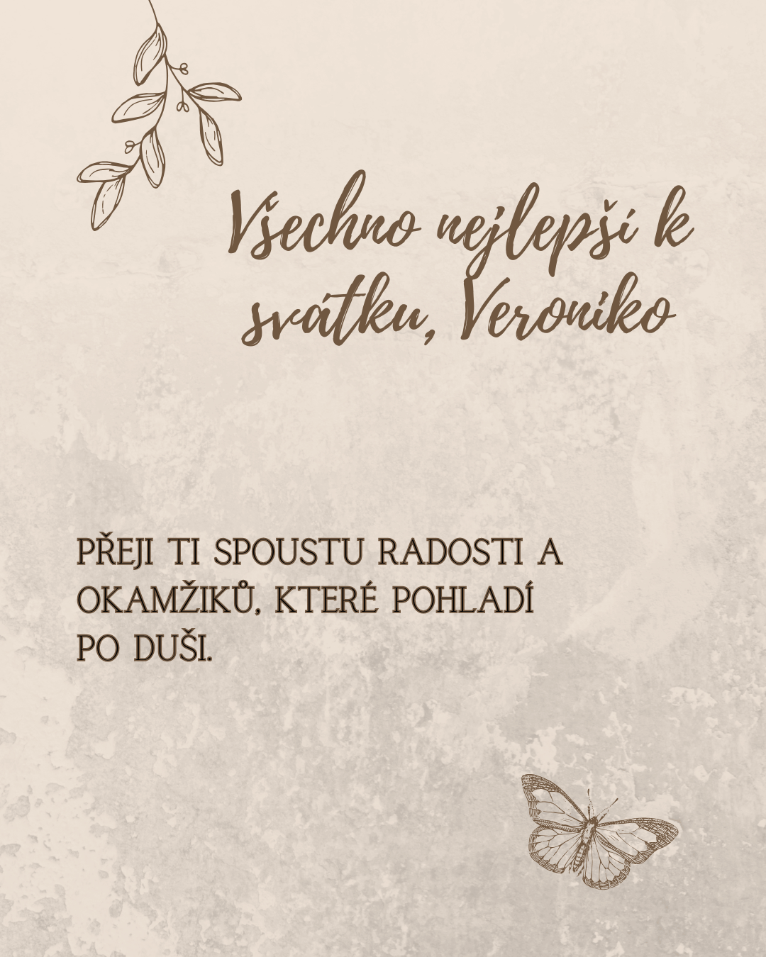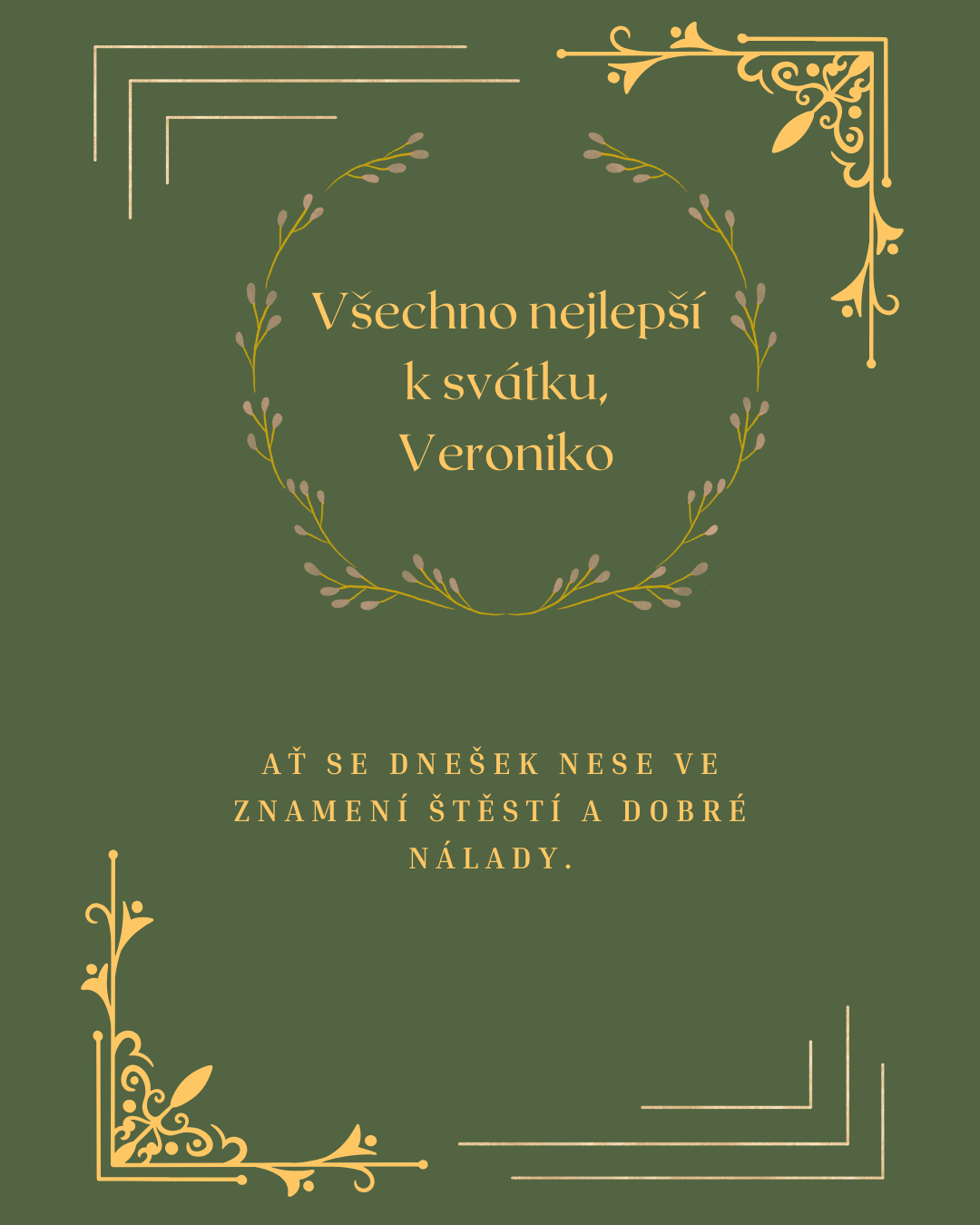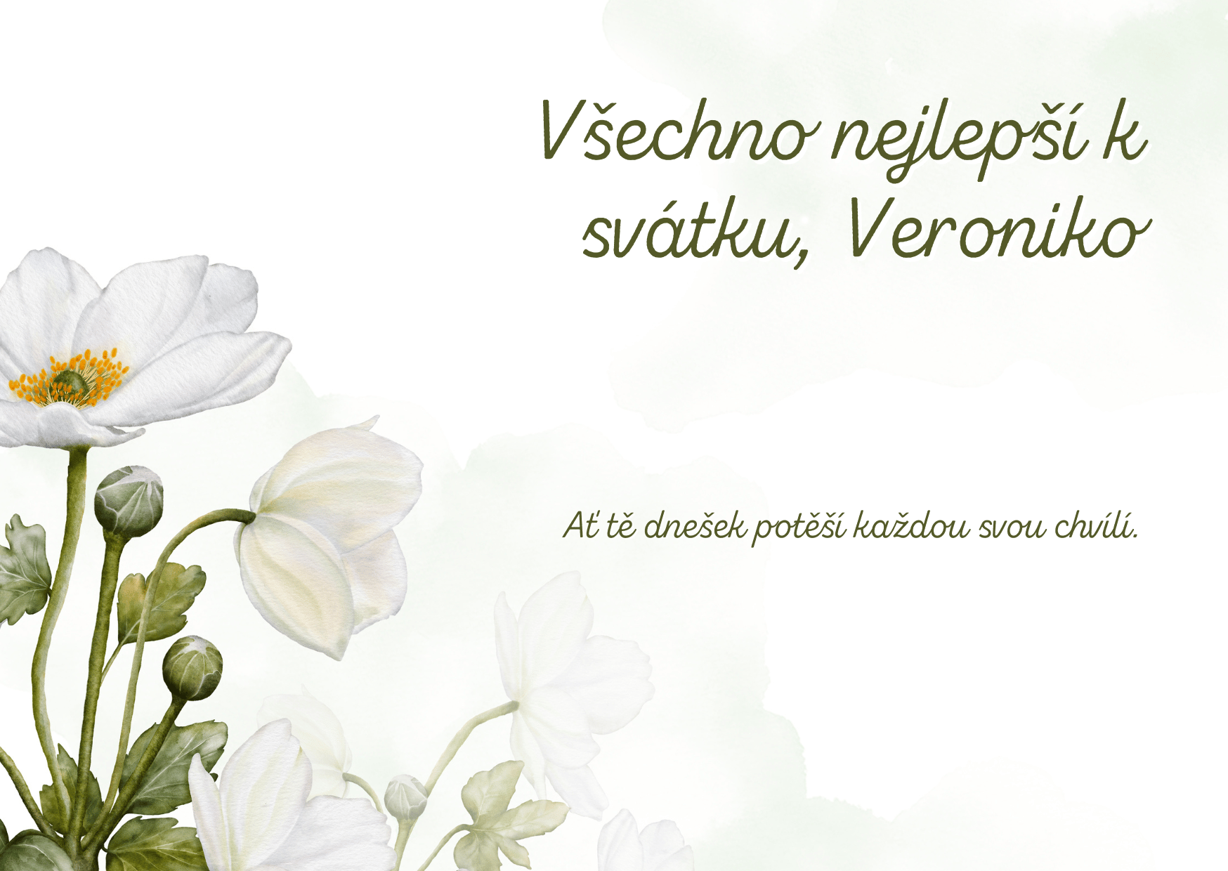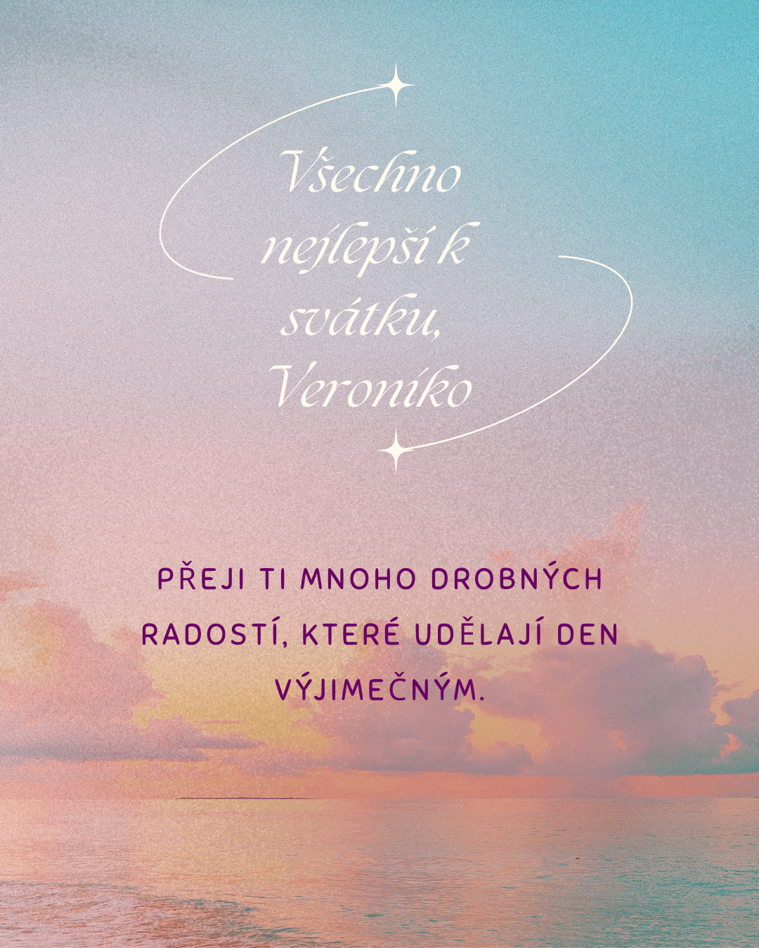 Veroniko, z celého srdce ti přeji krásný sváteční den, ve kterém nebude chybět úsměv, klid ani lidé, kteří tě dokážou rozesmát a potěšit. Ať se ti dnes vyhýbají starosti a naopak tě provází všechno, co dělá život lehčím, příjemnějším a radostnějším. Měj kolem sebe pohodu, porozumění a dostatek krásných chvil, které ti zpříjemní celý den.
