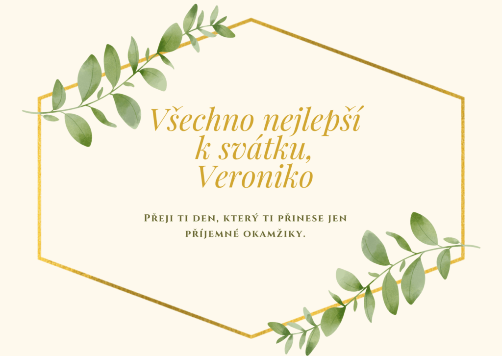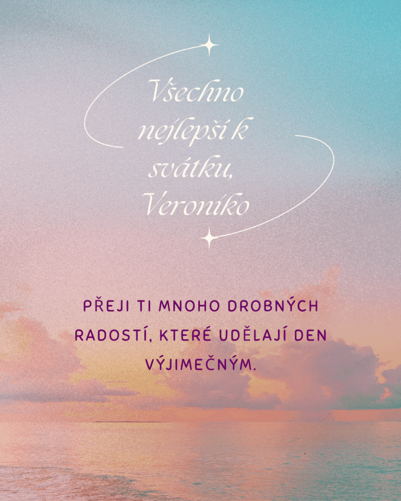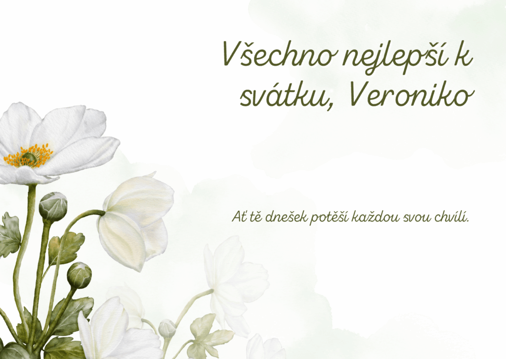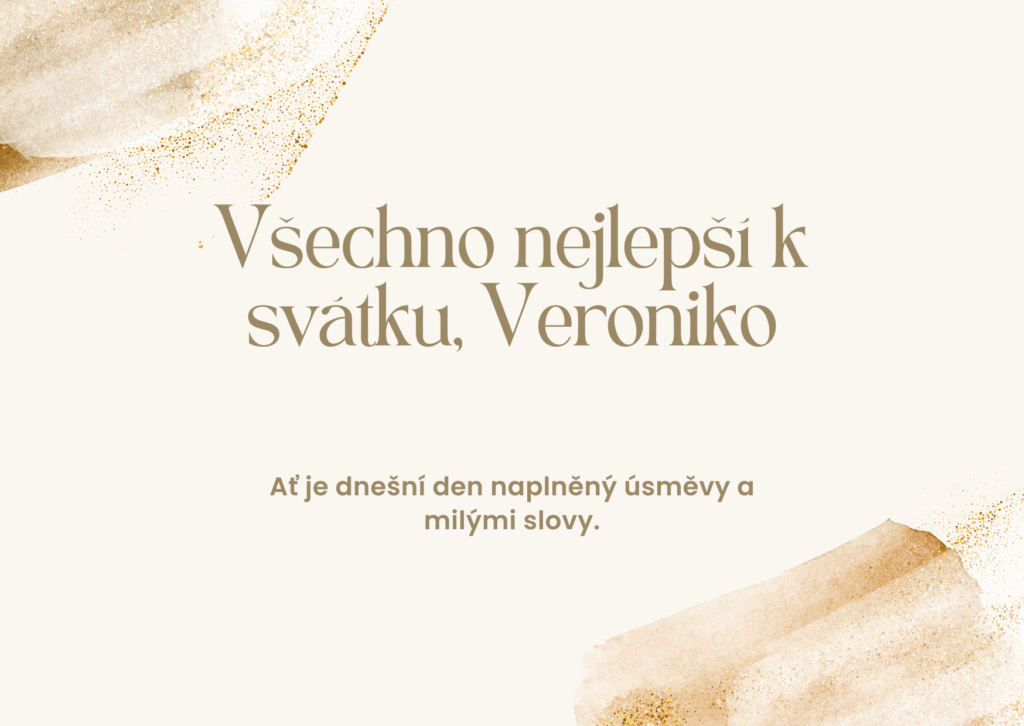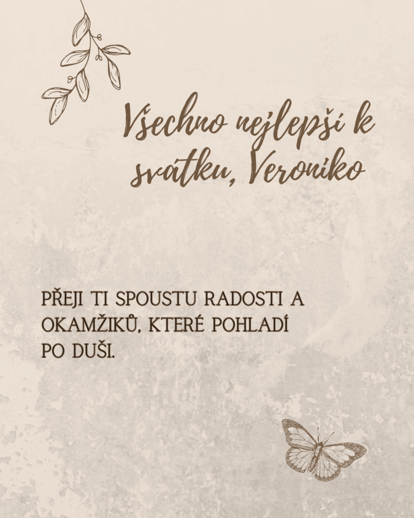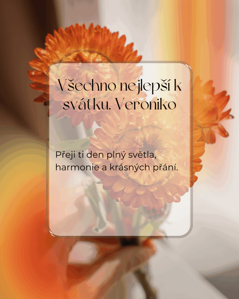 Veroniko, k tvému svátku ti přeji mnoho krásných okamžiků, které naplní dnešní den světlem a radostí. Ať se ti dostane milých přání, příjemných slov i hezkých chvil s těmi, které máš ráda. Ať tě dnešní den pohladí po duši a přinese pocit, že je všechno přesně tak, jak má být, a že kolem sebe máš opravdové dobro.