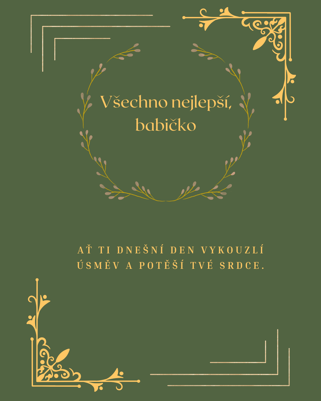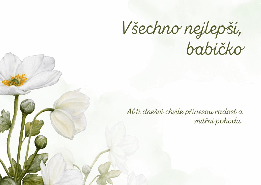 Milá babičko, k Tvým narozeninám Ti přeji hlavně pevné zdraví, klid v srdci a mnoho krásných dnů plných pohody. Ať Tě každý nový den těší drobnými radostmi, milými návštěvami a chvílemi, které Ti vykouzlí úsměv na tváři. Jsi pro naši rodinu velikým darem a Tvá laskavost, moudrost i dobrota dělají každý společný okamžik ještě vzácnějším a krásnějším.