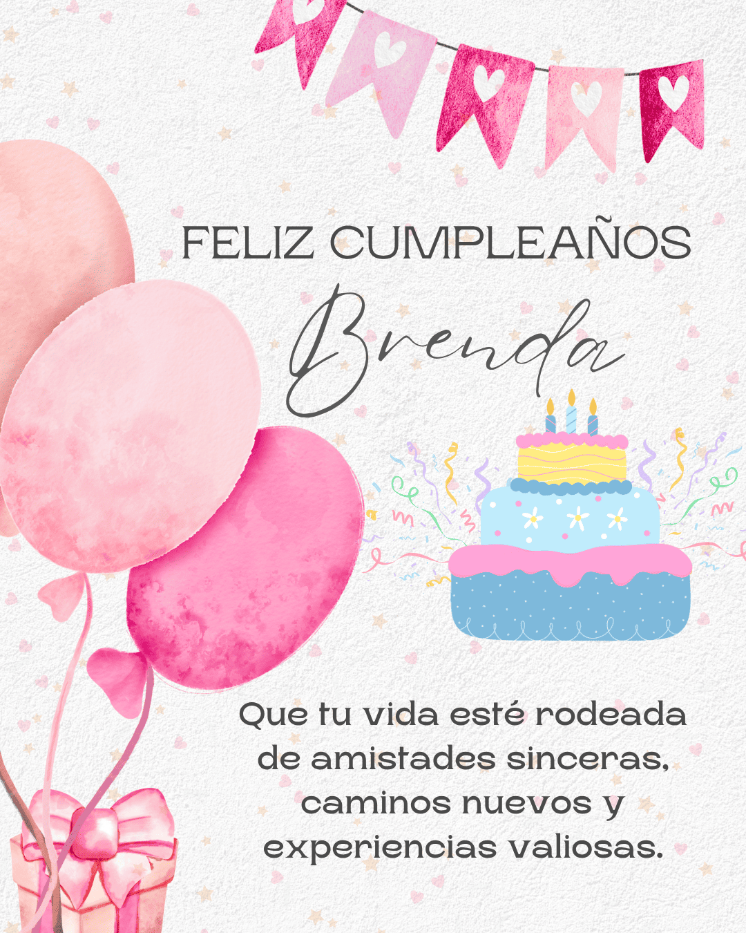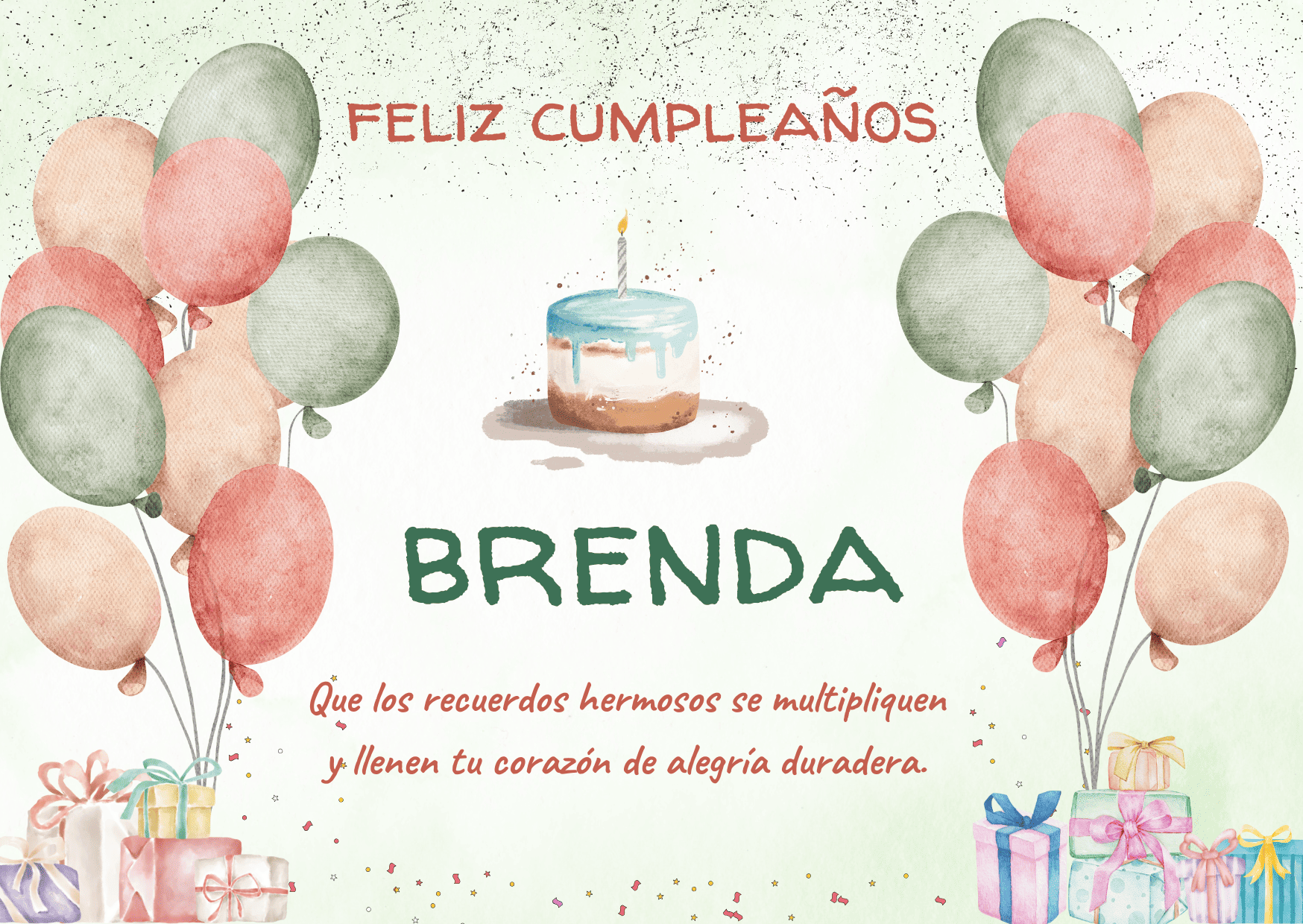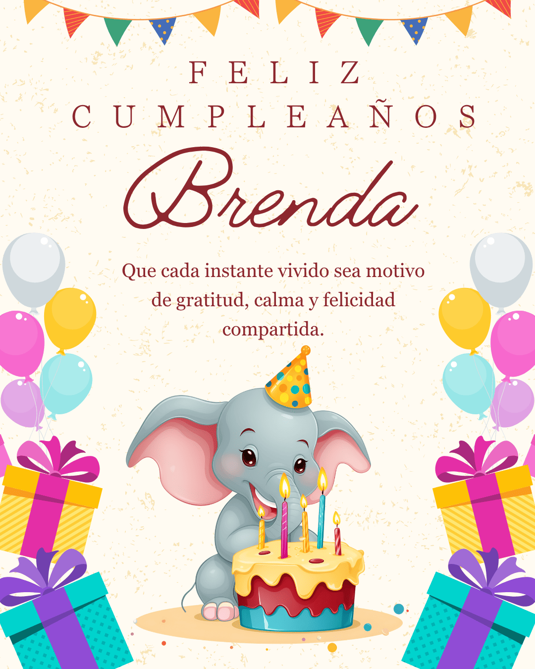 Feliz cumpleaños Brenda. Hoy celebramos tu vida, tu alegría y todo lo que te hace una persona única. Que este nuevo año te regale momentos llenos de amor, sonrisas sinceras y sueños cumplidos.