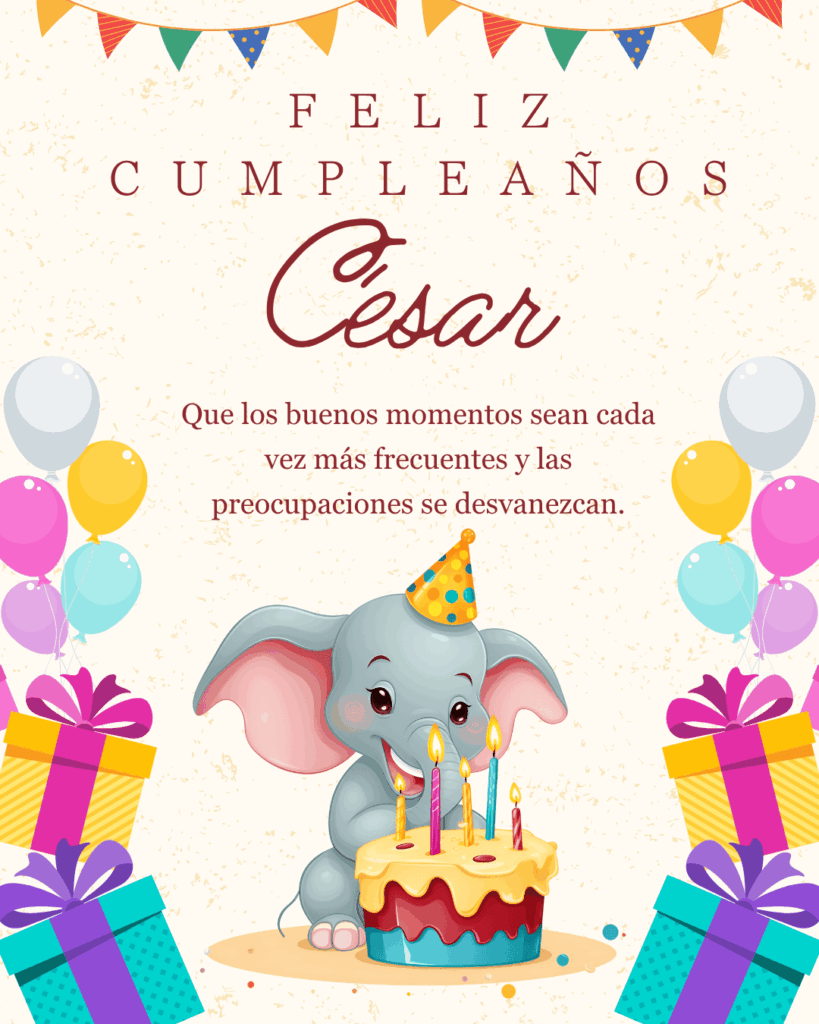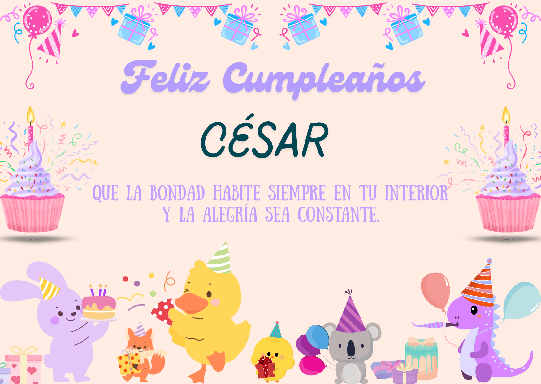 Feliz cumpleaños César. Hoy es el día perfecto para celebrar todo lo que eres: una persona amable, divertida y llena de energía. Que este nuevo año te traiga éxitos, amor y momentos inolvidables.