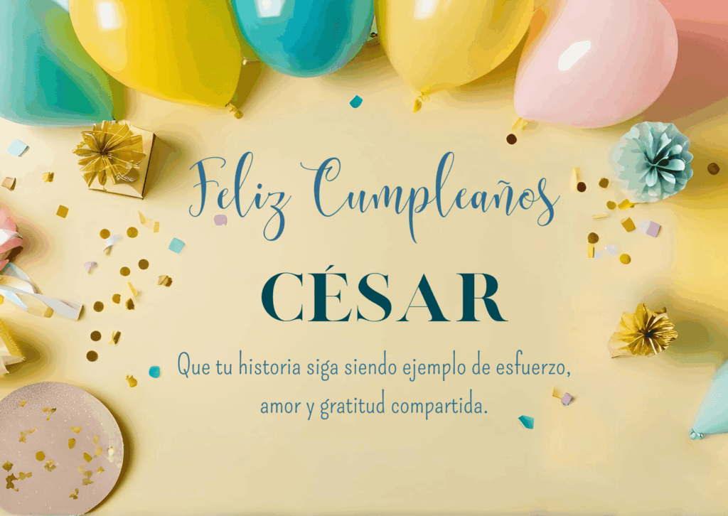 Feliz cumpleaños César. Hoy celebramos tu vida, tus logros y todo lo que representas para quienes te rodean. Que este día esté lleno de risas, abrazos sinceros y buenos momentos.
