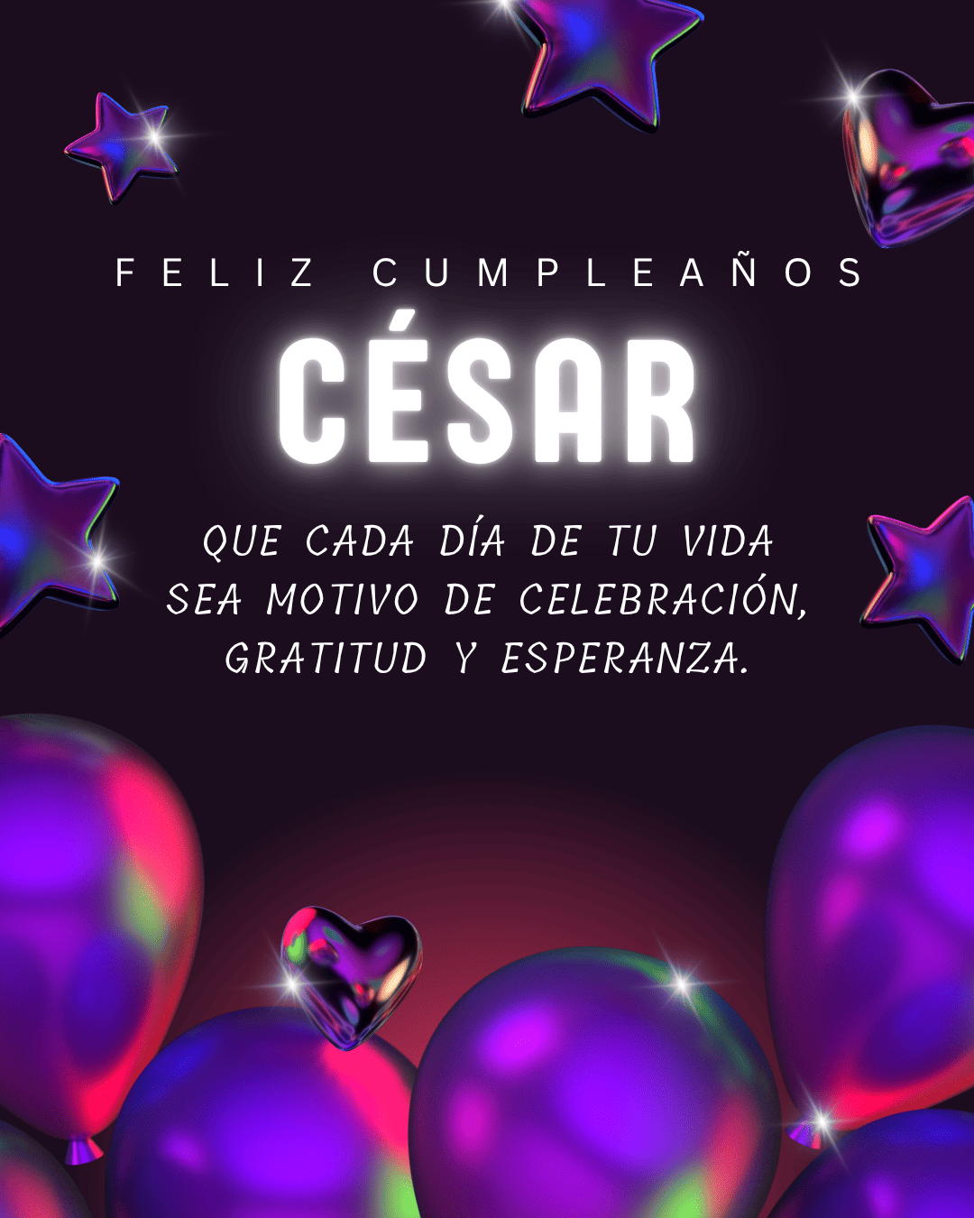 Feliz cumpleaños César. Que los días venideros estén llenos de amor, salud y prosperidad. Hoy es el momento de dejar atrás lo viejo y abrir las puertas a nuevas oportunidades.