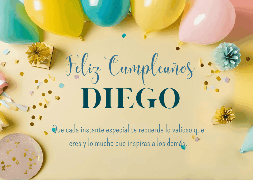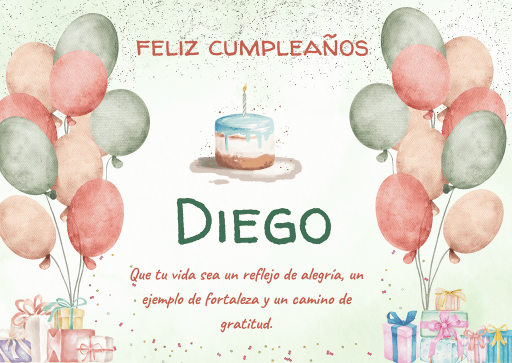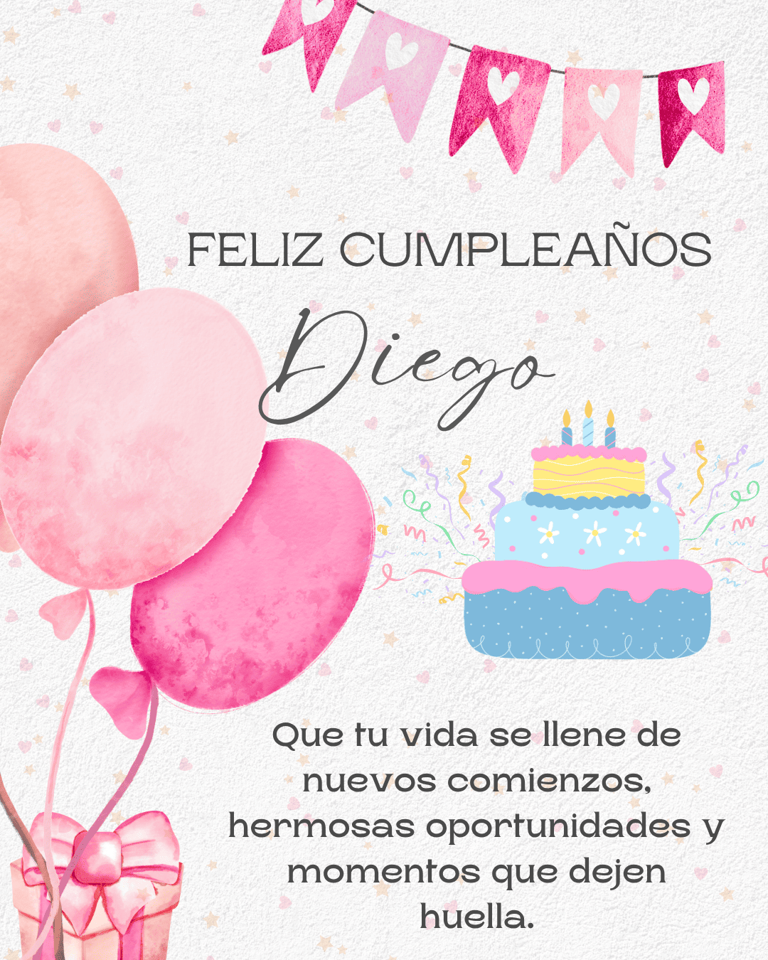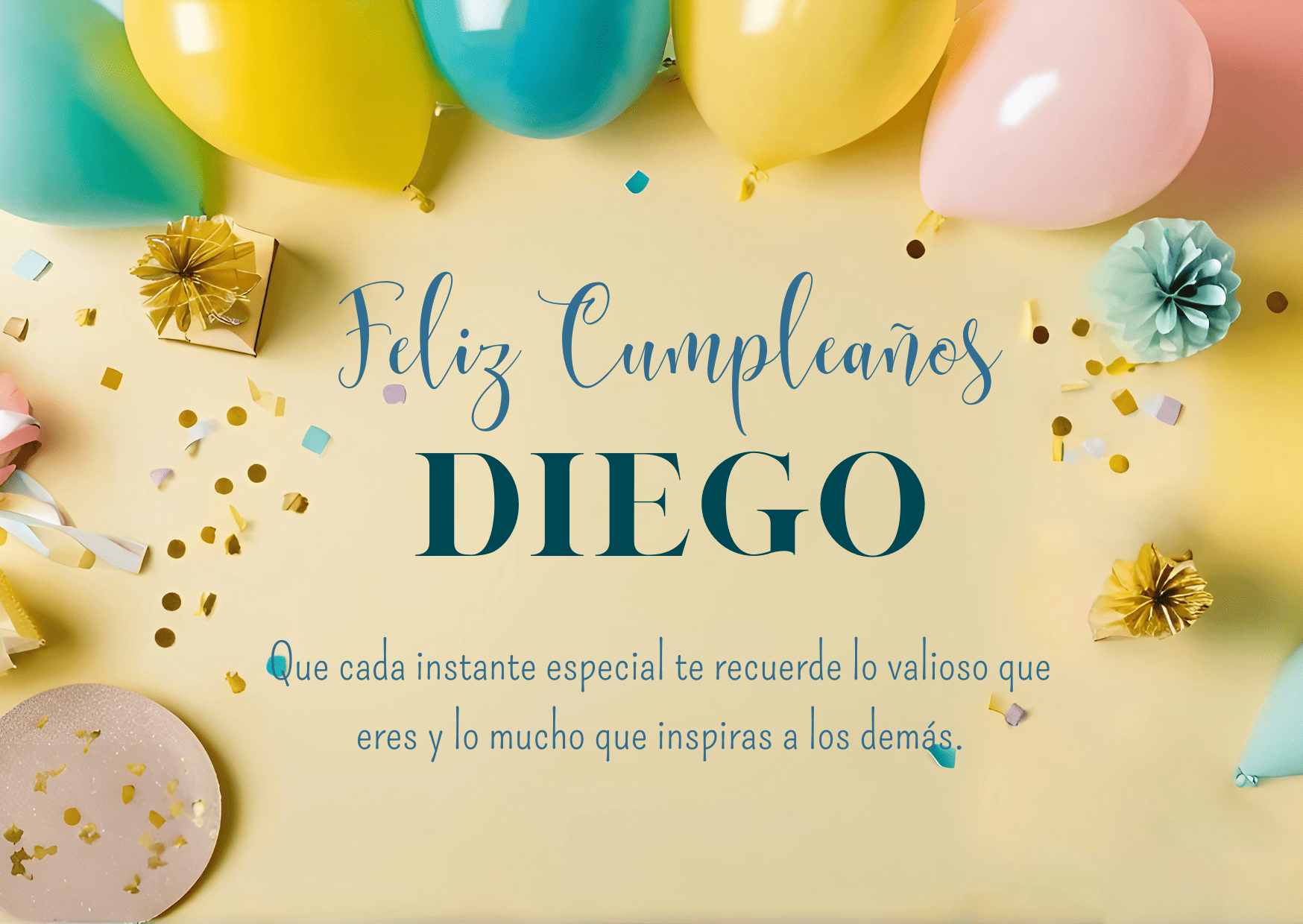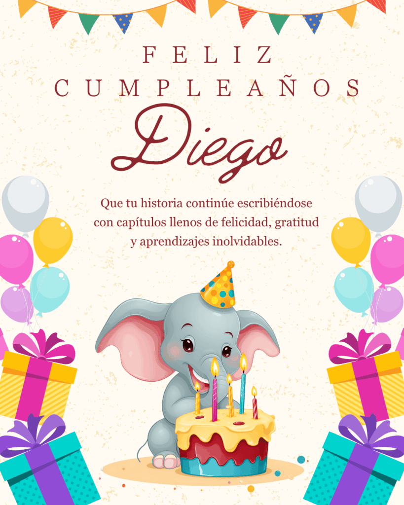Feliz cumpleaños Diego. Cada año trae nuevas oportunidades para soñar, crecer y disfrutar de la vida. Que este sea uno lleno de amor, risas y momentos que valgan la pena recordar.