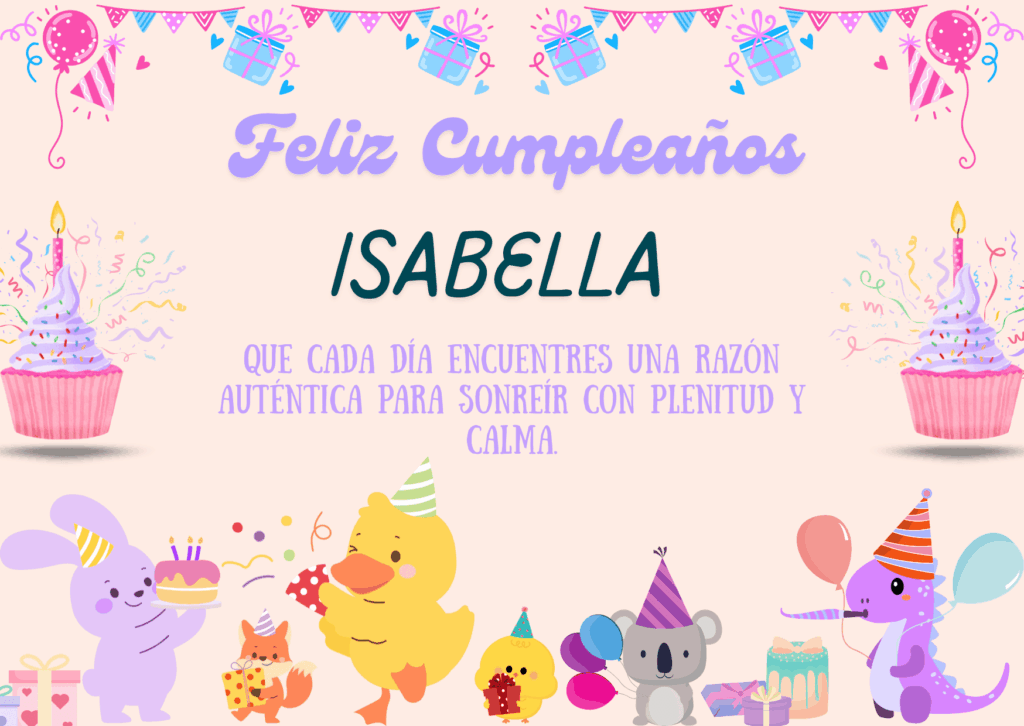 Dedicar un mensaje de feliz cumpleaños Isabella con palabras bonitas y bien elegidas puede convertir este día en un recuerdo inolvidable. En esta selección encontrarás frases largas, emotivas y variadas, pensadas para acompañar imágenes listas para descargar y compartir. Son ideales para enviar por WhatsApp, publicar en redes sociales o dedicar en una tarjeta personalizada. Cada mensaje está escrito con cercanía y sensibilidad, para que puedas elegir el que mejor refleje tus sentimientos y hacer que Isabella se sienta verdaderamente especial en su cumpleaños.