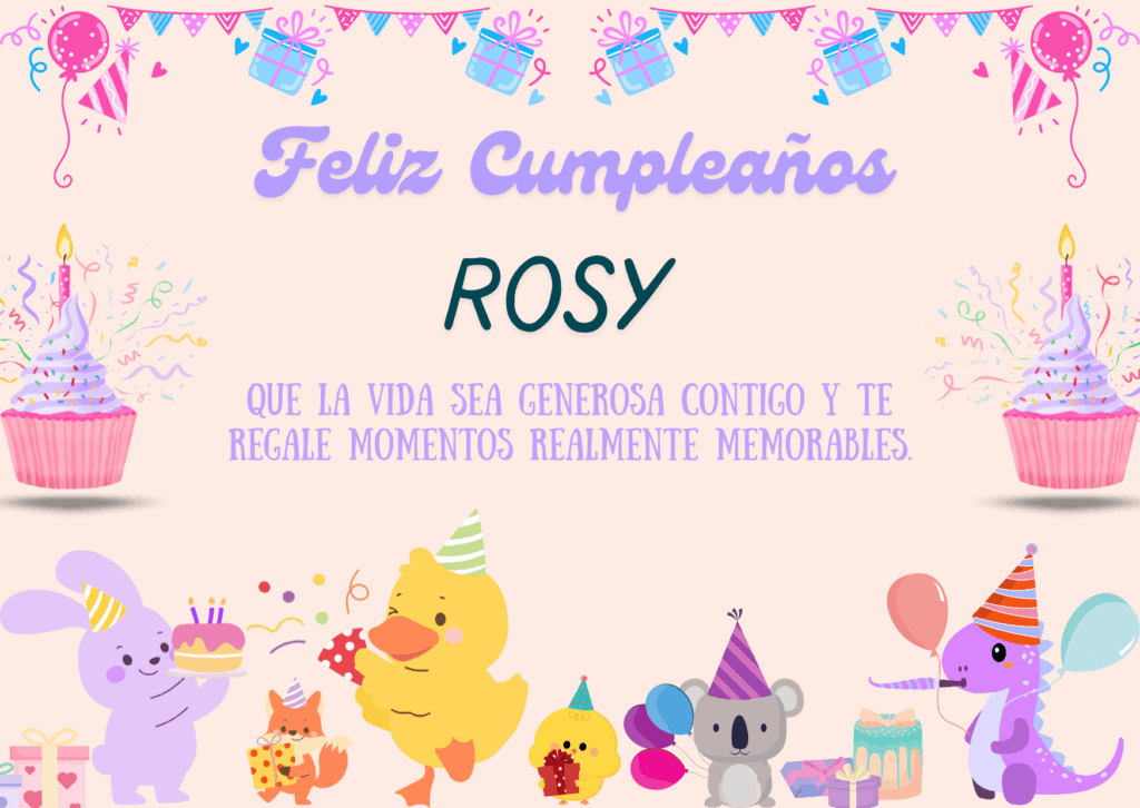 Hoy celebramos a alguien muy especial, Rosy. Que este feliz cumpleaños Rosy esté lleno de momentos bonitos, sonrisas sinceras y abrazos que reconforten el corazón.