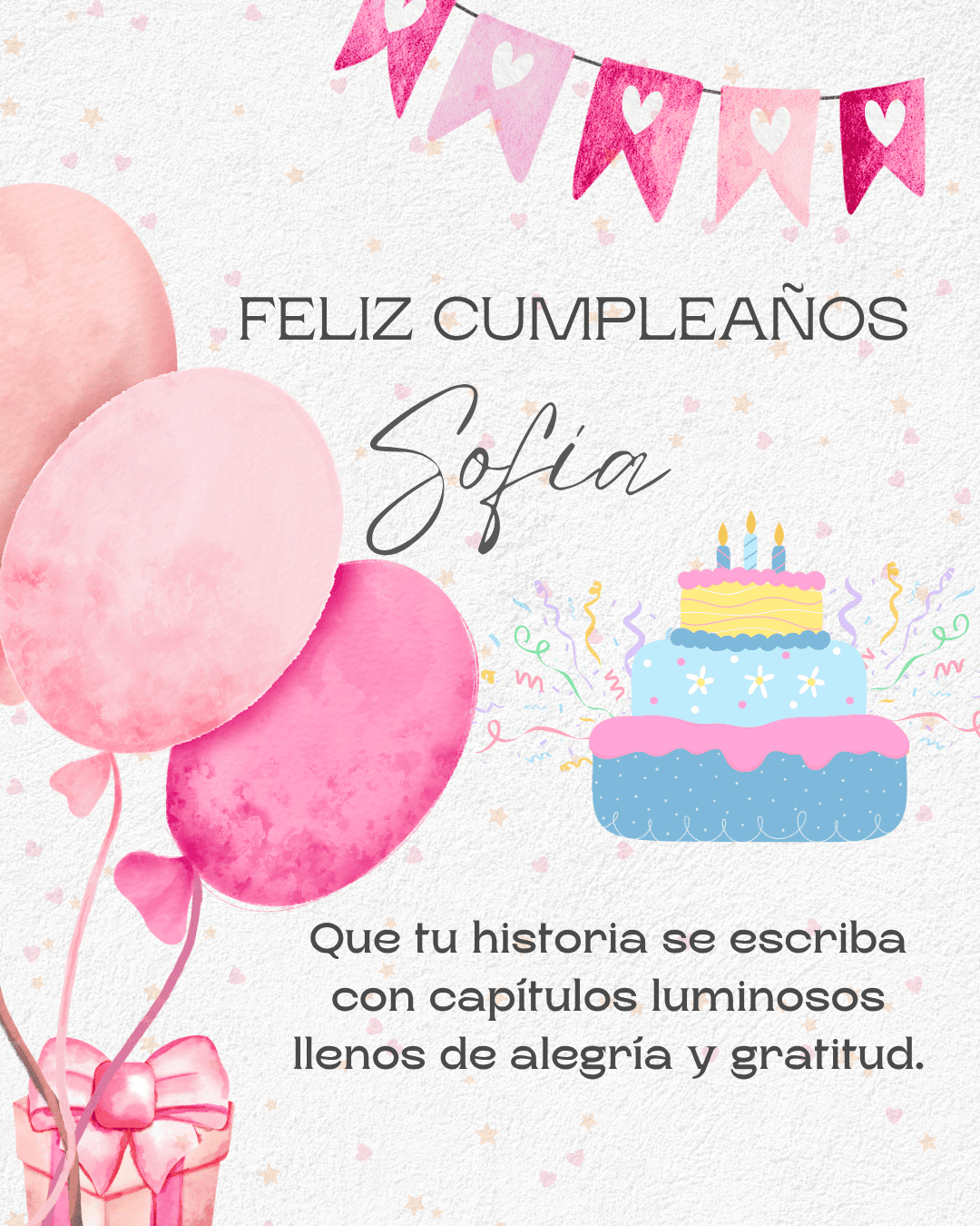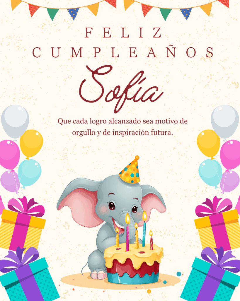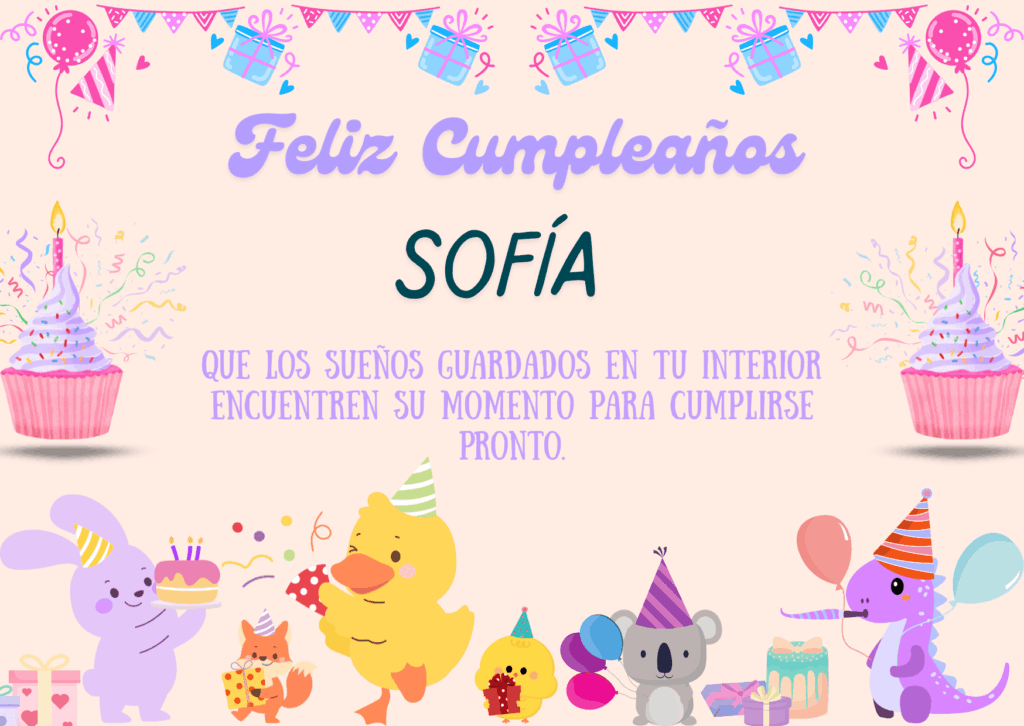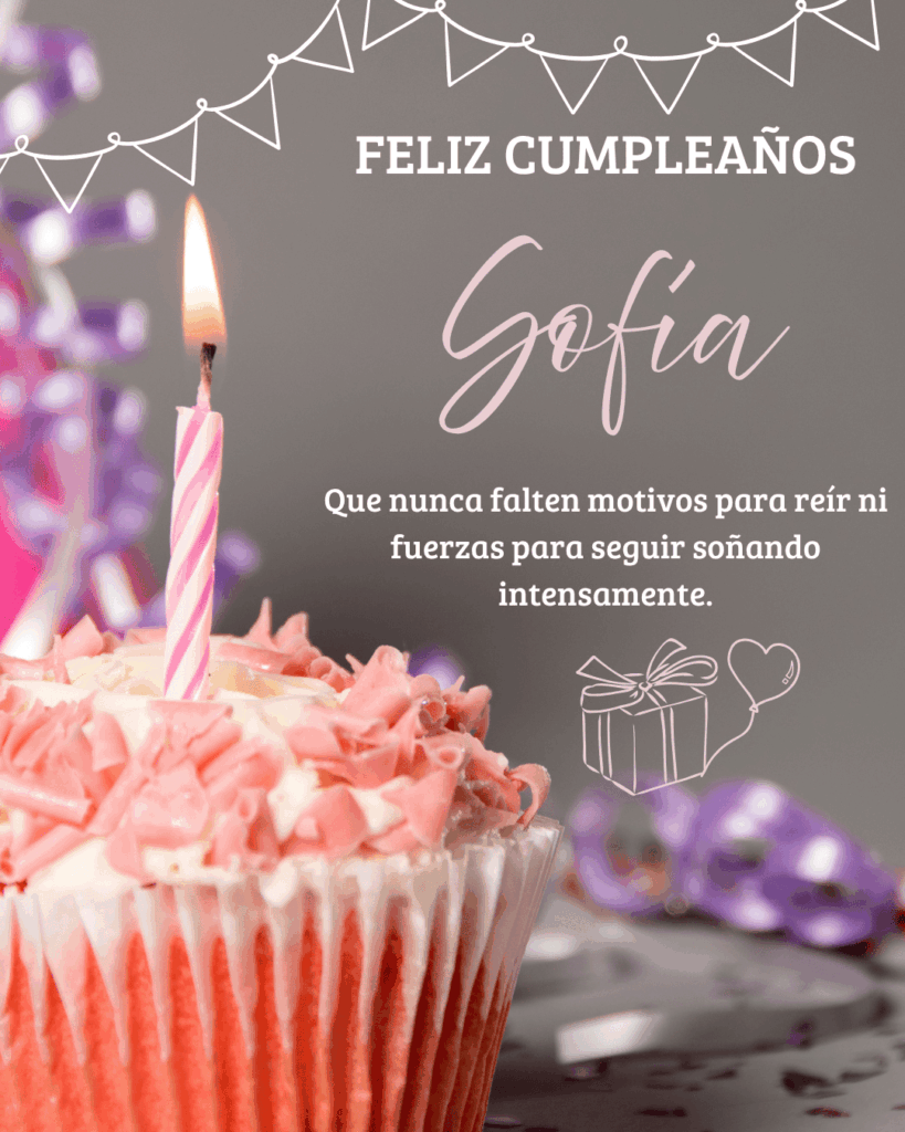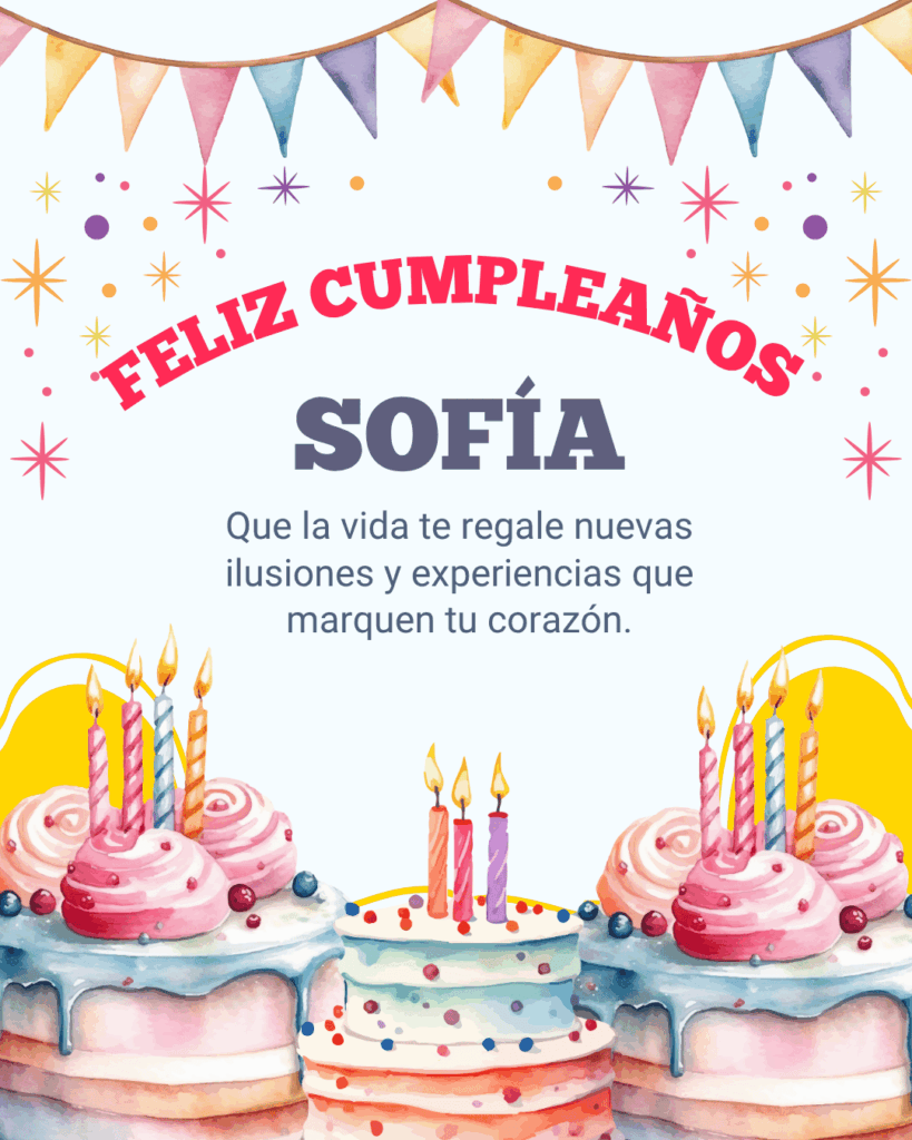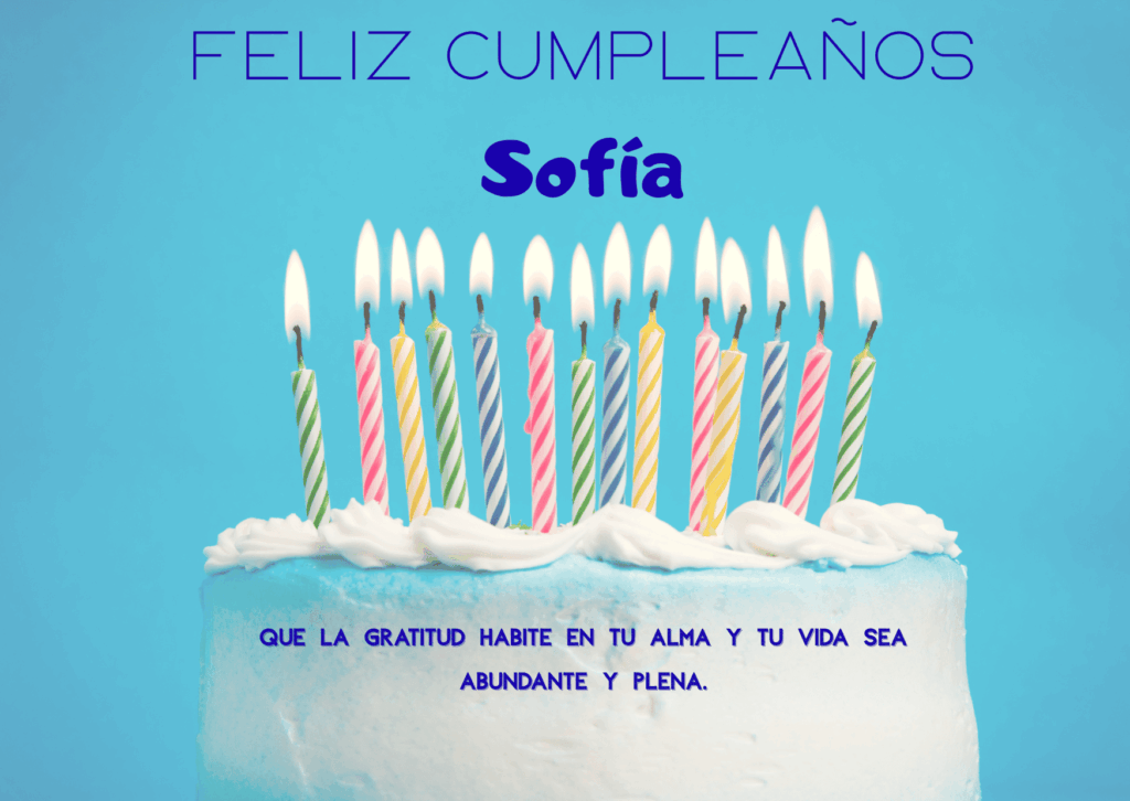Feliz cumpleaños Sofía. Hoy es el momento perfecto para celebrar tu vida, tus sueños y tus logros. Que este nuevo año te llene de fuerza y nuevas ilusiones.