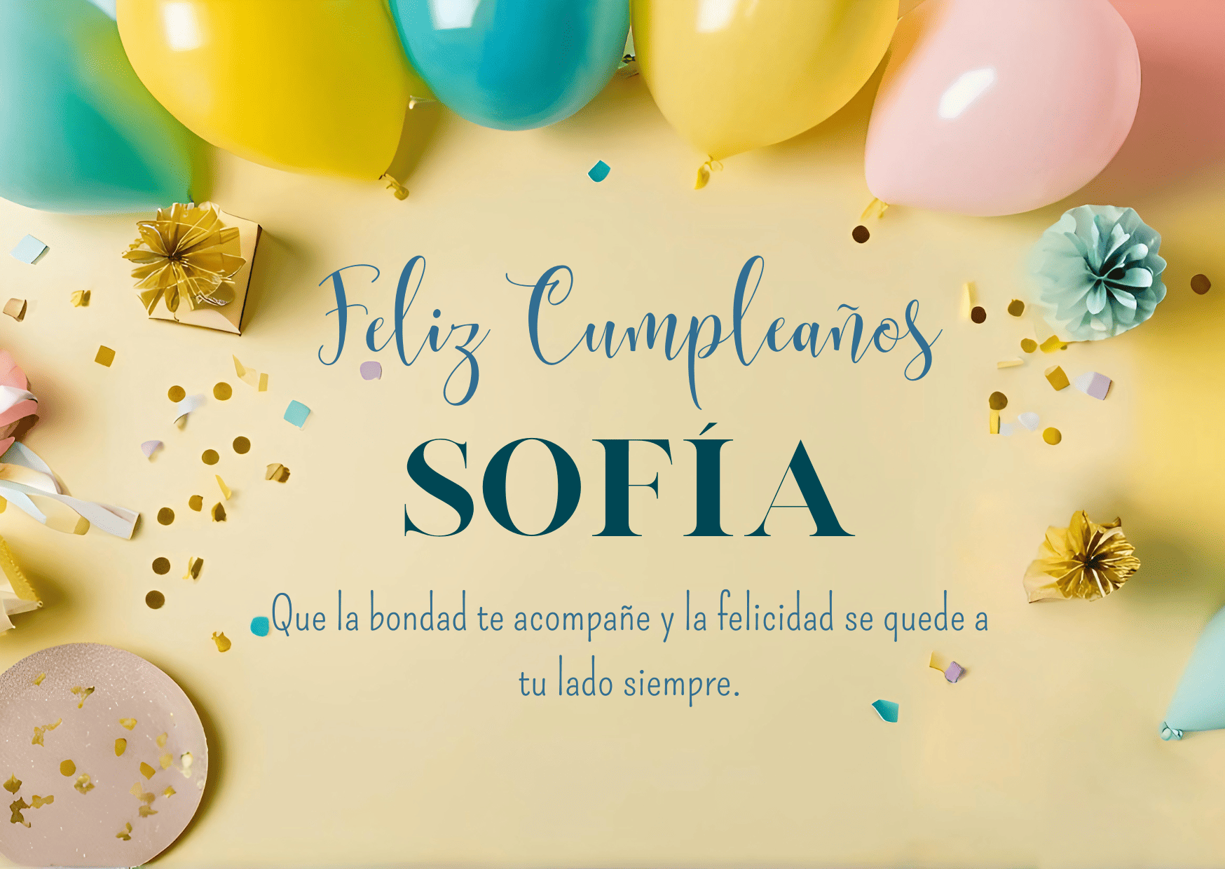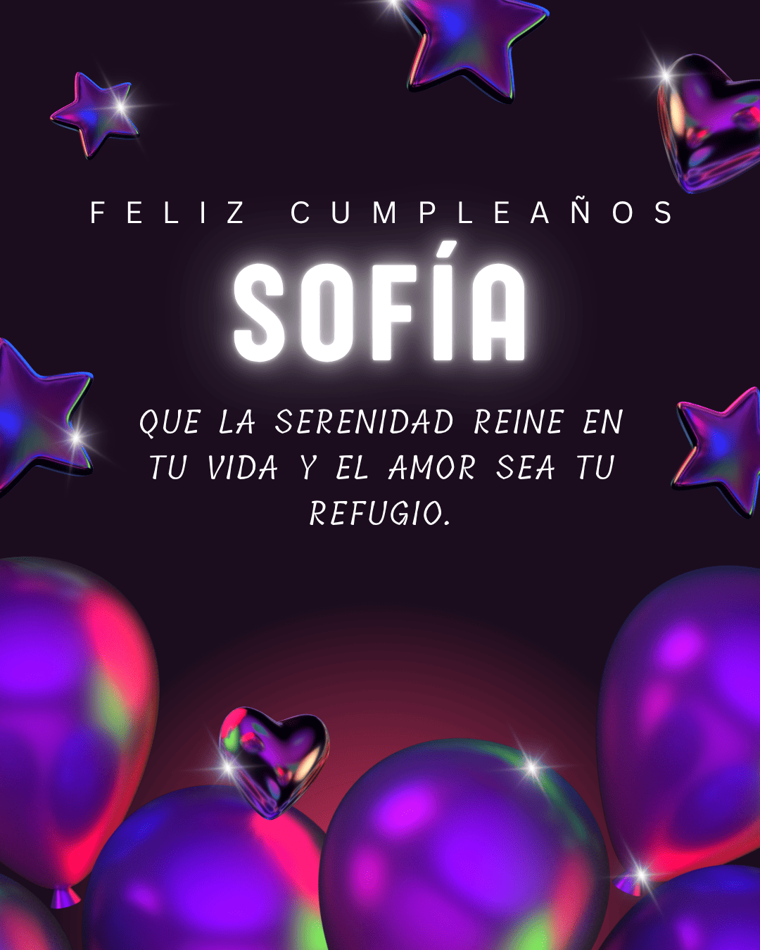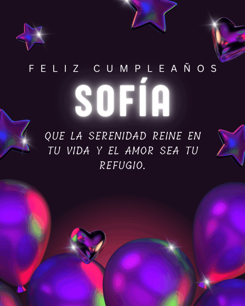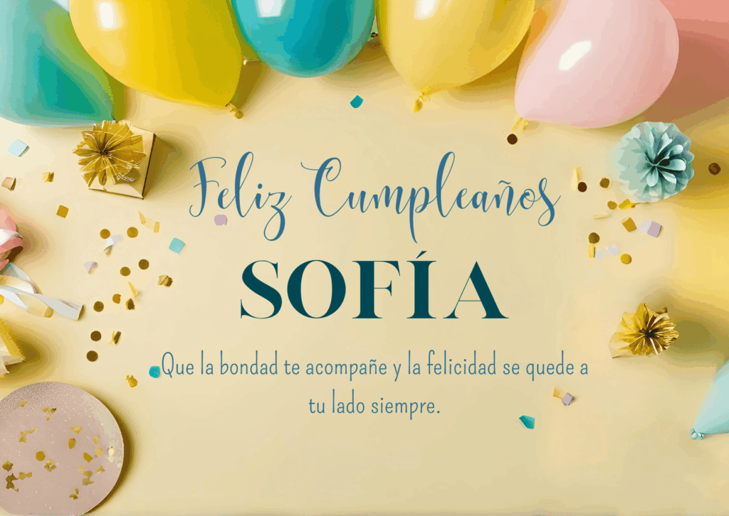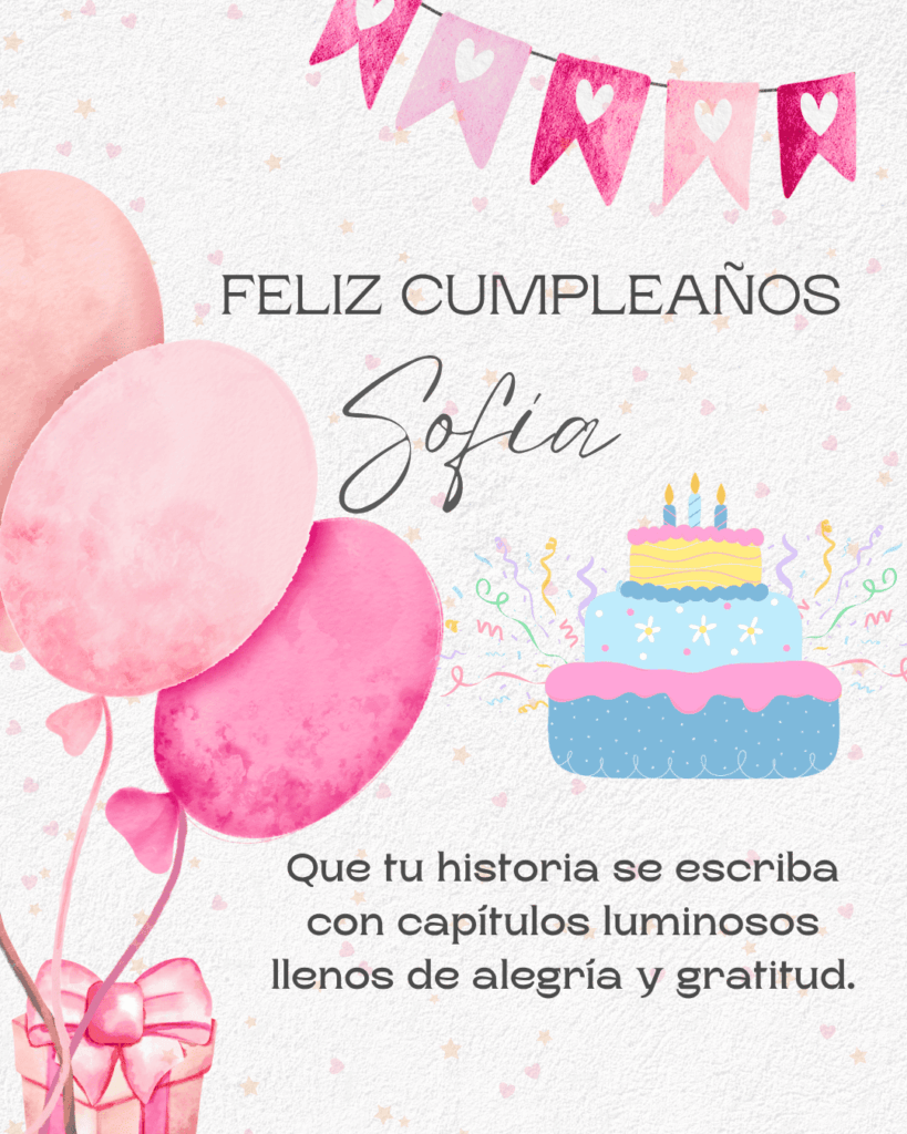 Feliz cumpleaños Sofía. Hoy el mundo se viste de alegría para celebrar tu vida. Que la felicidad te abrace fuerte y tus sueños encuentren el camino para hacerse realidad.