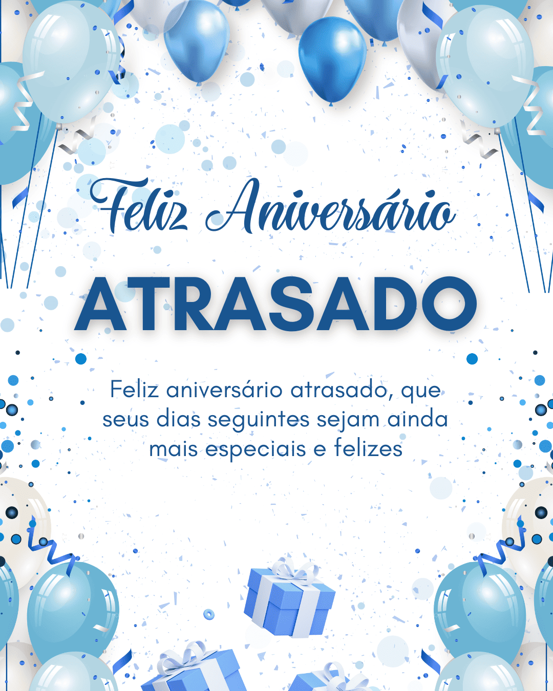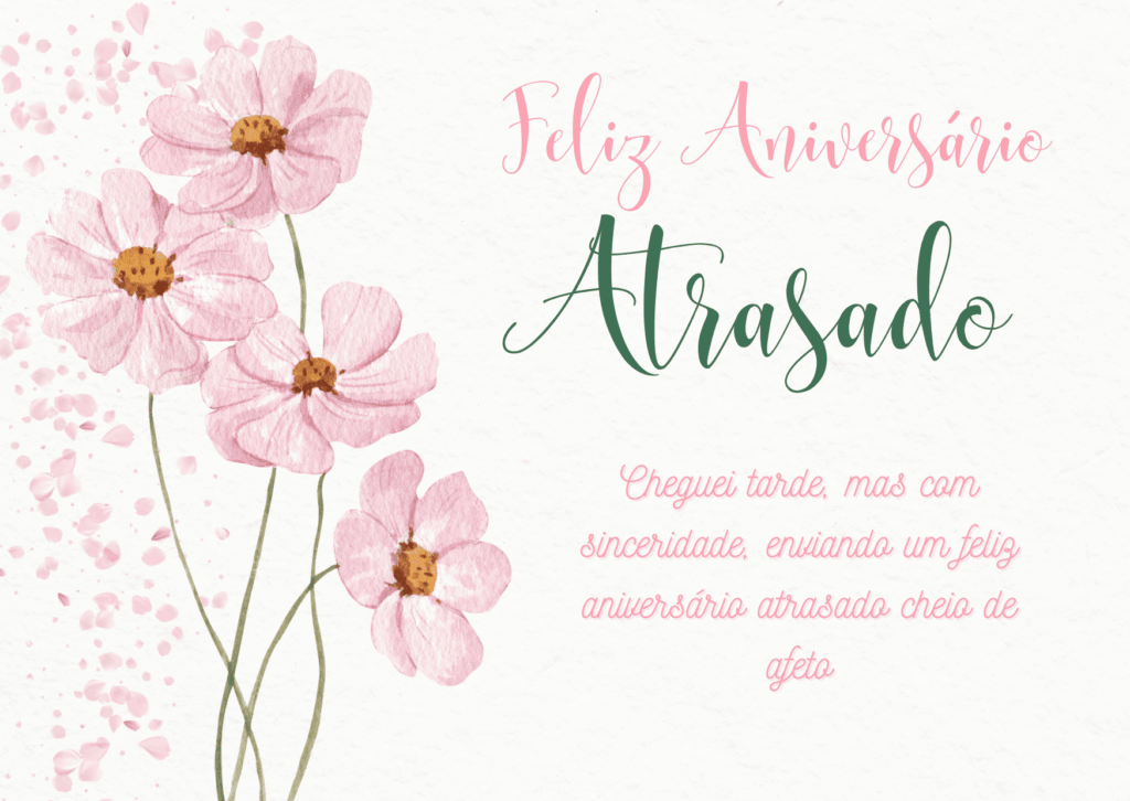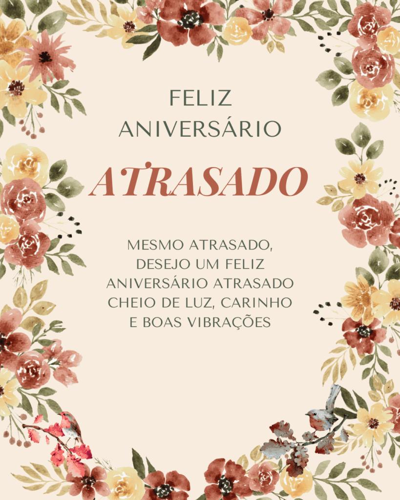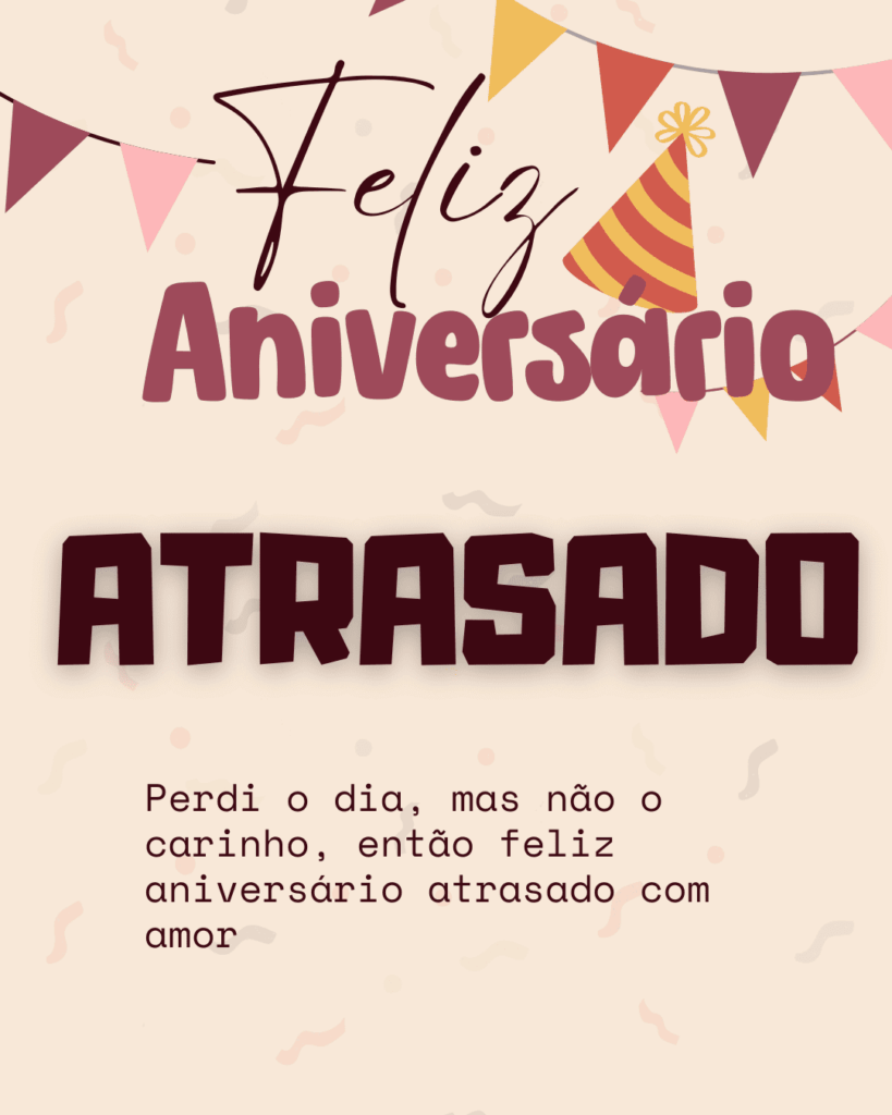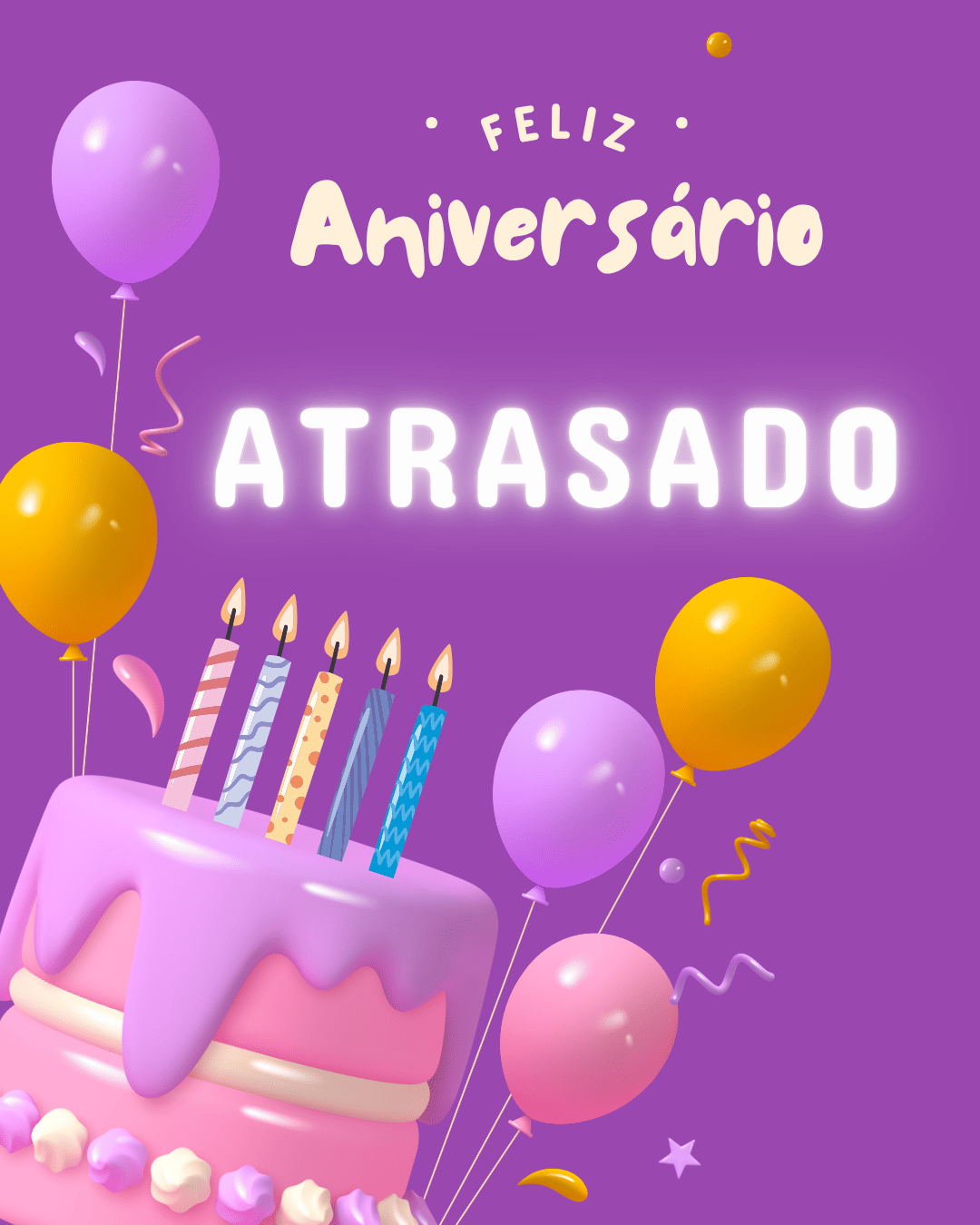 Feliz aniversário atrasado! A data passou, mas eu não poderia deixar de te desejar tudo de melhor. Que seu novo ano venha com mais tranquilidade, mais conquistas e mais momentos felizes do que você imagina.