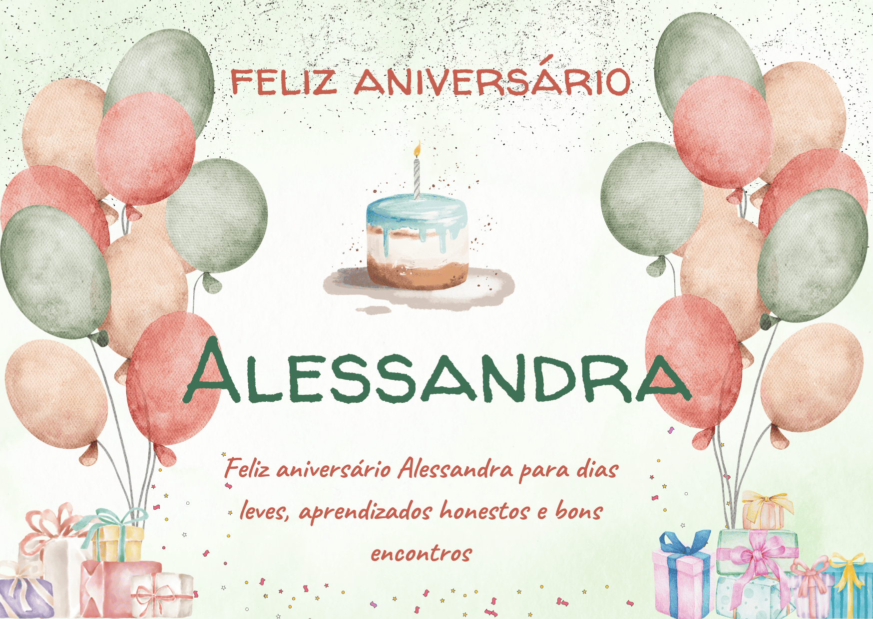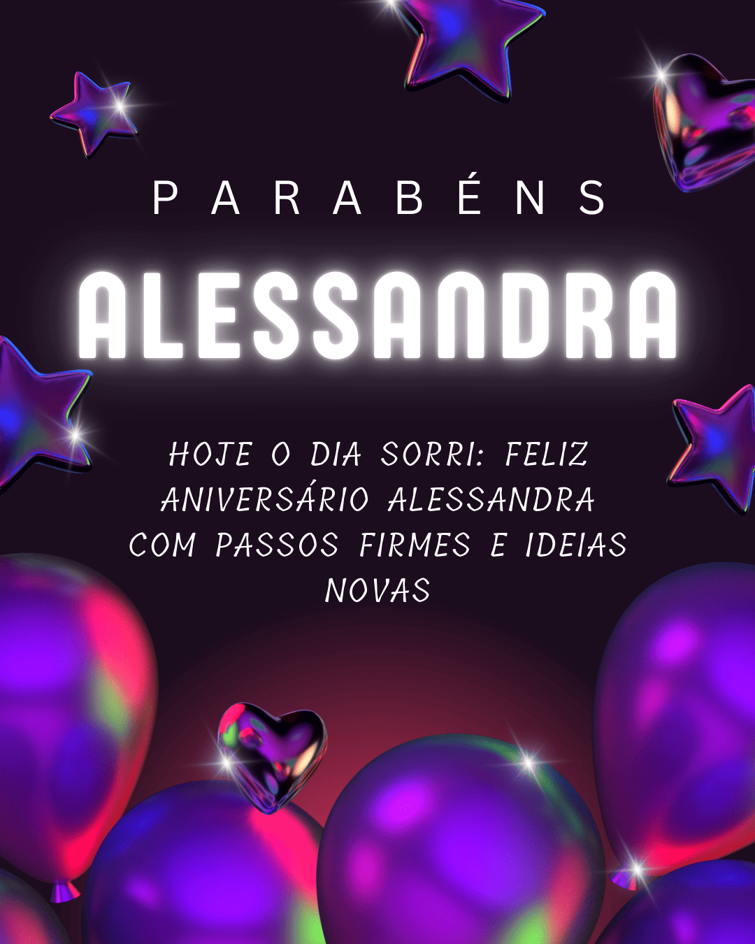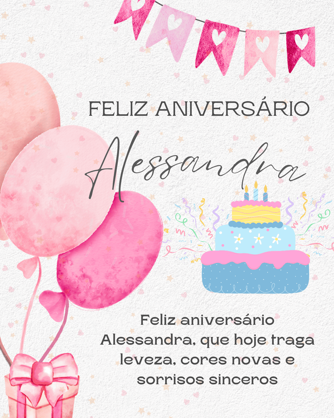 Alessandra, hoje é o seu dia e eu quero te desejar uma vida cheia de coisas bonitas. Você tem uma presença marcante, um coração generoso e um jeito de ser que inspira quem está por perto. Feliz aniversário Alessandra, que seu dia seja leve, feliz e do seu jeitinho.