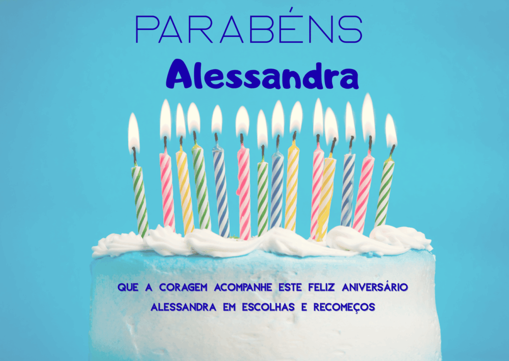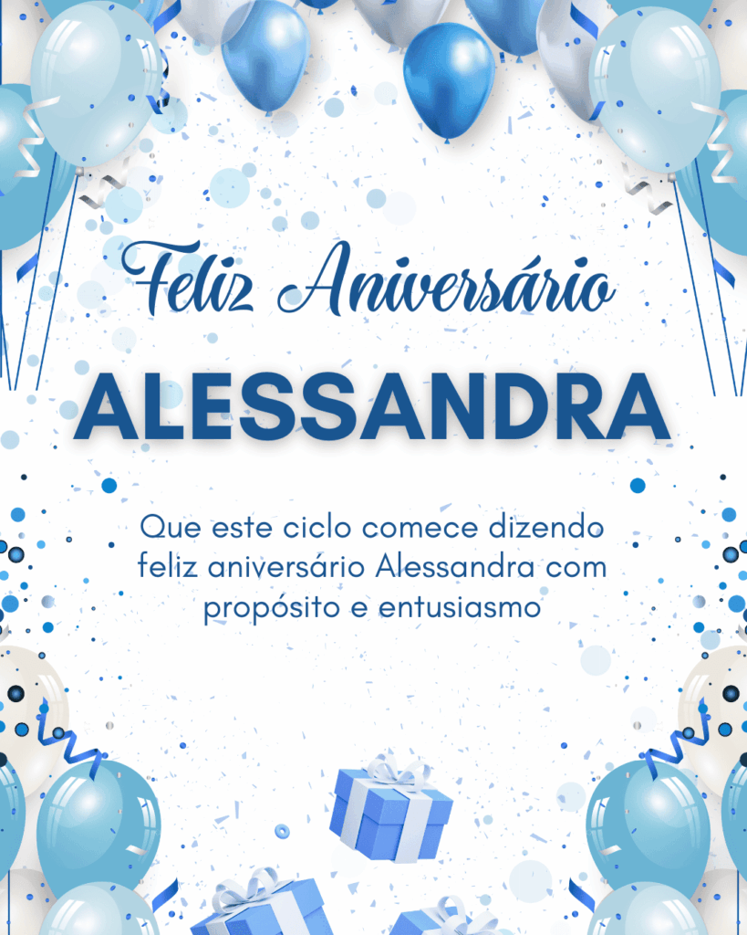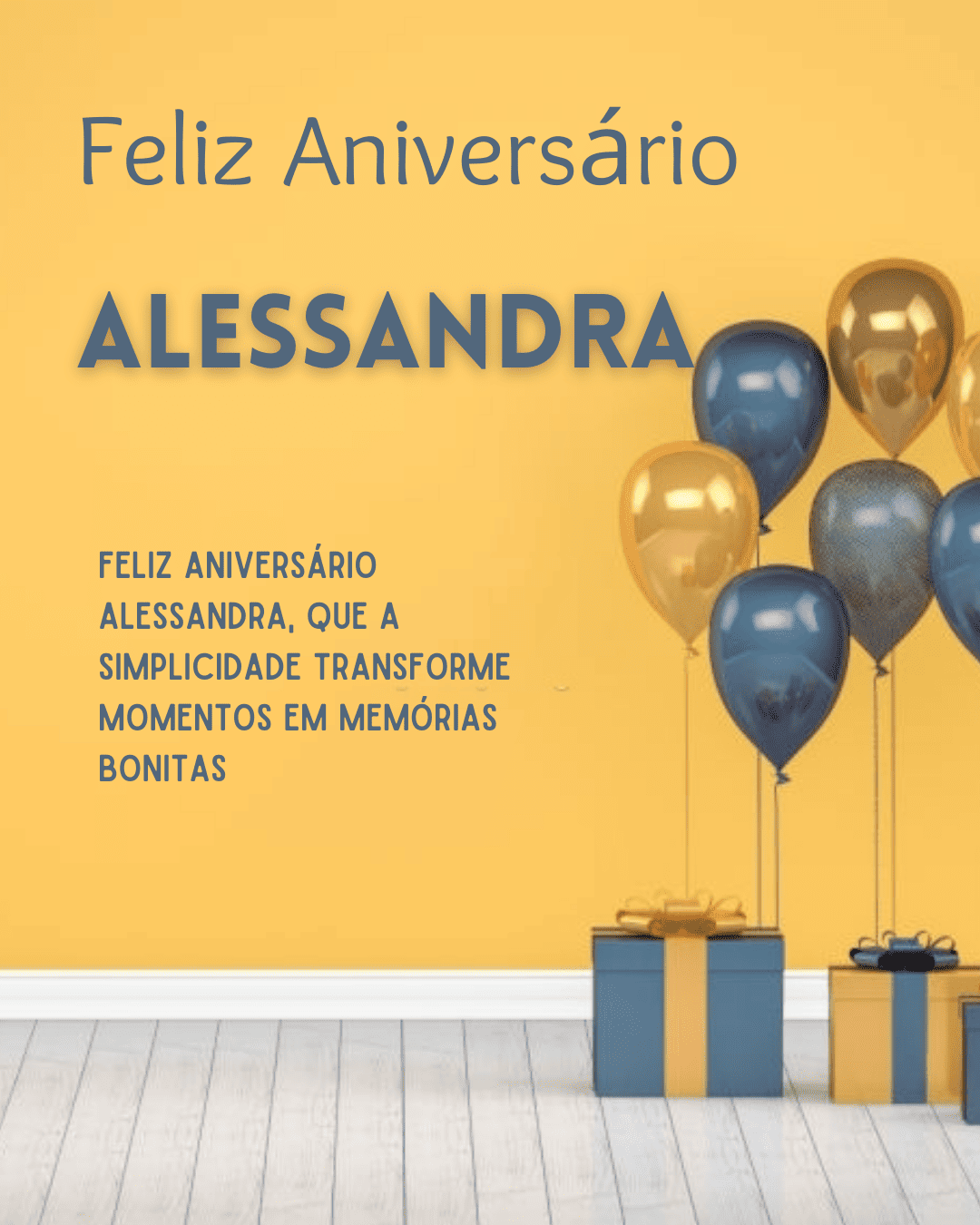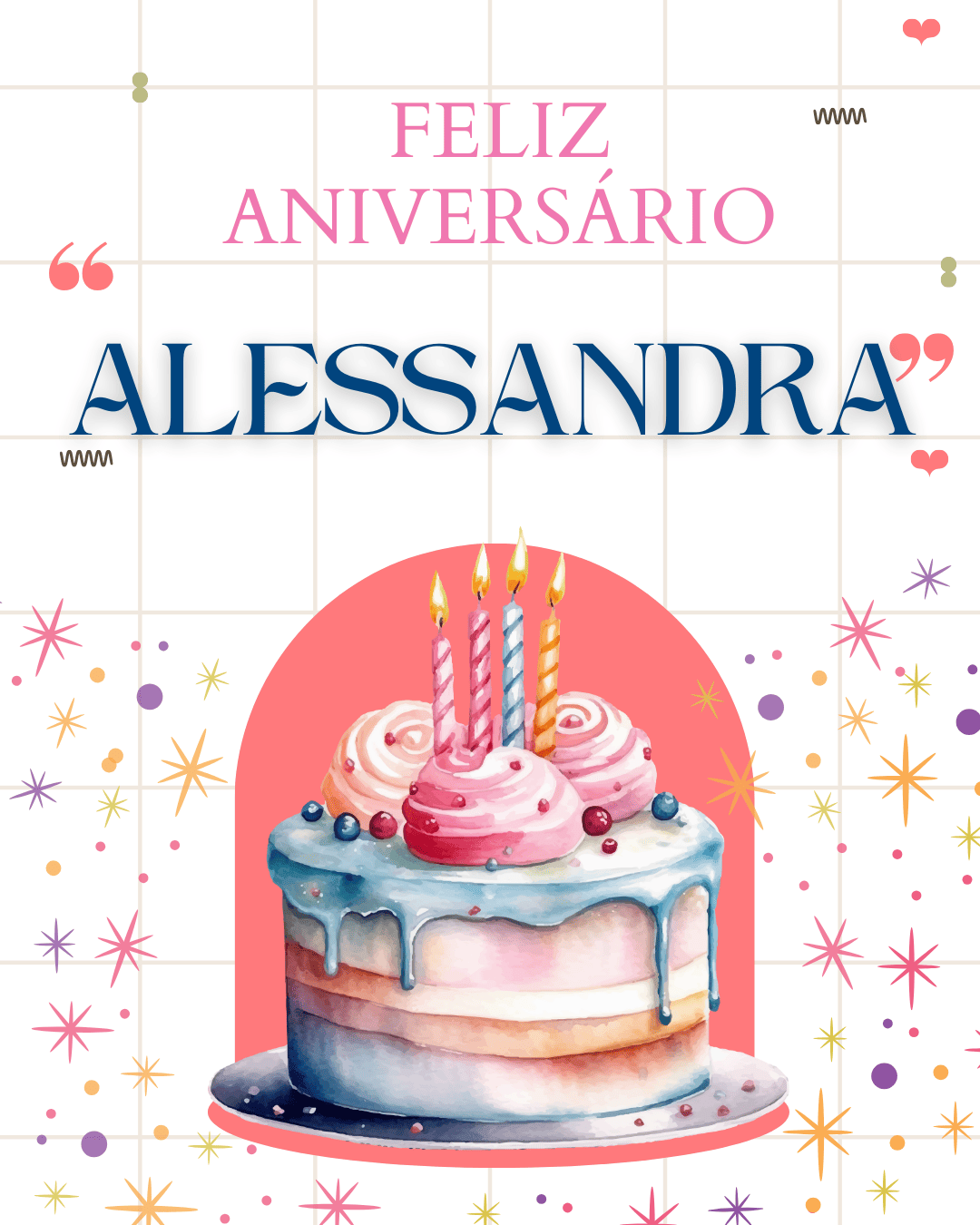 Alessandra, hoje é o seu dia e eu quero te desejar uma vida cheia de coisas bonitas. Você tem uma presença marcante, um coração generoso e um jeito de ser que inspira quem está por perto. Feliz aniversário Alessandra, que seu dia seja leve, feliz e do seu jeitinho.