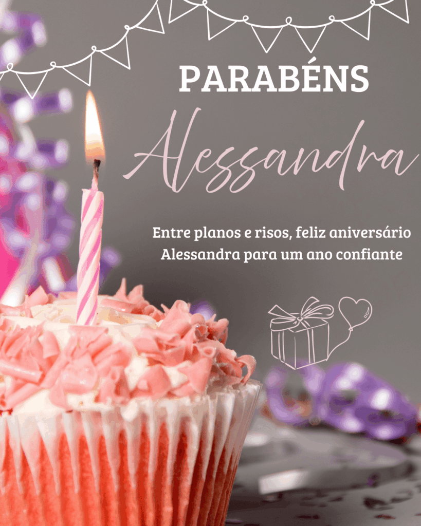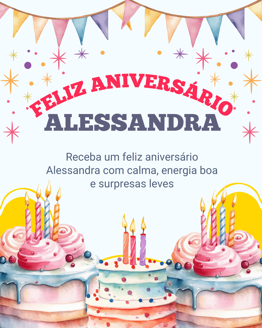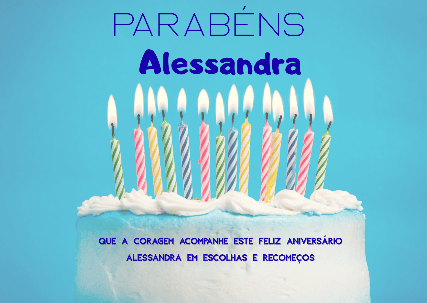 Feliz aniversário Alessandra! Hoje é dia de celebrar sua história, seu esforço e tudo o que você já construiu. Eu te desejo um aniversário com risadas, carinho e aquela sensação boa de que o melhor ainda vai acontecer.