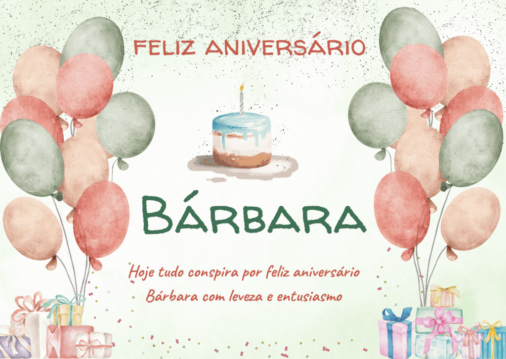 Feliz aniversário Bárbara! Hoje é dia de celebrar sua vida, sua história e tudo o que você já conquistou. Eu te desejo um aniversário com risadas, carinho e aquela sensação boa de que o melhor ainda está por vir.