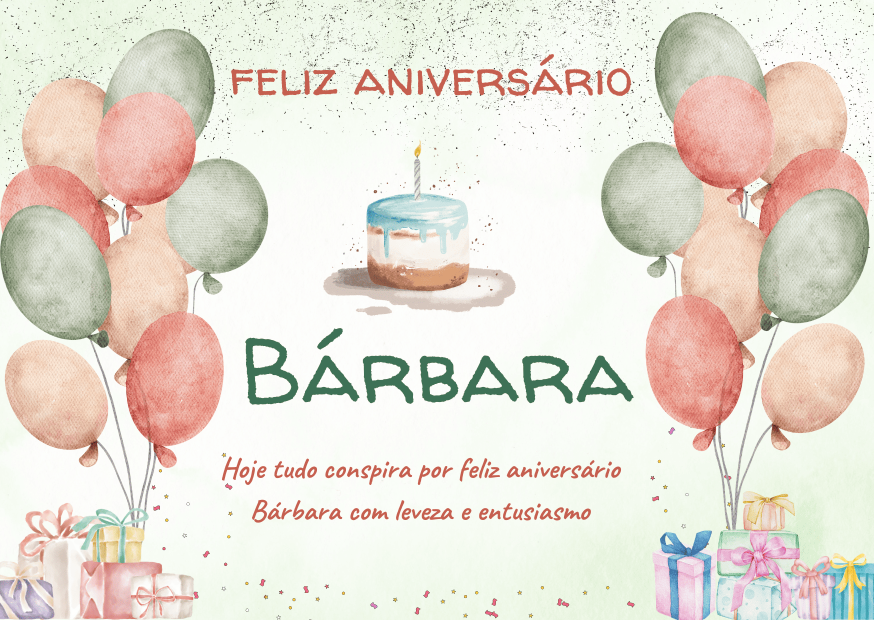 Feliz aniversário Bárbara! Que hoje você se permita celebrar sem pressa, com leveza e com gente que te quer bem. Você merece um dia feliz, com paz na mente e alegria no coração.