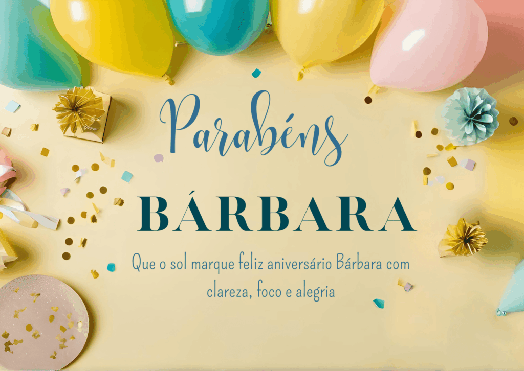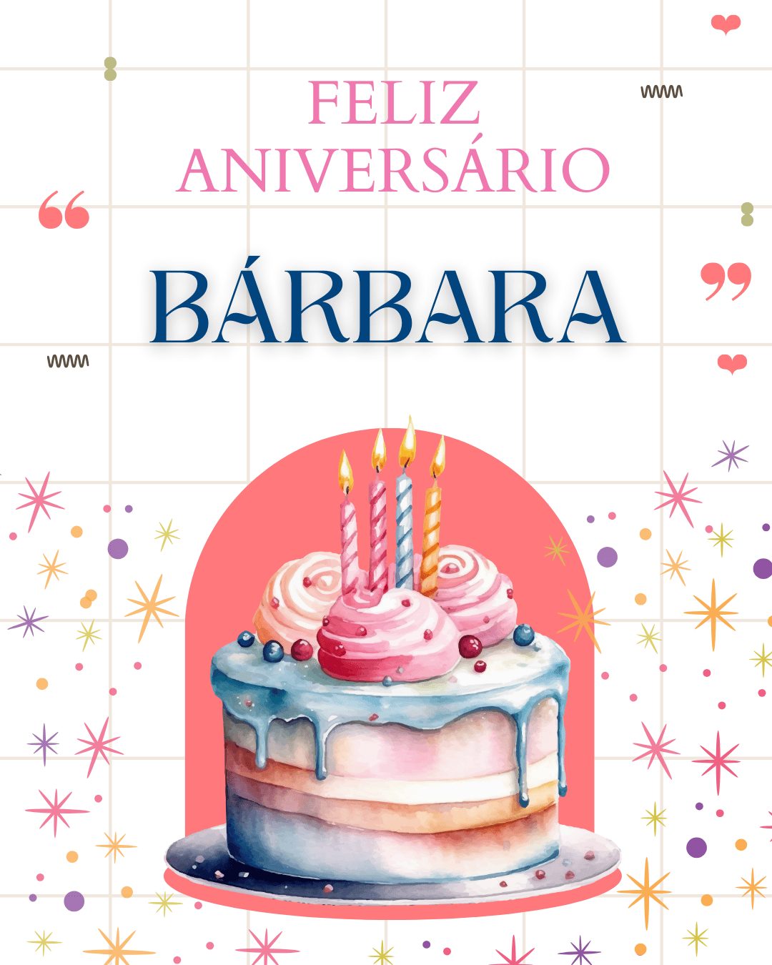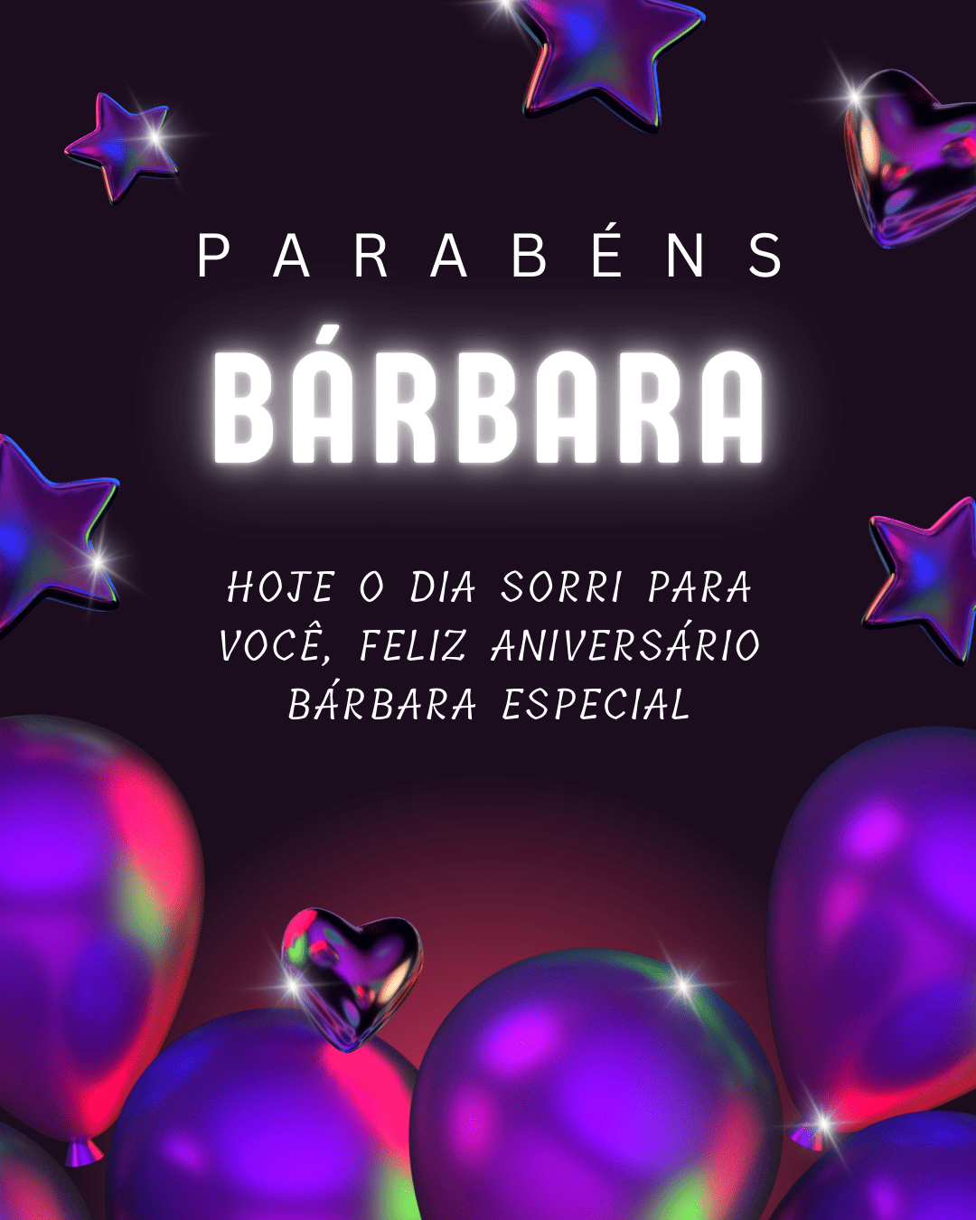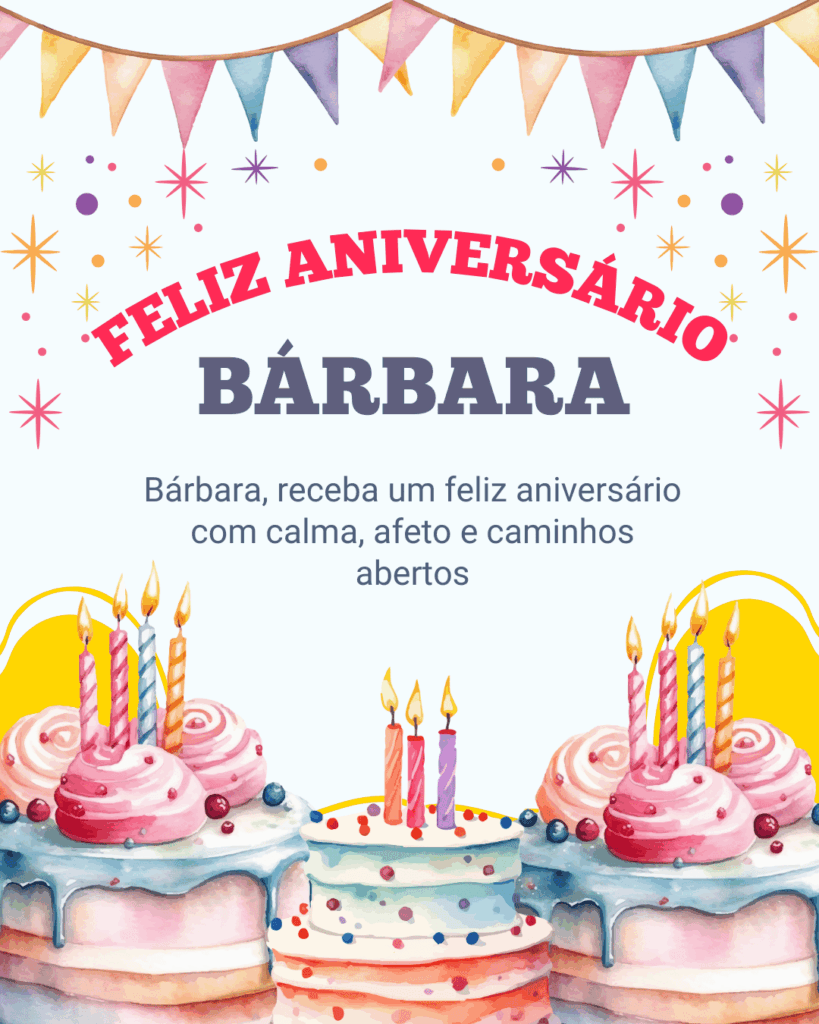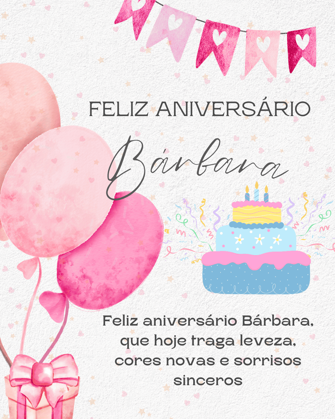 Feliz aniversário Bárbara! Que hoje você receba carinho em cada detalhe: uma mensagem bonita, um abraço sincero e uma comemoração do seu jeito. Você é uma pessoa forte, sensível e cheia de luz, e isso inspira quem está ao seu lado.