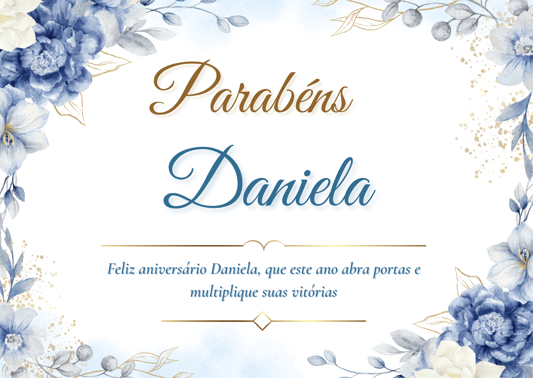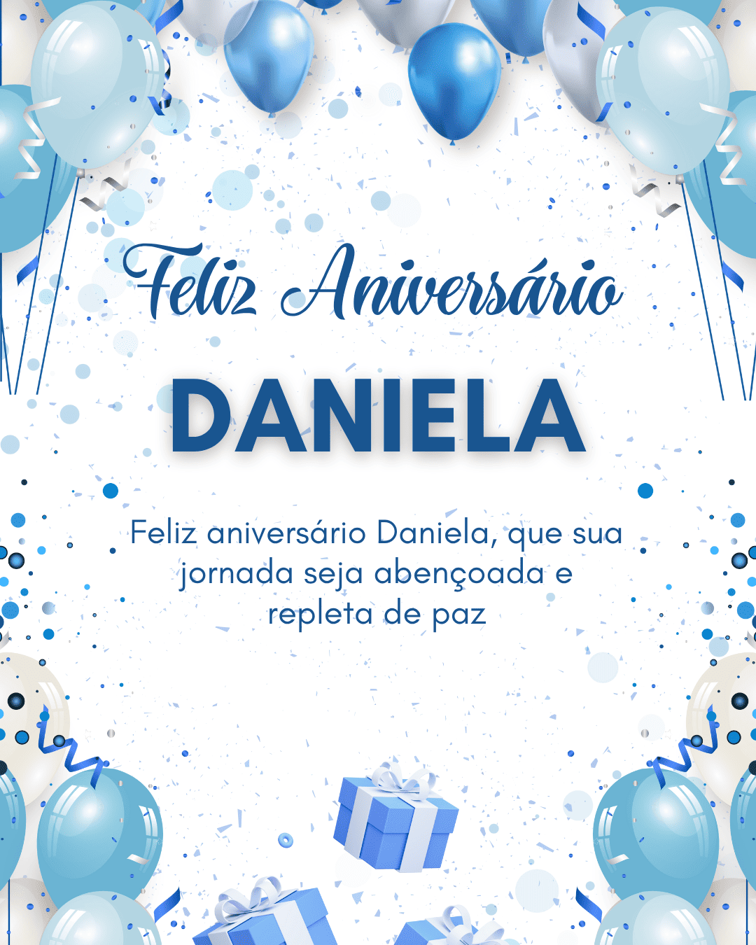 Daniela, que seu feliz aniversario Daniela seja marcado por sorrisos, abraços sinceros e aquela sensação boa de paz no coração. Hoje celebramos sua vida e tudo aquilo que faz de você uma pessoa tão única e especial.