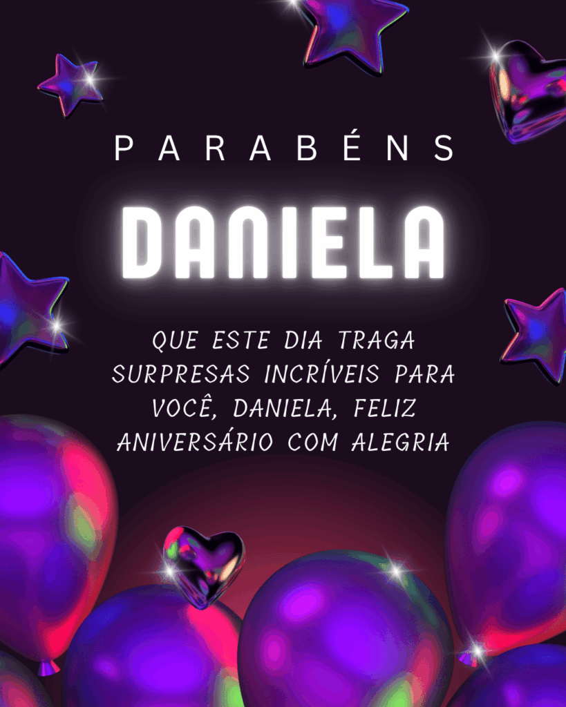 Neste feliz aniversario Daniela, desejo que seu dia seja iluminado por amor, carinho e momentos inesquecíveis. Que você sinta o quanto é especial e o quanto sua presença traz alegria para quem está ao seu redor.