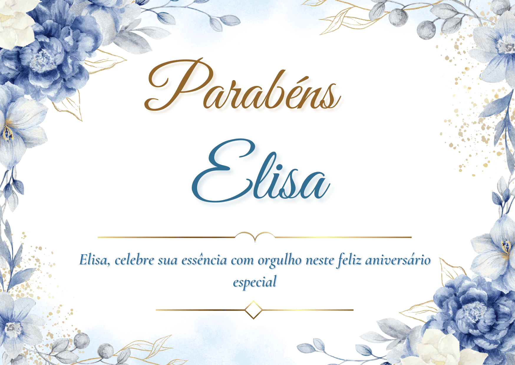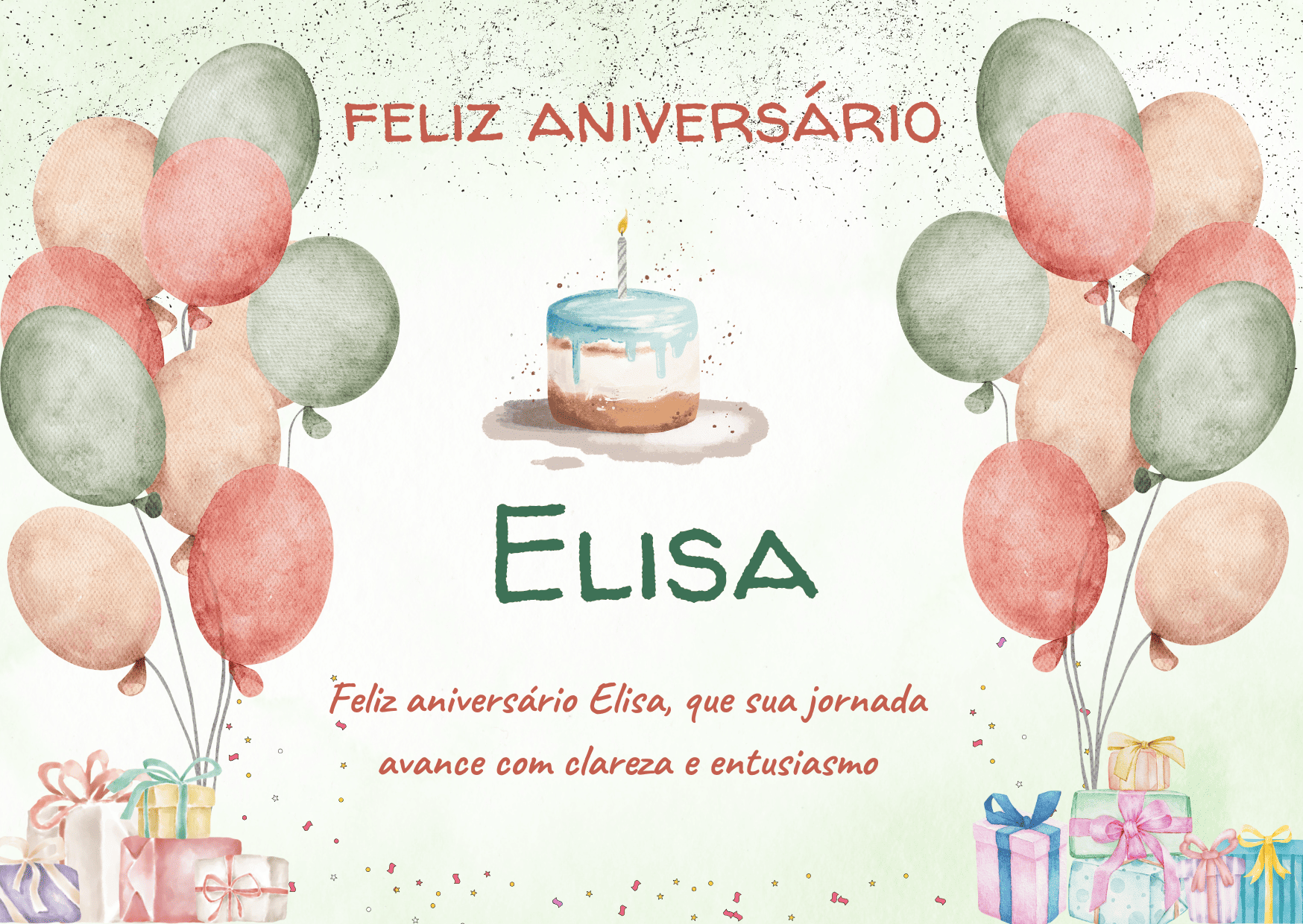 Elisa, que alegria poder comemorar o seu aniversário! Você é uma pessoa marcante, com um jeito único de tornar a vida mais leve e mais bonita. Feliz aniversário Elisa, que seu dia seja tranquilo, cheio de afeto e boas surpresas.
