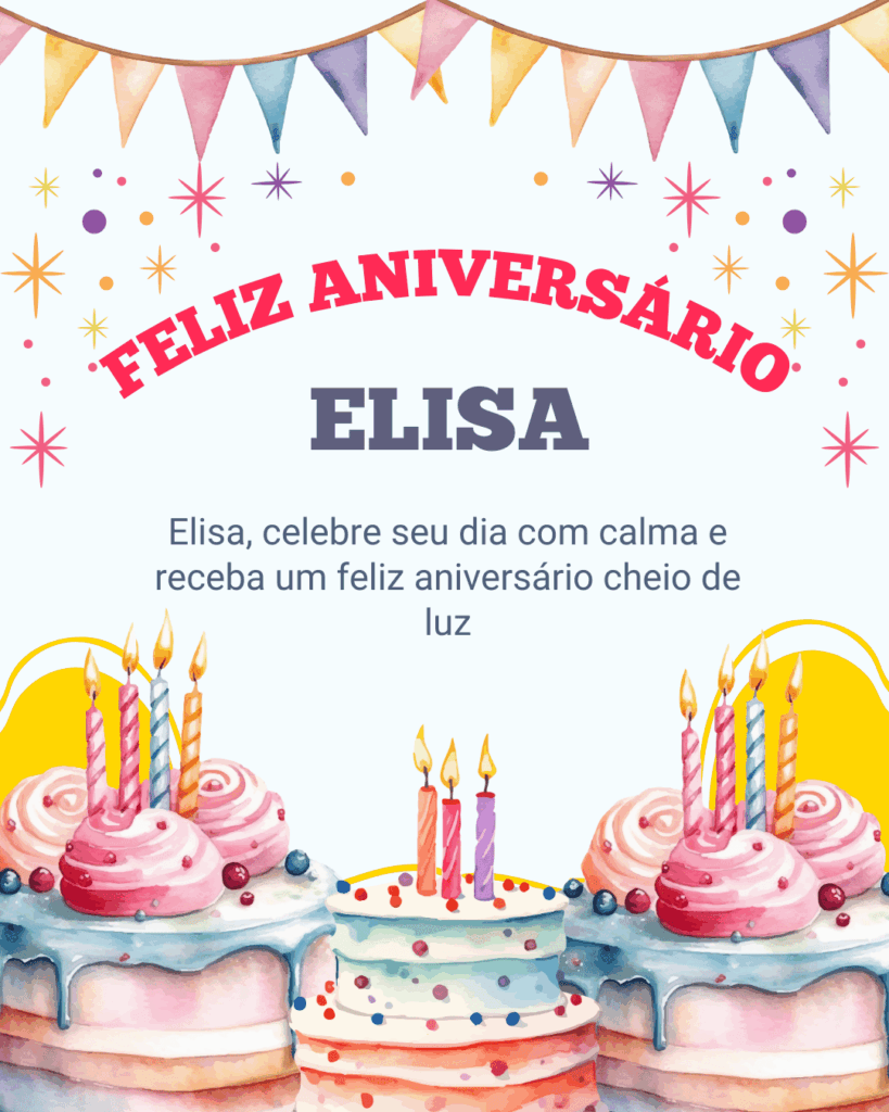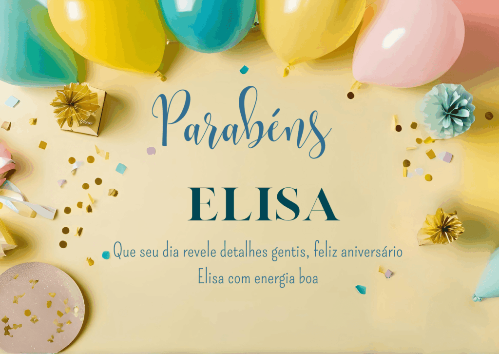 Feliz aniversário Elisa! Que hoje você receba carinho em cada detalhe: uma mensagem bonita, um abraço sincero e uma comemoração do seu jeito. Você é uma pessoa cheia de luz, e sua presença deixa tudo mais leve.