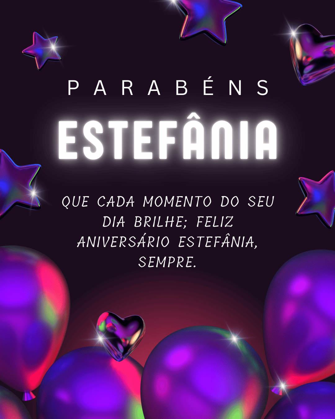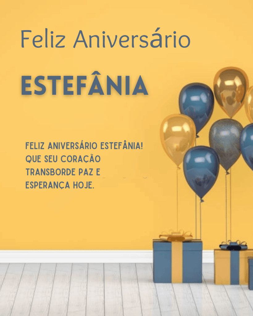 Estefânia, hoje é o seu dia e eu quero te desejar um aniversário cheio de paz e alegria. Você tem um jeito especial de iluminar tudo ao redor, com sensibilidade, força e um sorriso que faz bem. Feliz aniversário Estefânia, que seu coração esteja leve e que você se sinta muito amada.