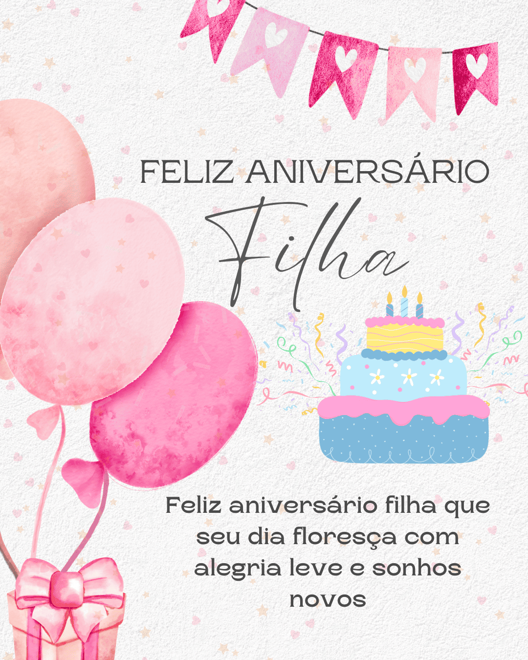 Feliz aniversário, filha! Hoje eu celebro sua vida com o coração cheio de orgulho. Você é forte, linda por dentro e por fora, e tem uma luz que ilumina qualquer lugar onde chega.