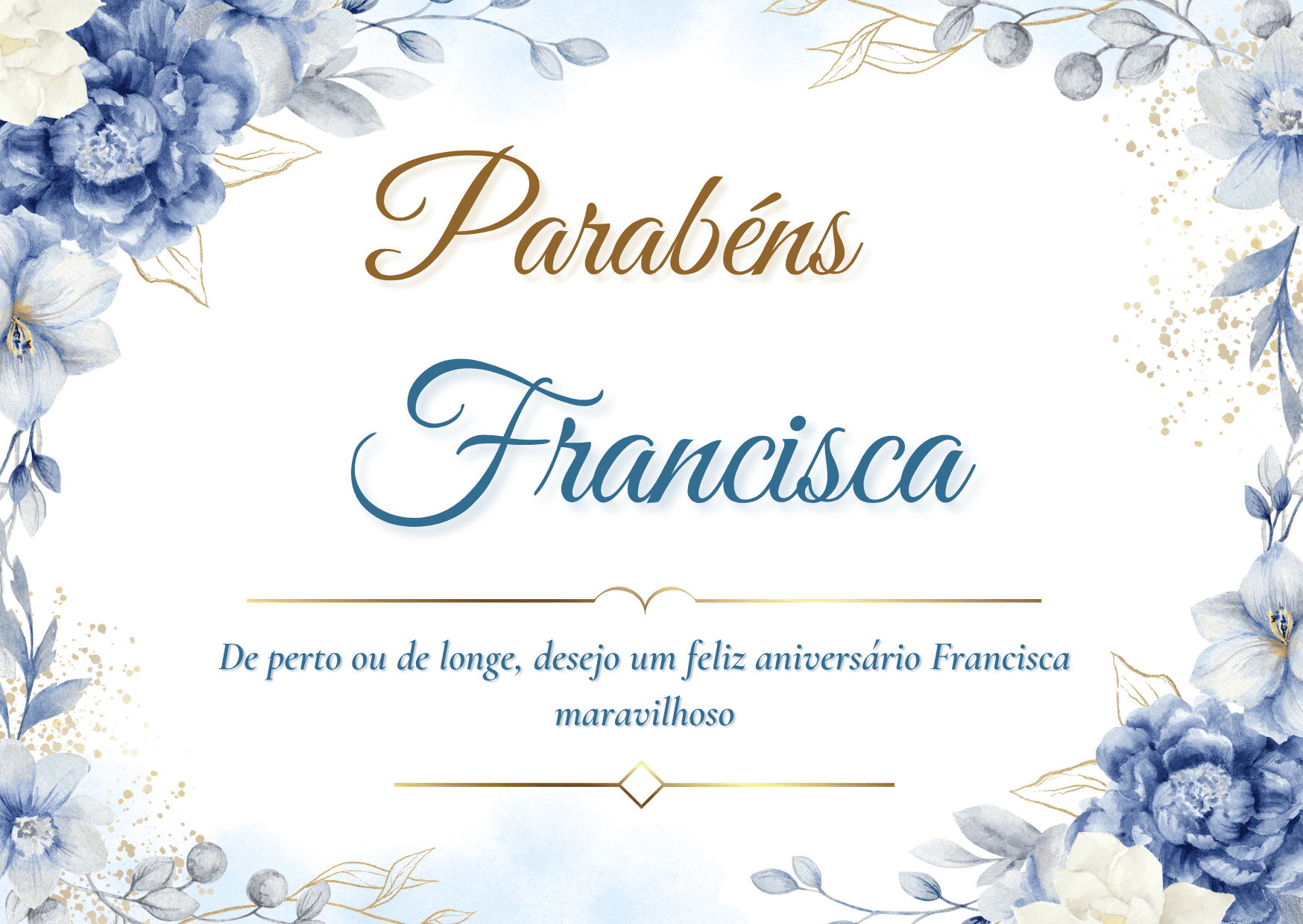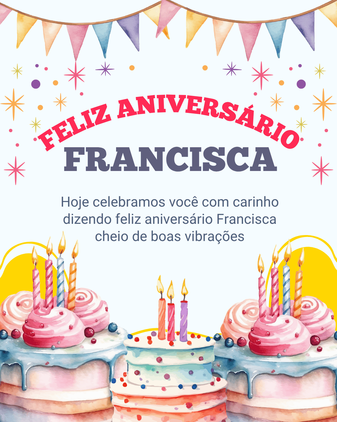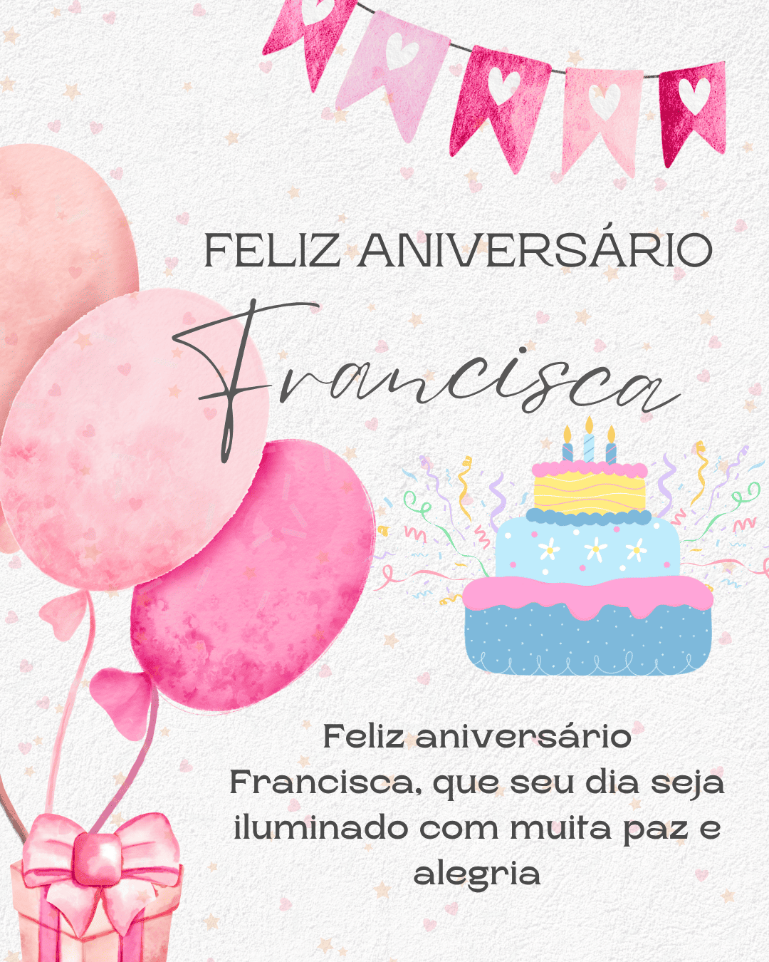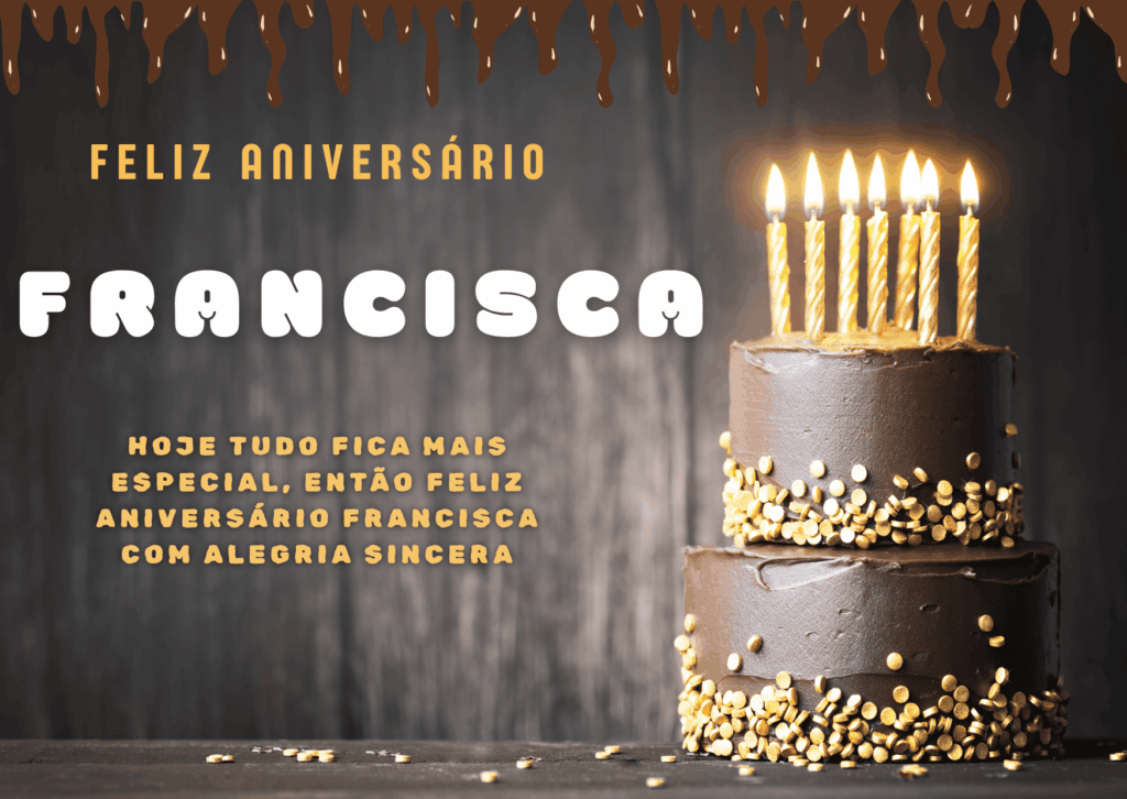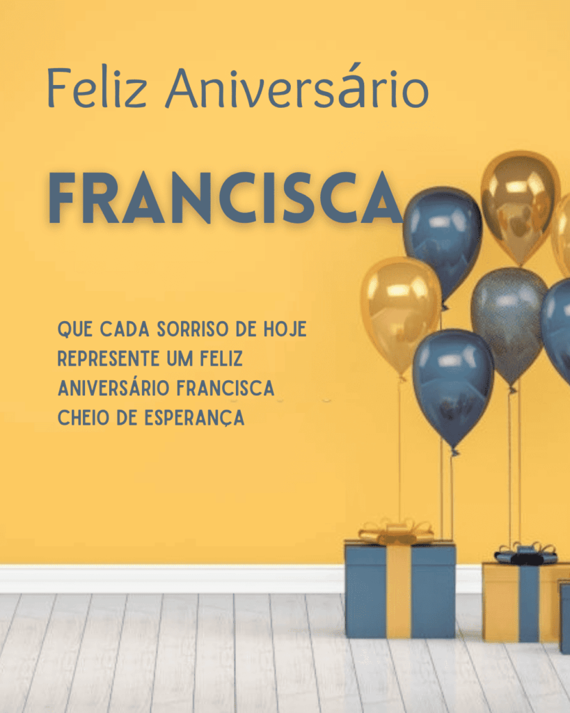 Hoje celebramos você, Francisca! Que este feliz aniversario Francisca encha sua alma de paz e gratidão. Que cada mensagem recebida seja um abraço e cada sorriso, uma lembrança afetuosa.