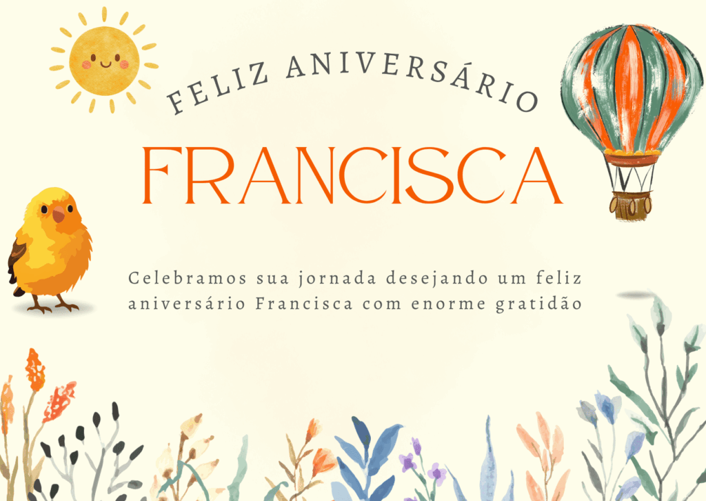 Parabéns, Francisca! Que o feliz aniversario Francisca seja repleto de momentos que aquecem o coração e de pequenas alegrias que fazem toda a diferença no dia a dia.