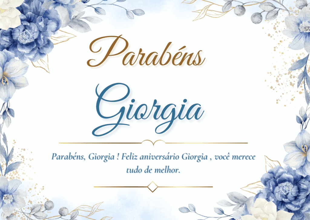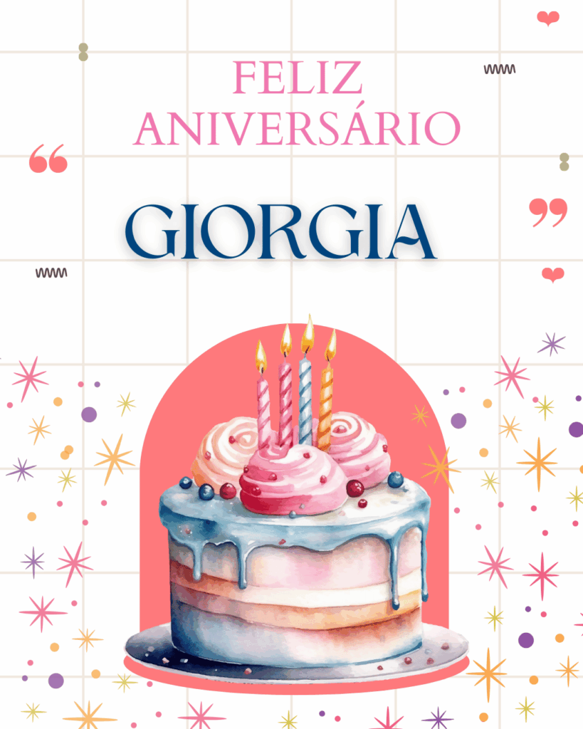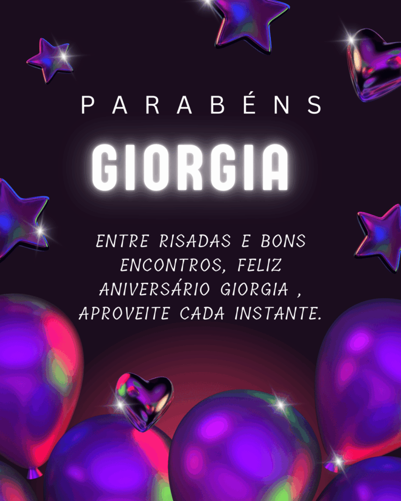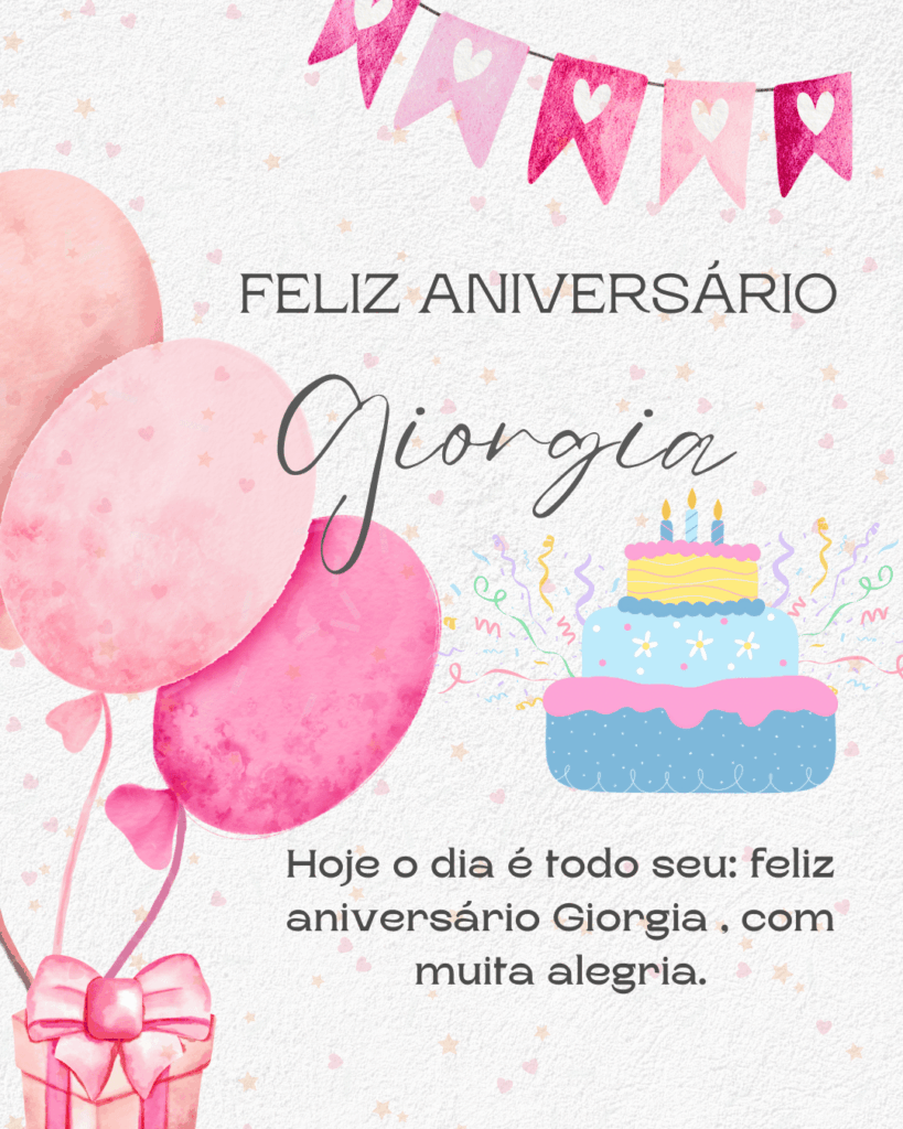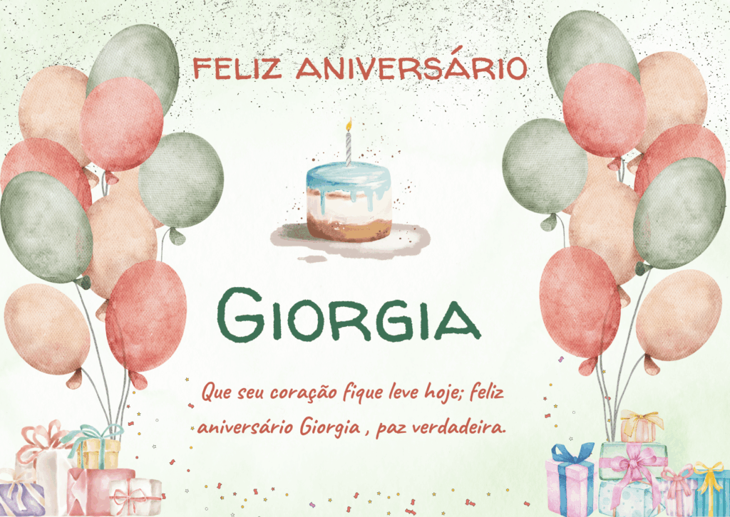 Giorgia, hoje é o seu dia e eu quero te desejar um aniversário cheio de paz e alegria. Você tem um jeito especial de iluminar tudo ao redor, com delicadeza, força e um sorriso que faz bem. Feliz aniversário Giorgia, que seu coração esteja leve e que você se sinta muito amada.