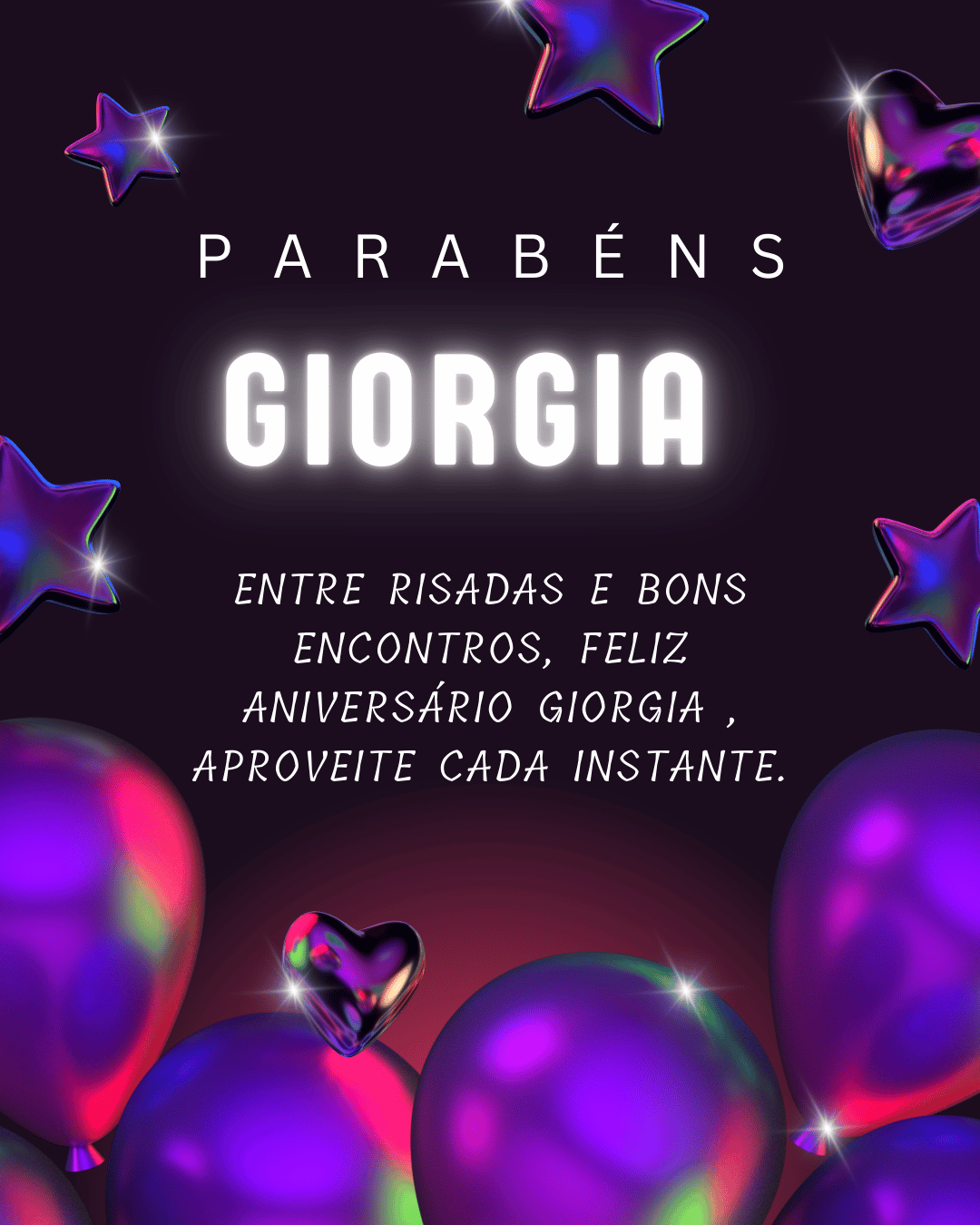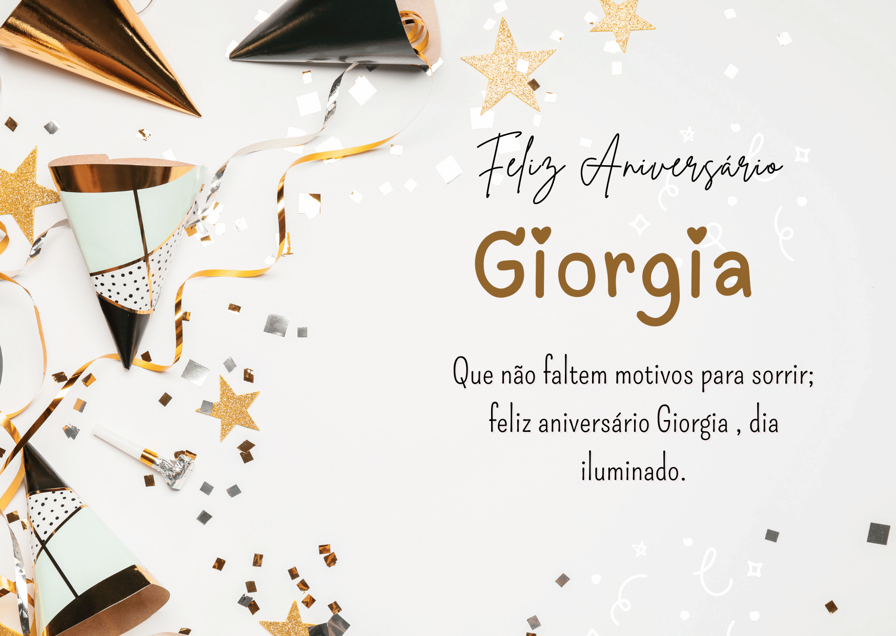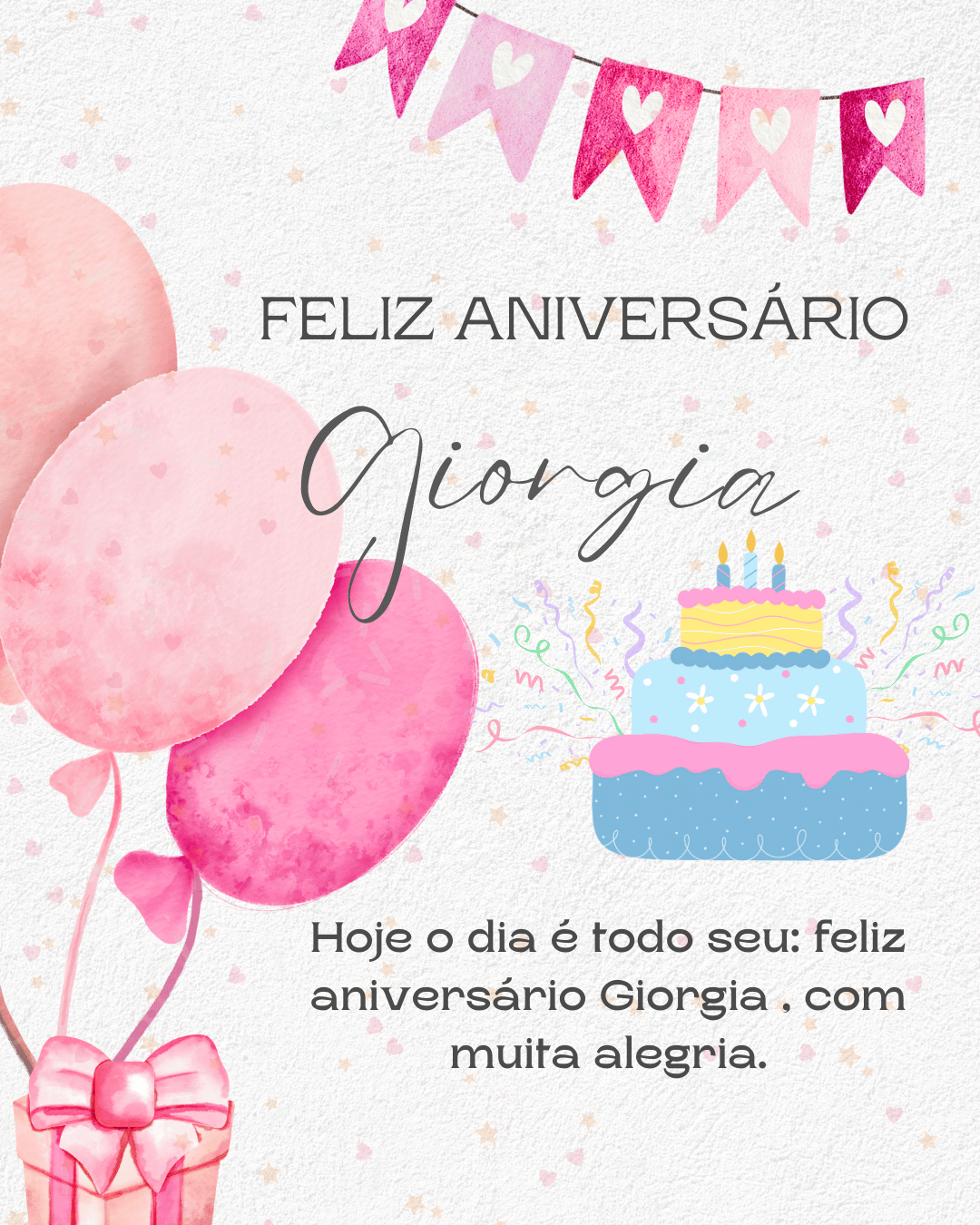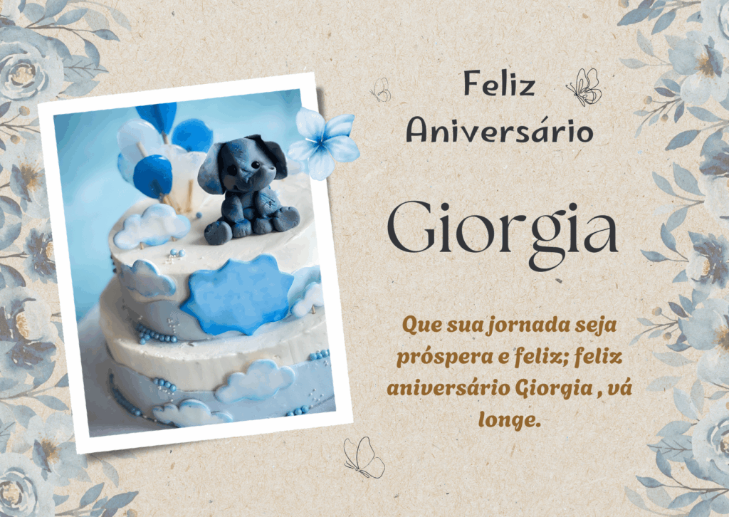 Giorgia, hoje é o seu dia e eu quero te desejar um aniversário cheio de paz e alegria. Você tem um jeito especial de iluminar tudo ao redor, com delicadeza, força e um sorriso que faz bem. Feliz aniversário Giorgia, que seu coração esteja leve e que você se sinta muito amada.