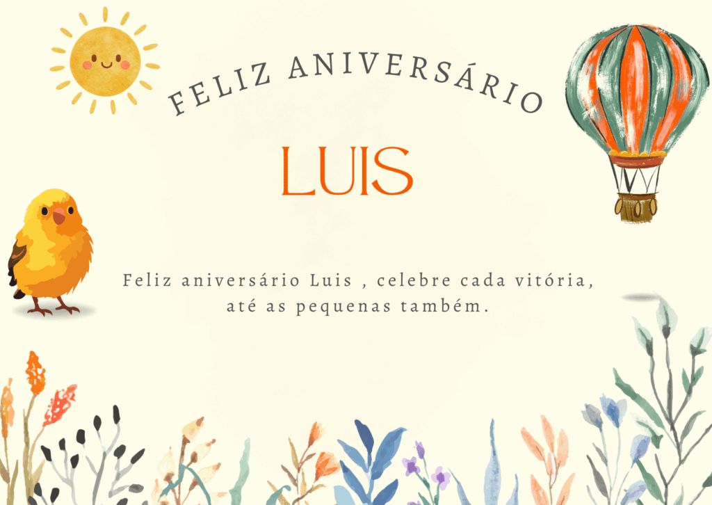 Luís, se eu pudesse escolher um presente perfeito para você, eu escolheria um ano inteiro de paz e conquistas. Paz para viver com mais calma e conquistas para você sentir orgulho do seu caminho. Feliz aniversário Luís!