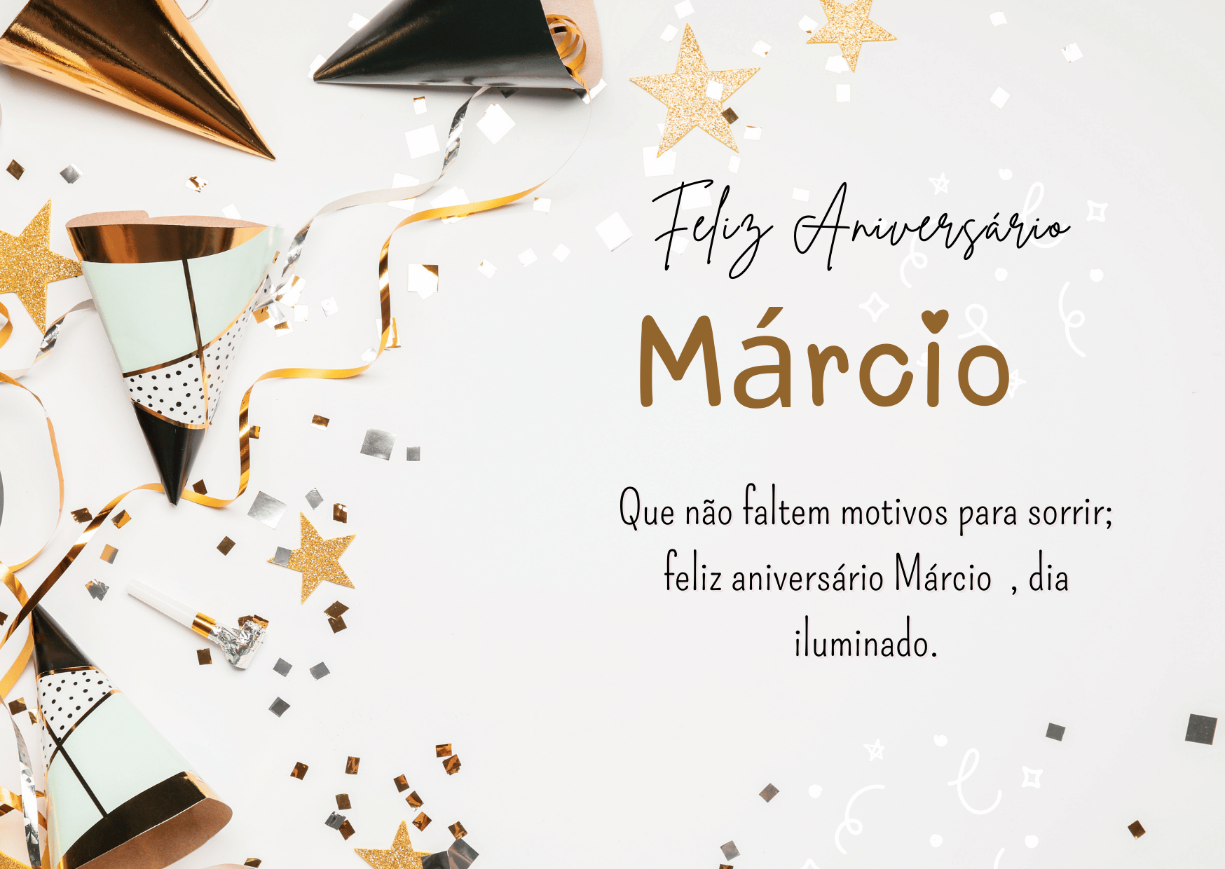 Feliz aniversário Márcio! Hoje é dia de celebrar a sua vida e tudo o que você já construiu com esforço e dedicação. Que você tenha um aniversário com boa companhia, palavras bonitas e motivos de sobra para sorrir.