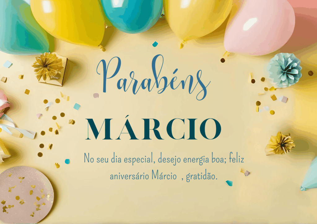 Márcio, hoje é o seu dia e eu quero te desejar um aniversário cheio de paz e boas energias. Você tem um jeito especial de encarar a vida com firmeza e bom humor, e isso inspira quem está por perto. Feliz aniversário Márcio, que seu dia seja leve, com boas surpresas e muita alegria.