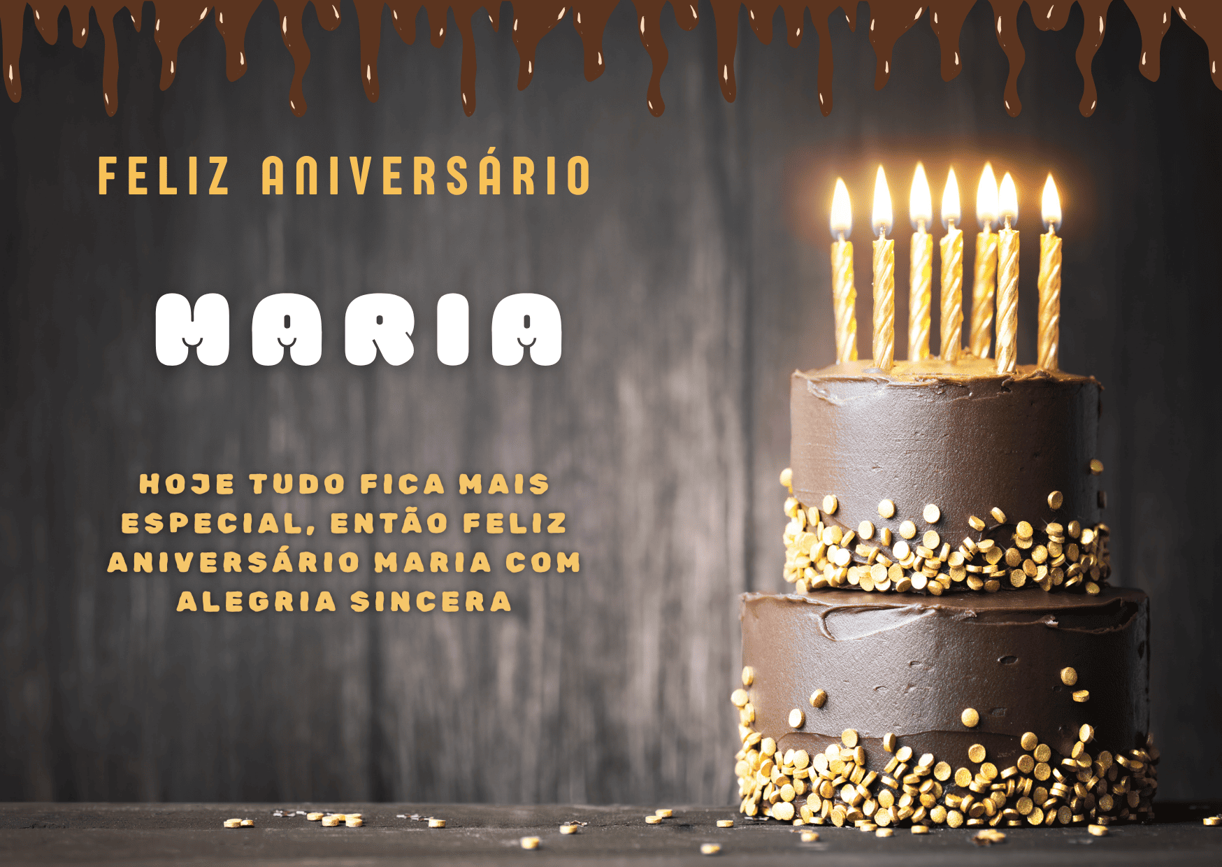 Maria, que seu feliz aniversario Maria venha repleto de boas surpresas, risadas e pessoas queridas ao seu lado. Hoje é dia de celebrar a sua essência e tudo o que torna você única.