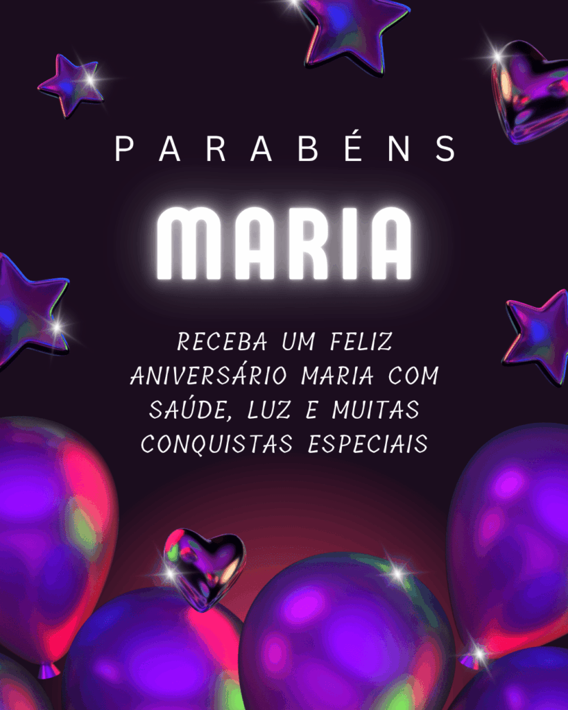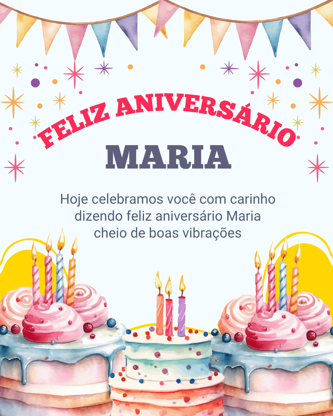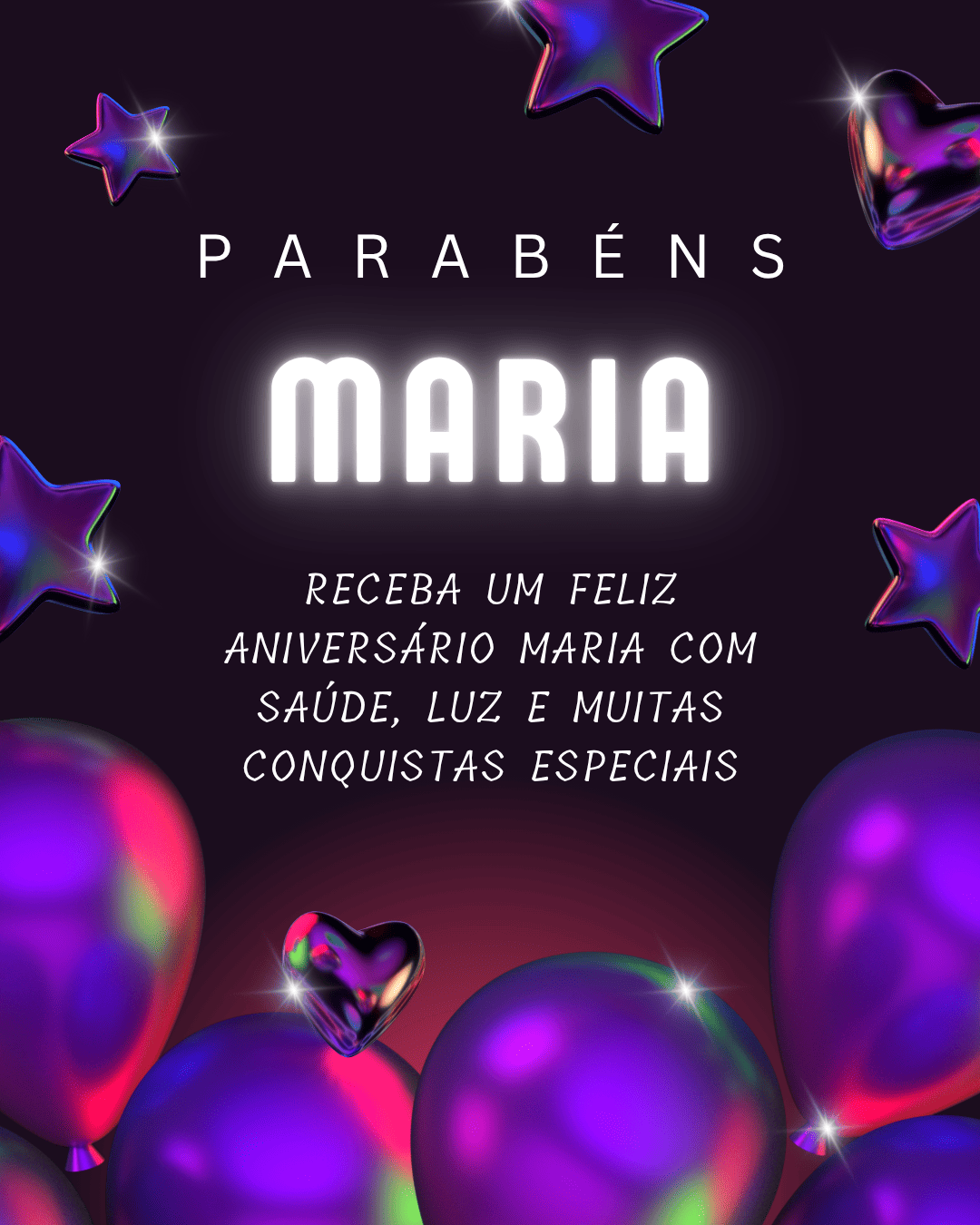 Maria, hoje celebramos sua vida com alegria e gratidão. Que este feliz aniversario Maria seja cheio de luz, sorrisos sinceros e momentos que aqueçam o coração. Você merece tudo de melhor que o universo pode oferecer.