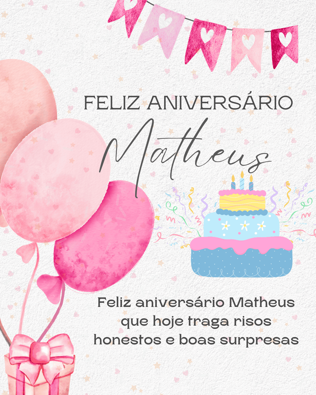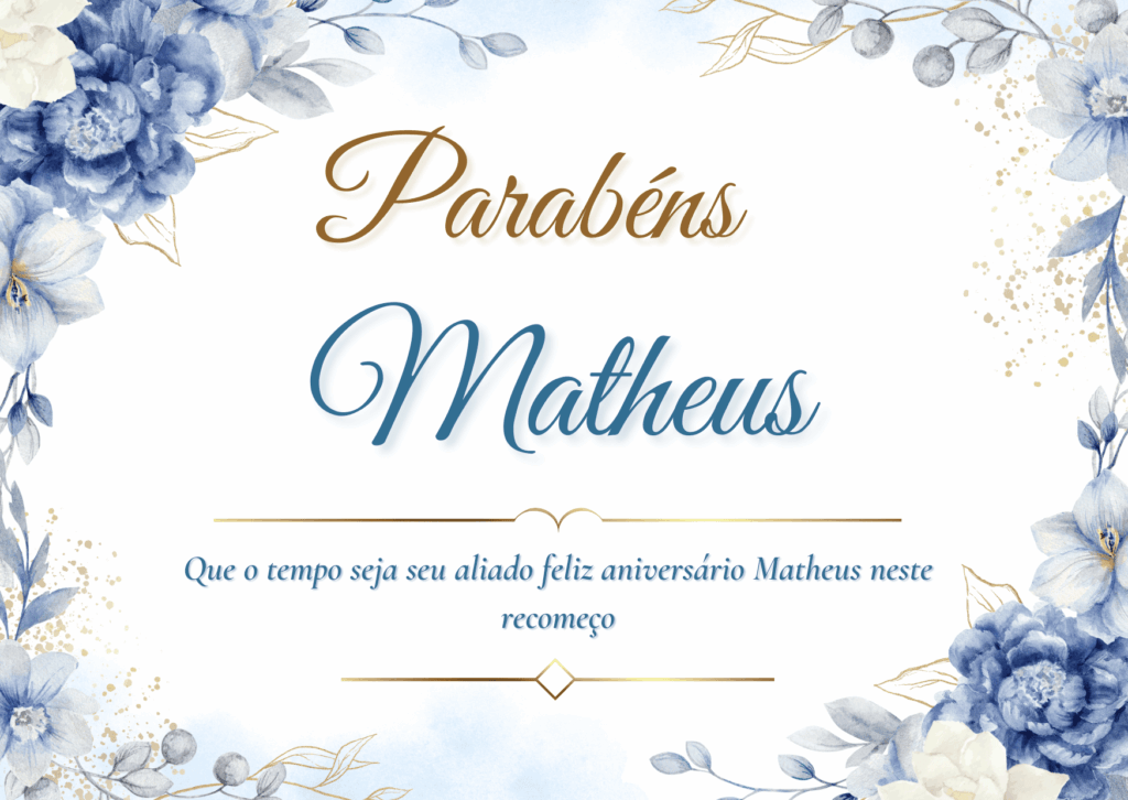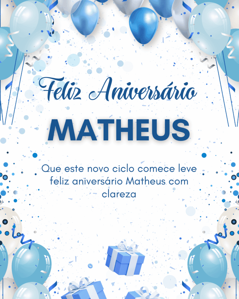Matheus, no seu aniversário eu te desejo um presente que vale mais do que qualquer coisa: paz na mente e alegria no coração. Que você tenha clareza para escolher o que te faz bem e coragem para seguir em frente. Feliz aniversário Matheus!