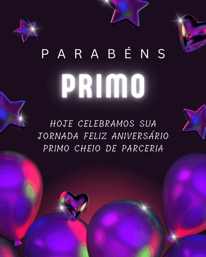 Feliz aniversário, primo! Que este dia seja cheio de alegria, boas energias e momentos especiais. Você merece viver um ano incrível, com conquistas e felicidade.