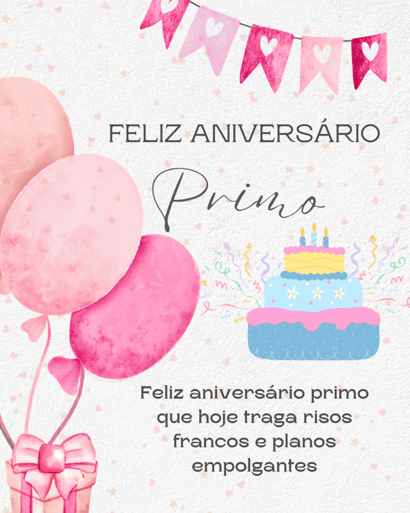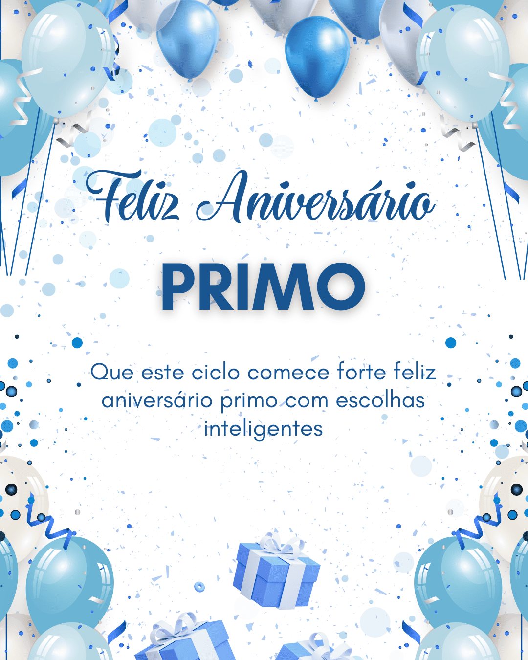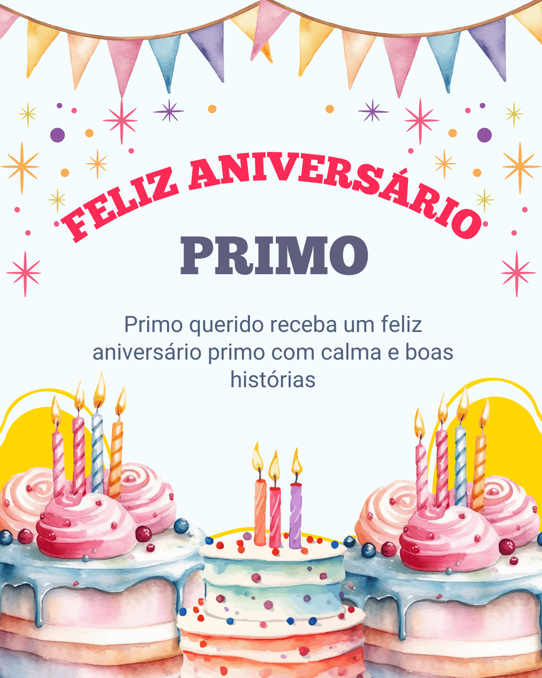 Feliz aniversário, primo! Que hoje seja um dia leve, divertido e cheio de momentos especiais. Você merece comemorar com alegria e sentir o carinho de todos que gostam de você.