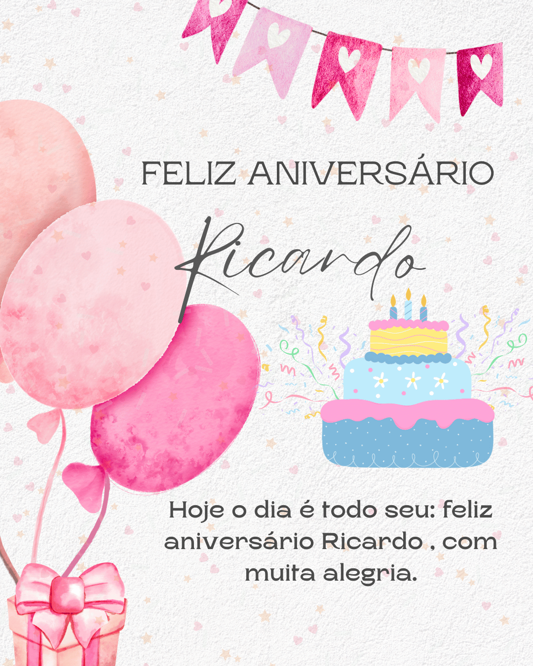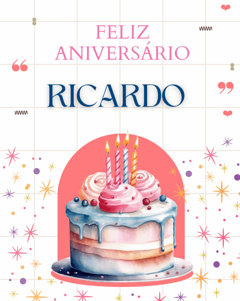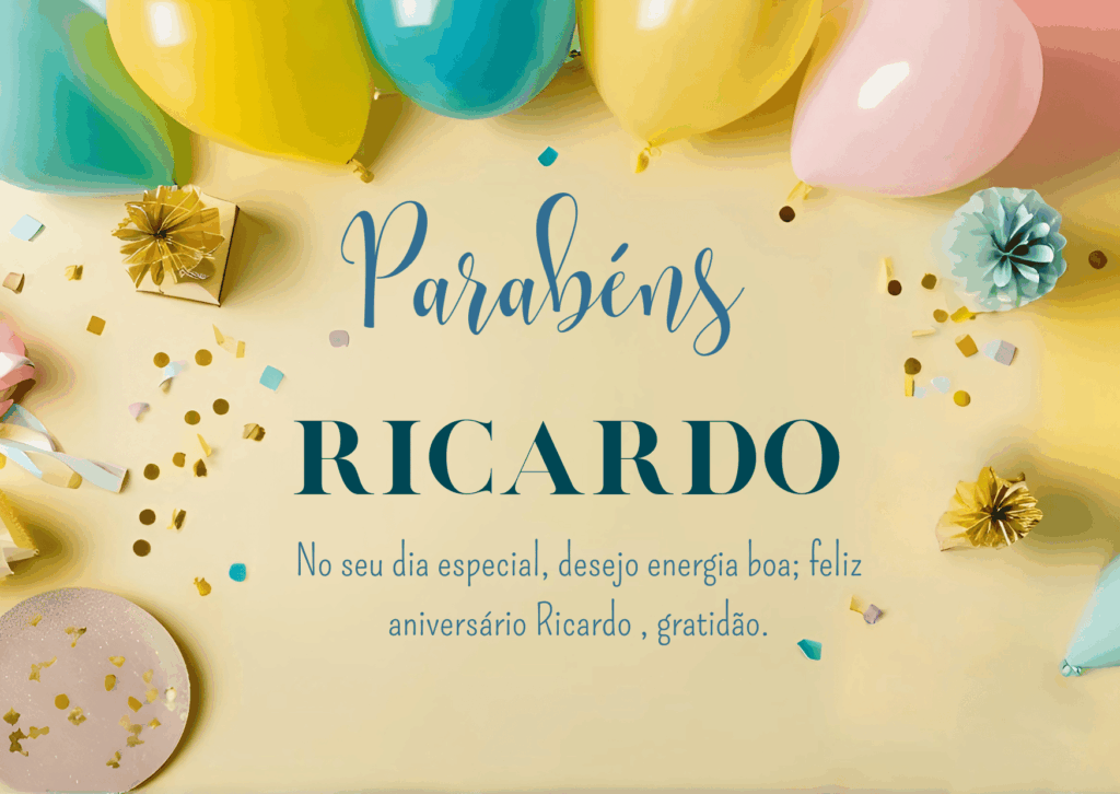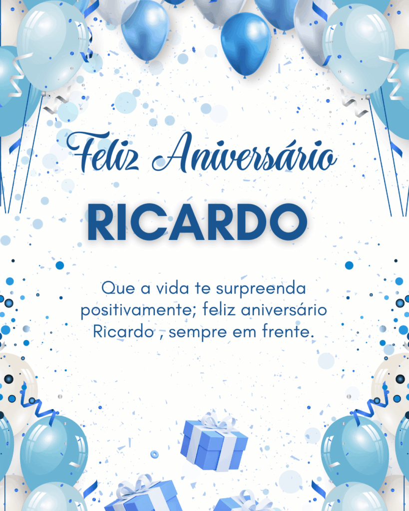 Ricardo, no seu aniversário eu te desejo um ano mais leve, com menos preocupações e mais motivos para comemorar. Que você tenha paz na mente, força para os desafios e alegria nas pequenas coisas do dia a dia. Feliz aniversário Ricardo!