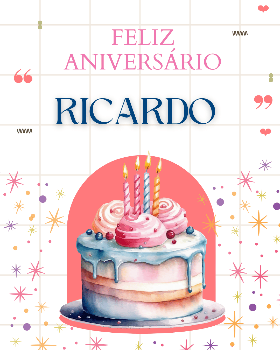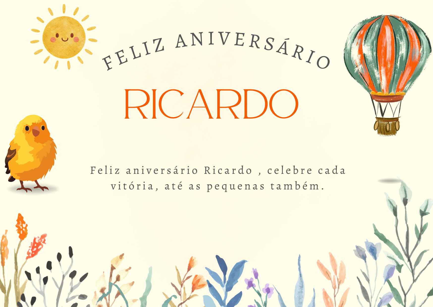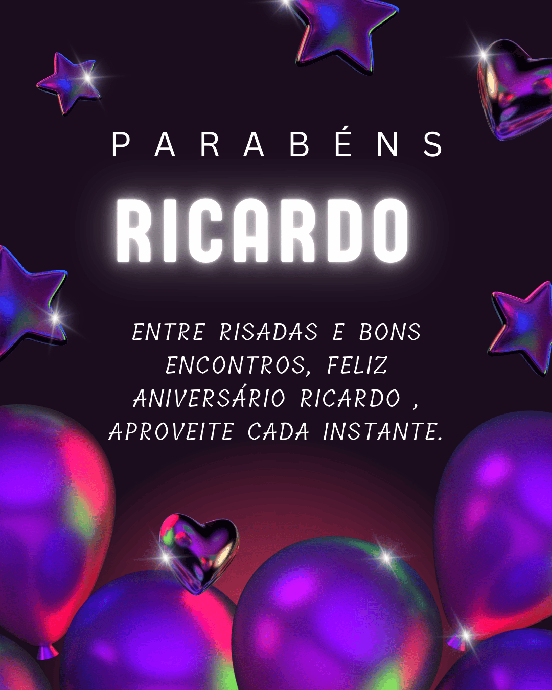 Ricardo, no seu aniversário eu te desejo um ano mais leve, com menos preocupações e mais motivos para comemorar. Que você tenha paz na mente, força para os desafios e alegria nas pequenas coisas do dia a dia. Feliz aniversário Ricardo!
