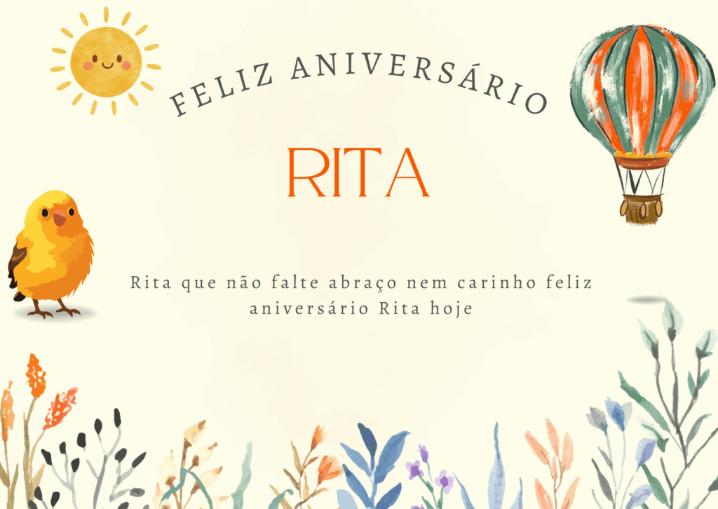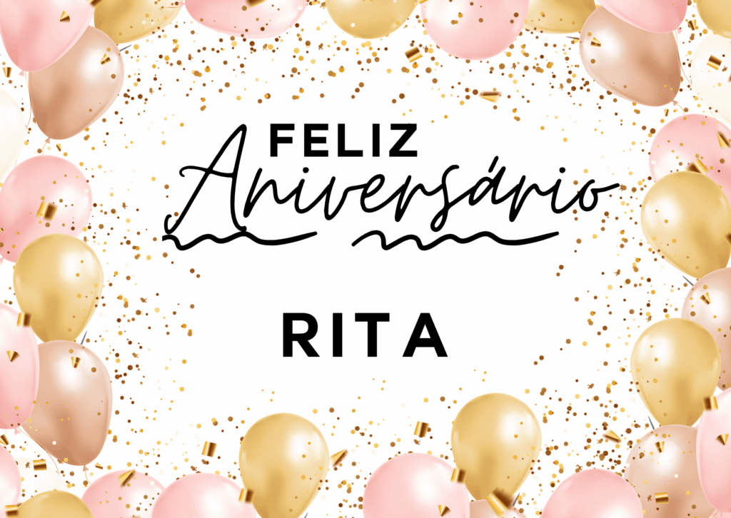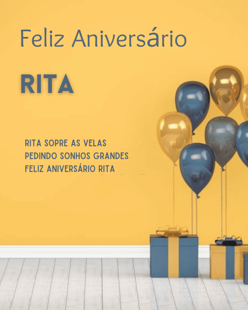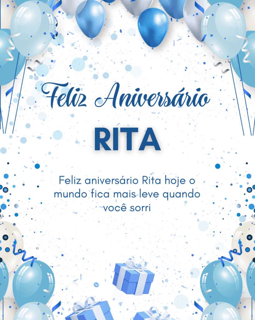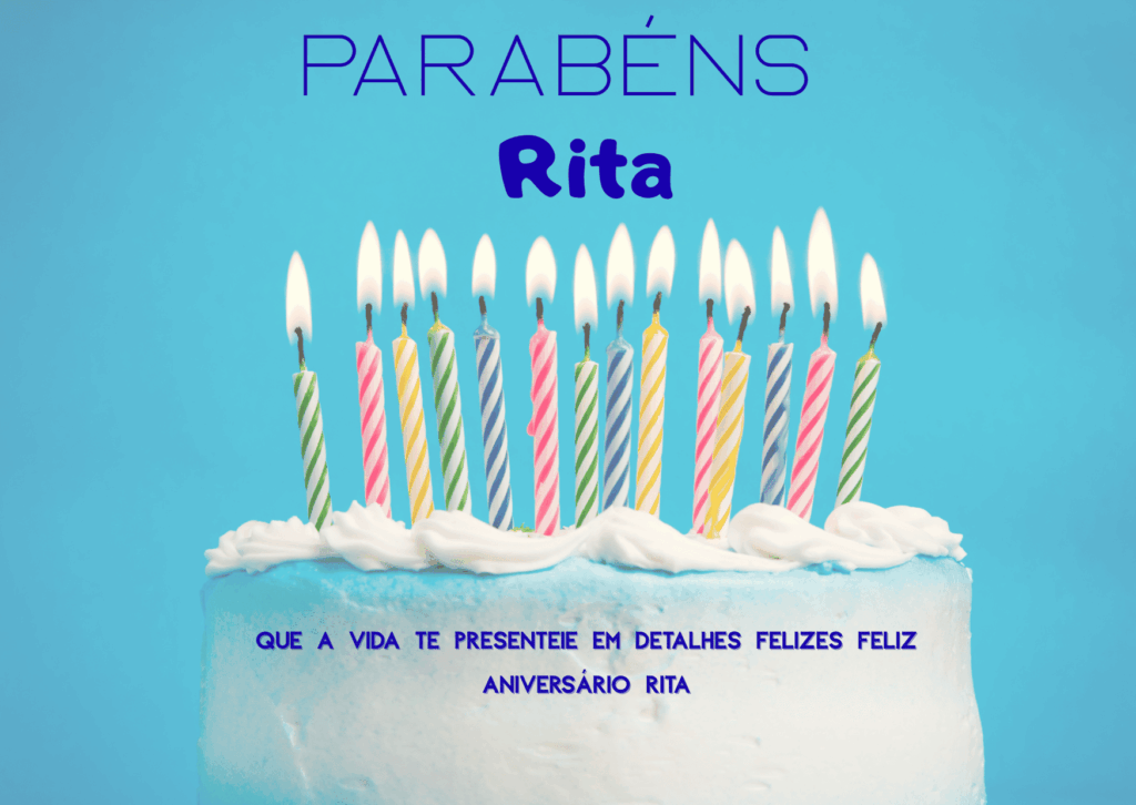 Rita, que alegria poder comemorar o seu aniversário! Você é uma pessoa marcante, com um jeito único de tornar a vida mais leve e mais bonita. Feliz aniversário Rita, que seu dia seja tranquilo, cheio de afeto e boas surpresas.