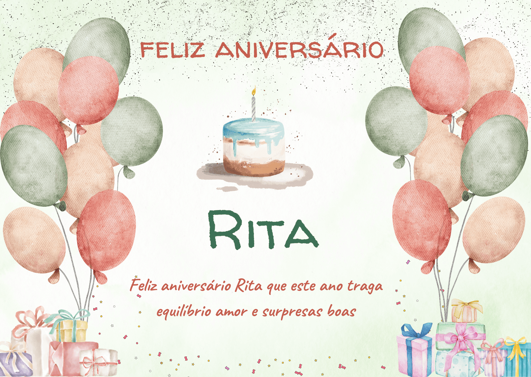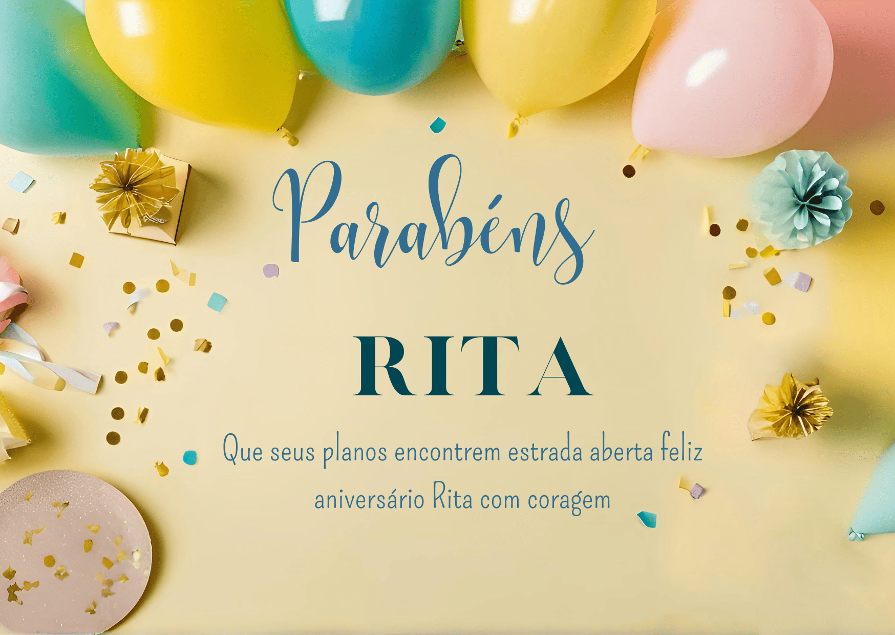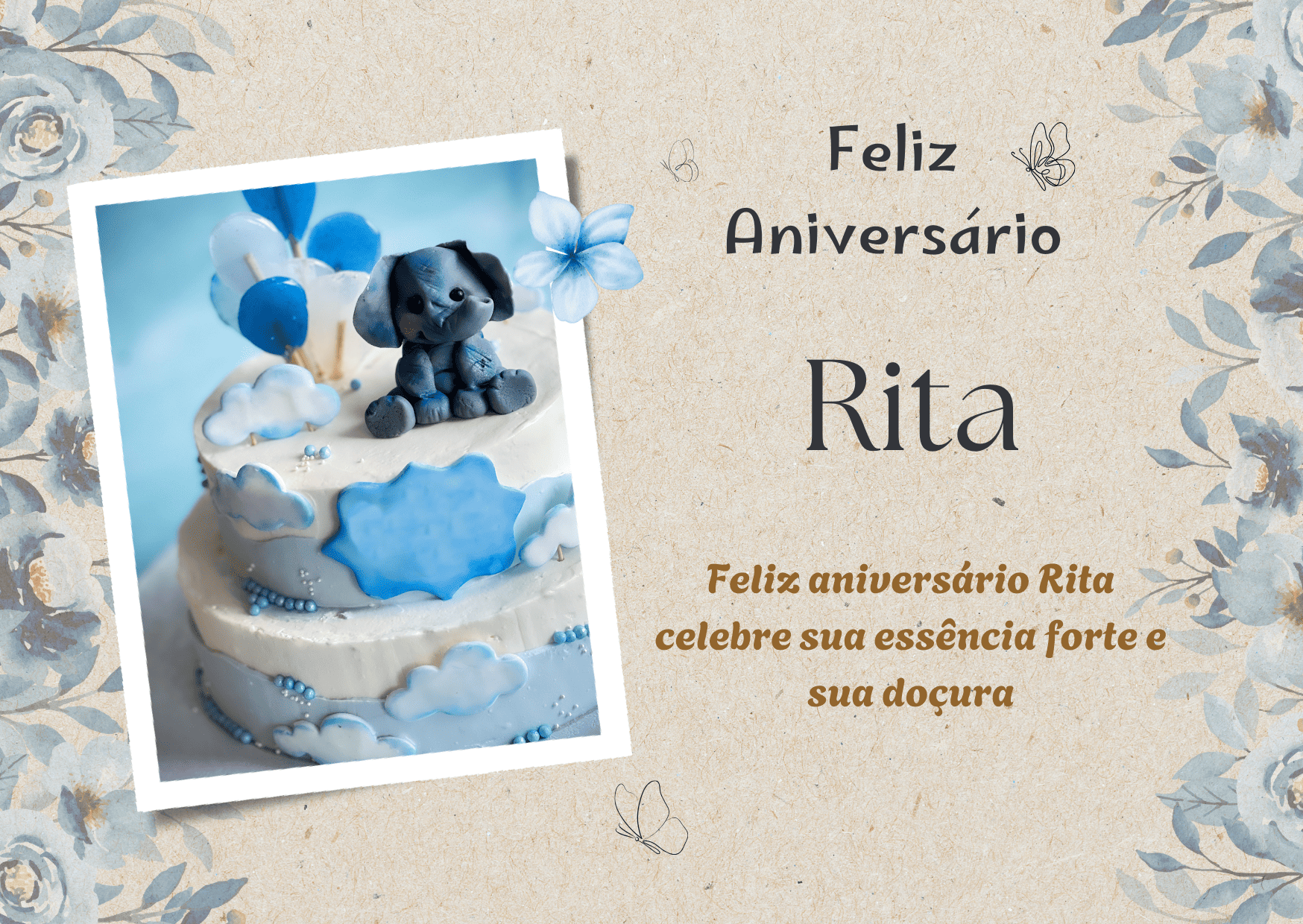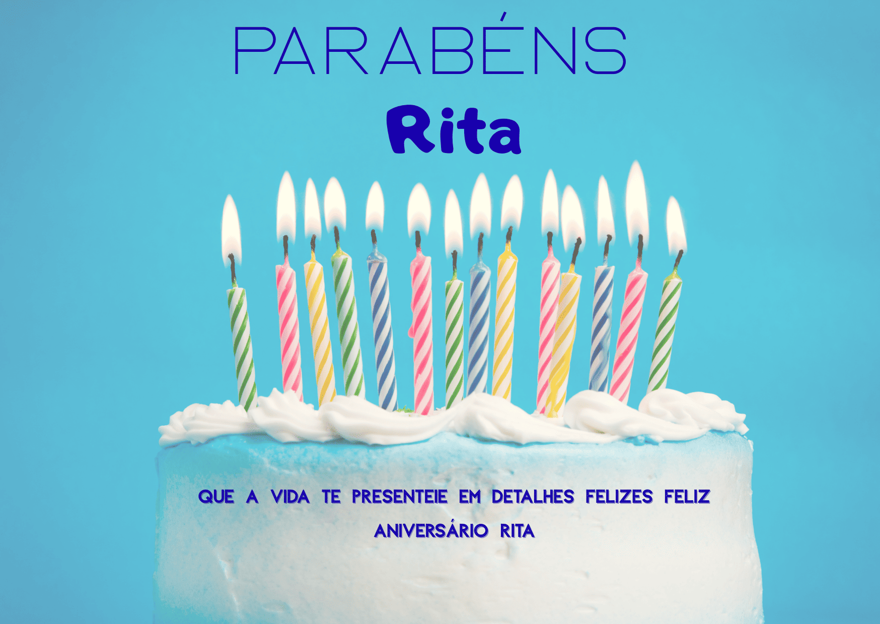 Rita, que alegria poder comemorar o seu aniversário! Você é uma pessoa marcante, com um jeito único de tornar a vida mais leve e mais bonita. Feliz aniversário Rita, que seu dia seja tranquilo, cheio de afeto e boas surpresas.
