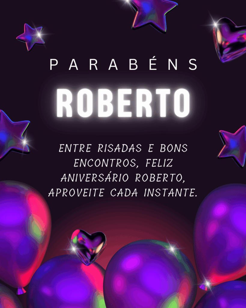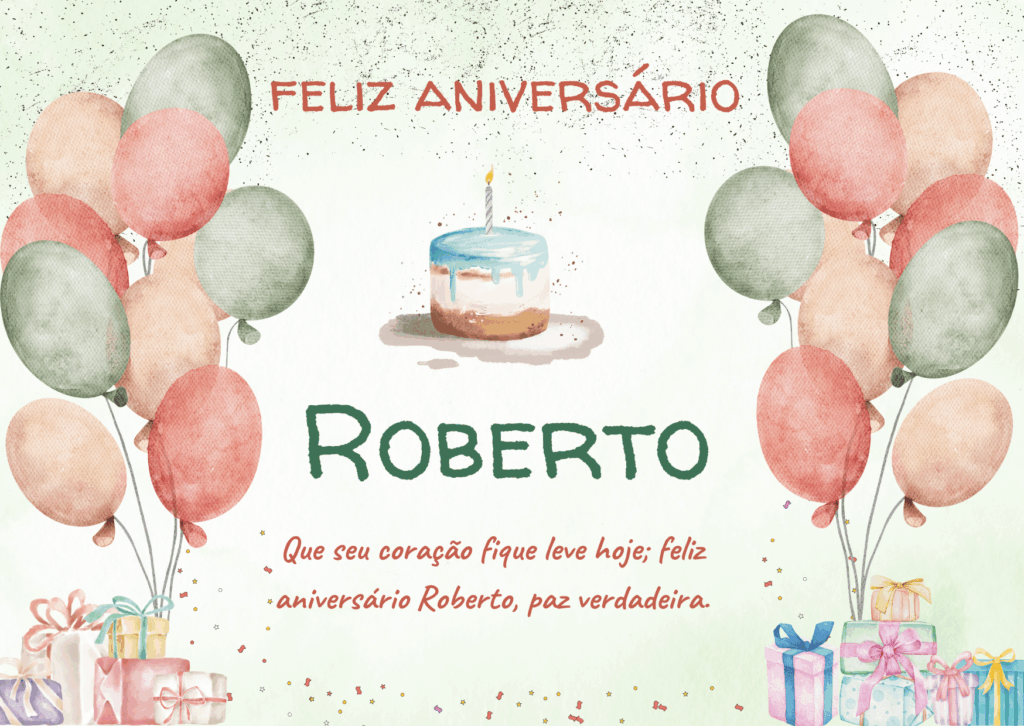 Roberto, no seu aniversário eu te desejo um ano mais leve, com menos preocupações e mais motivos para comemorar. Que você tenha paz na mente, força para os desafios e alegria nas pequenas coisas do dia a dia. Feliz aniversário Roberto!