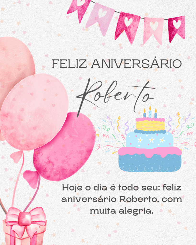 Roberto, hoje é o seu dia e eu quero te desejar um aniversário cheio de paz e boas energias. Você tem um jeito único de enfrentar a vida com firmeza e respeito, e isso inspira quem convive com você. Feliz aniversário Roberto, que seu dia seja leve, com boas surpresas e muita alegria.
