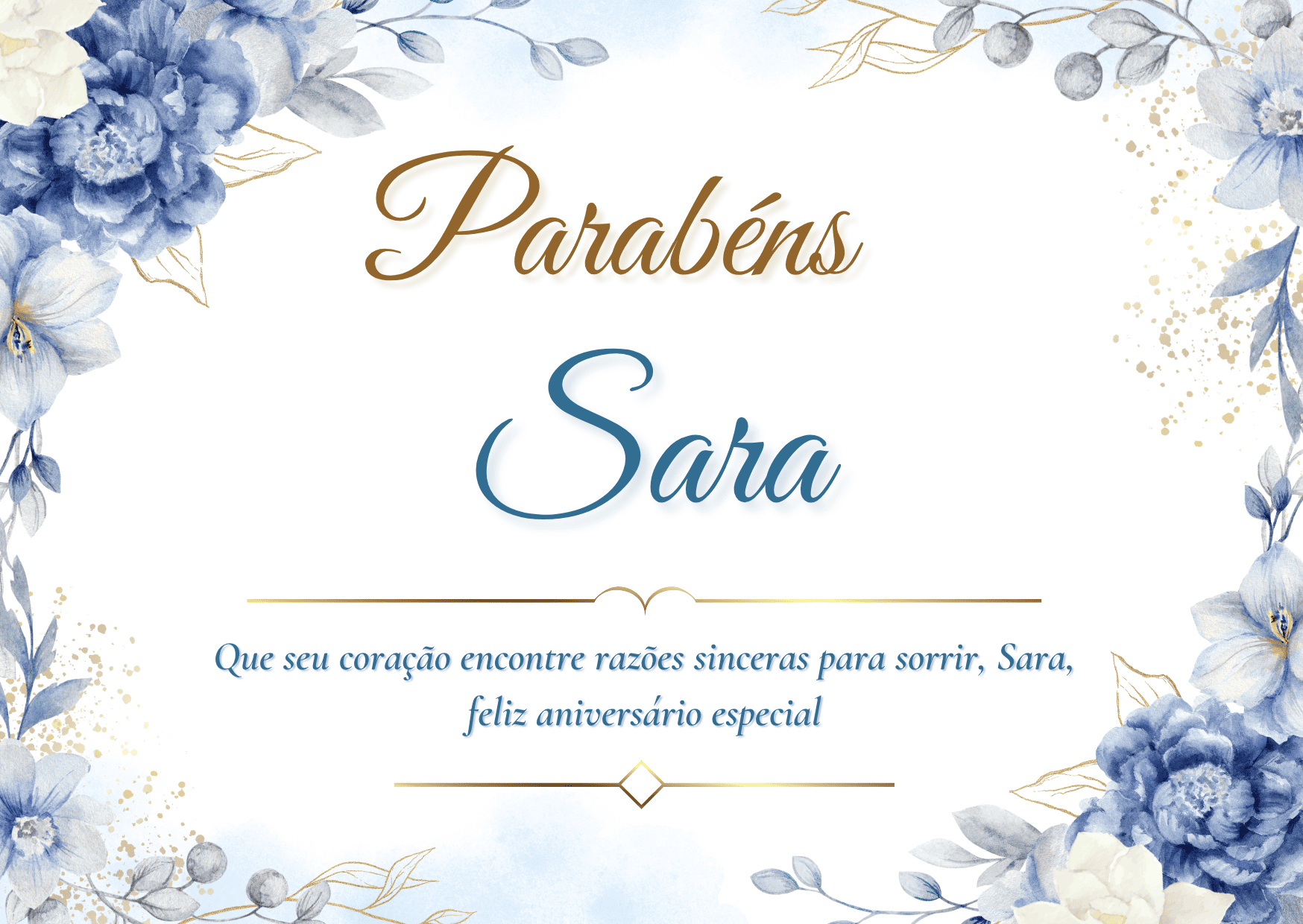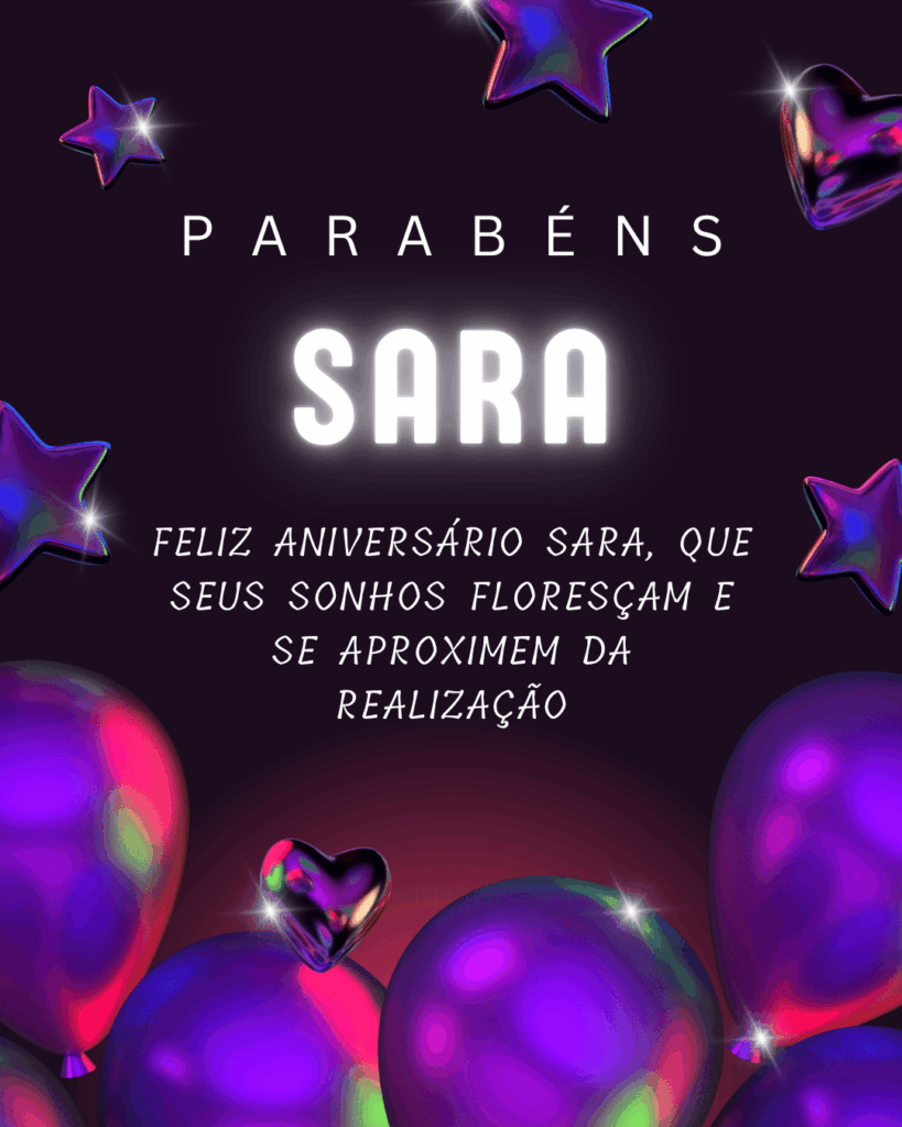 Parabéns, Sara! Que o feliz aniversario Sara traga boas vibrações, pessoas queridas ao redor e um mar de alegria para o seu coração.